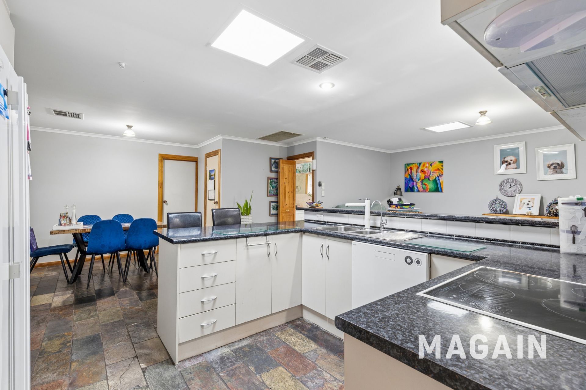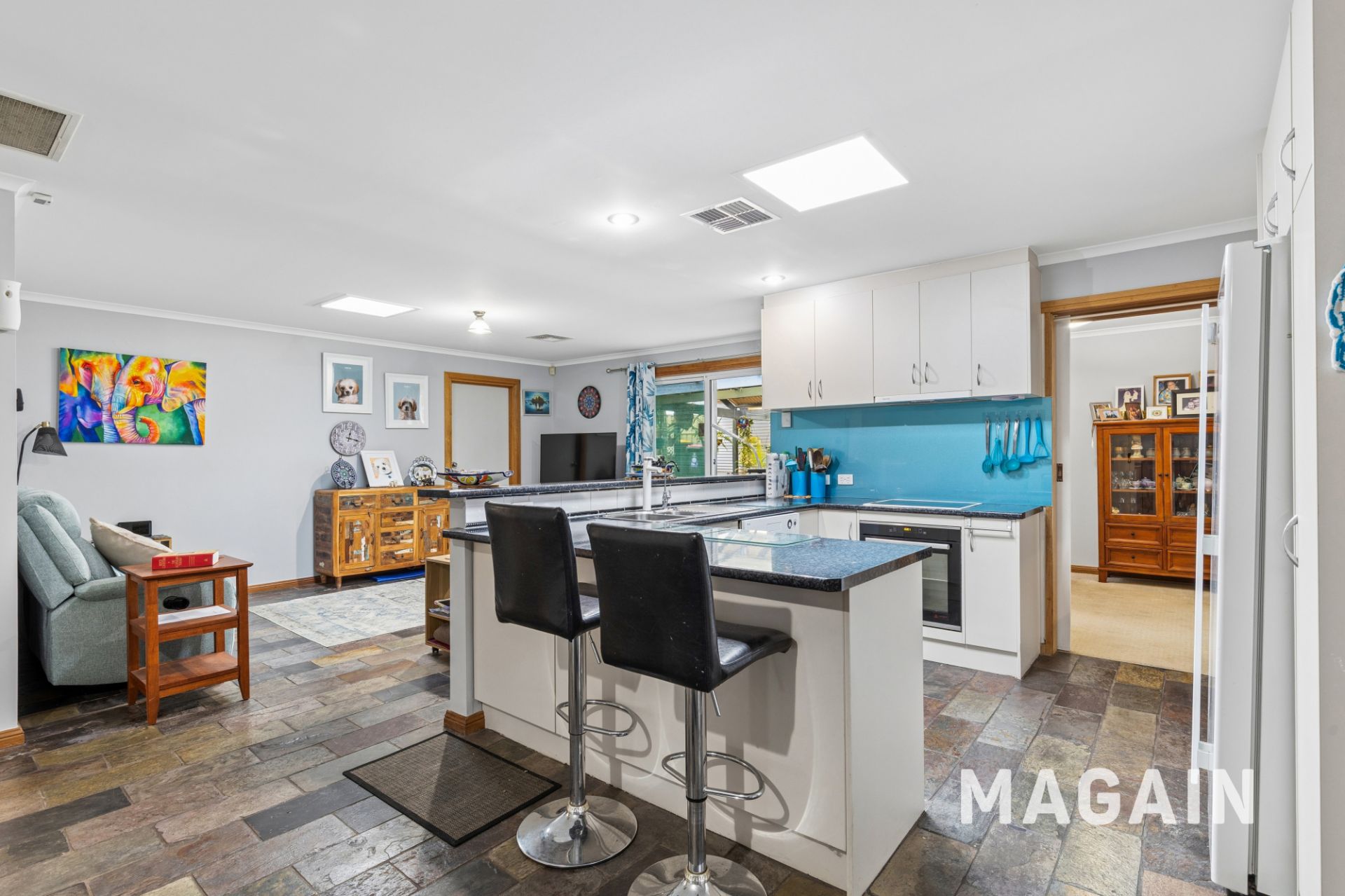 The kitchen showcases abundant light cabinetry paired with striking dark benchtops, creating a timeless and practical workspace. Well-appointed with quality appliances, including a four-burner electric cooktop with rangehood, oven, and dishwasher, it's designed to make everyday cooking and cleaning a breeze. A walk-in pantry, dedicated fridge recess, double sink, and breakfast bar/serving bench further enhance functionality, offering the perfect setting for casual dining and effortless entertaining.