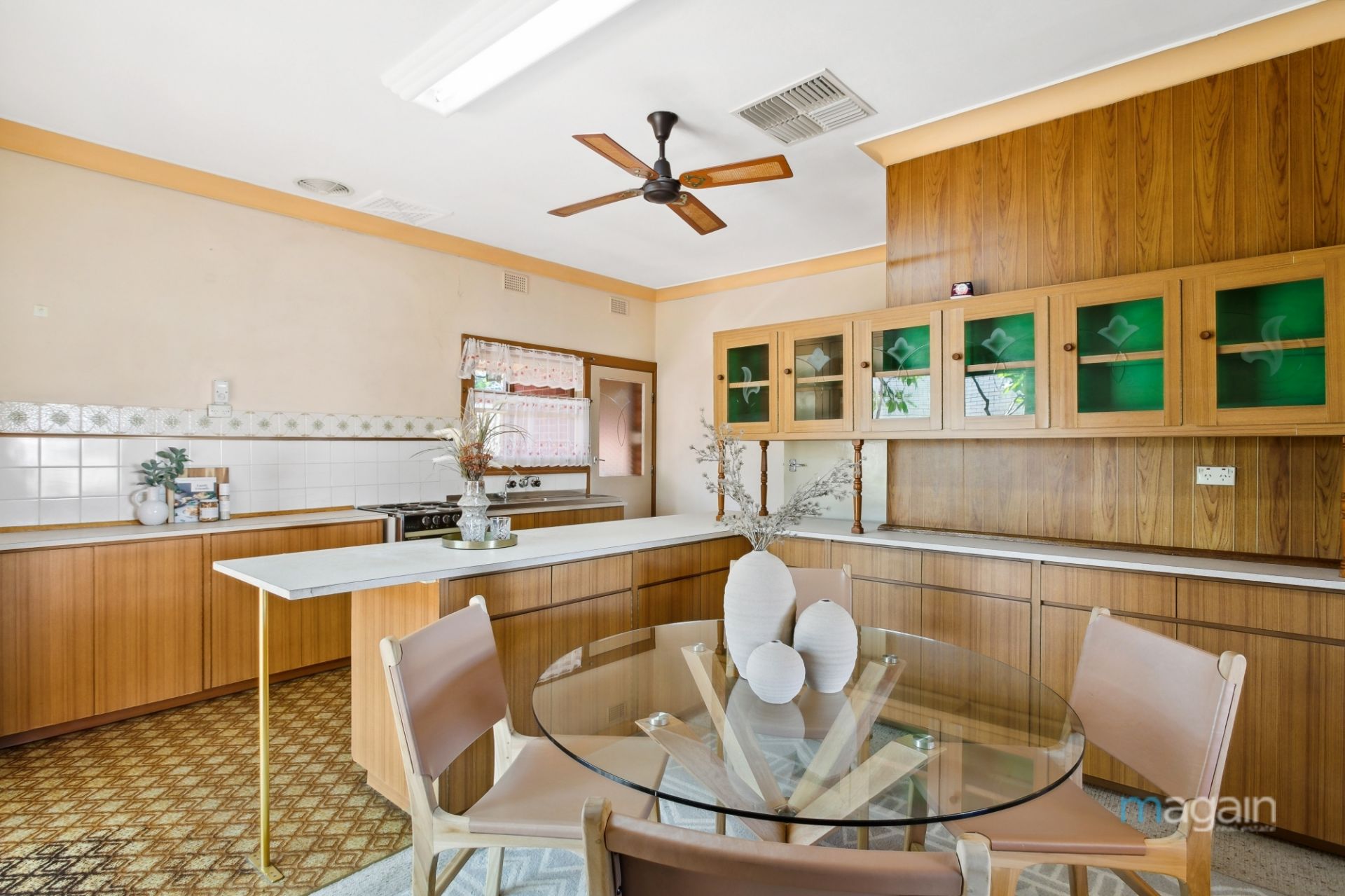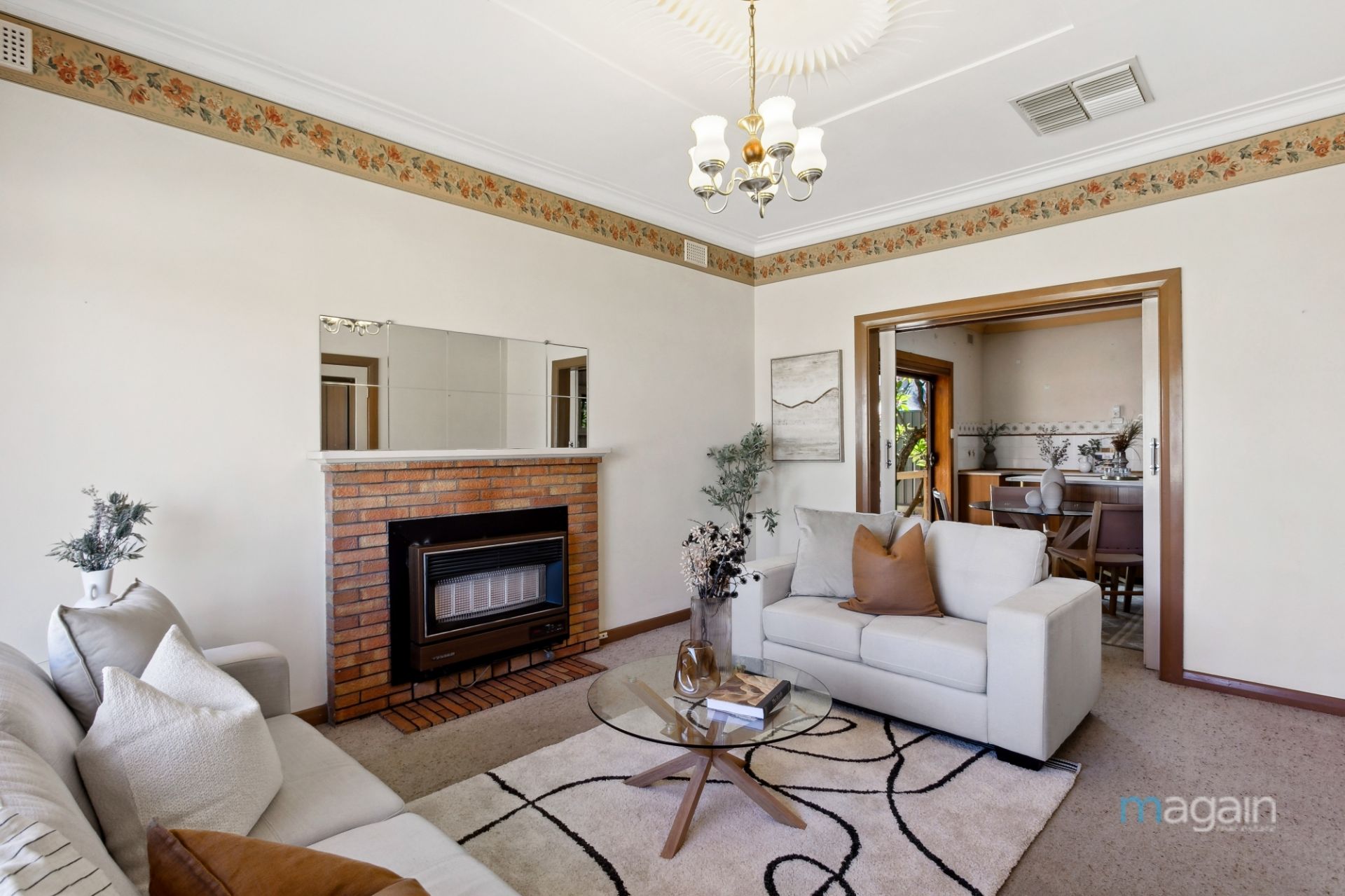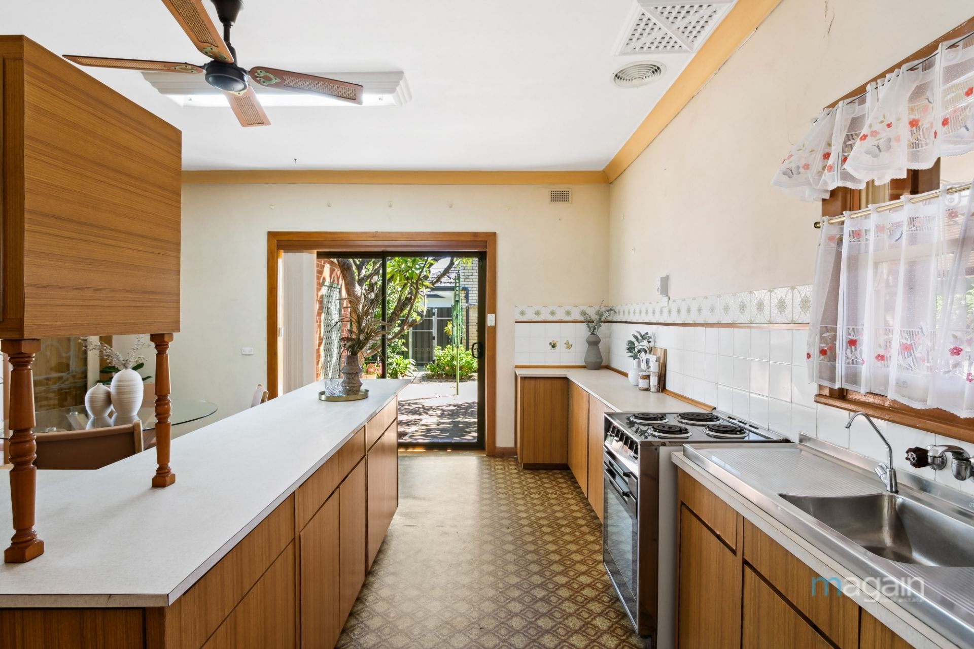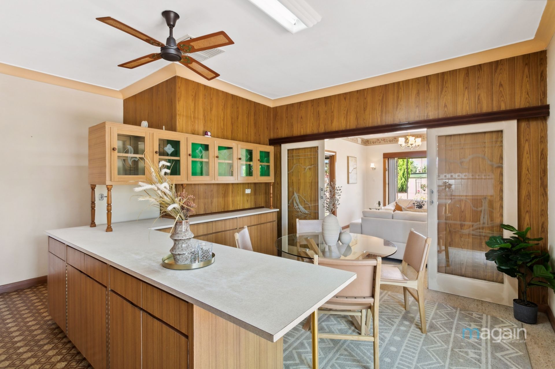 Upon entering, you're welcomed by a formal lounge bathed in natural light streaming through a generously proportioned window. This appealing space seamlessly connects to a casual meals area and an original kitchen boasting ample cupboard space. Glass sliding doors from the kitchen open up to the delightful rear yard.