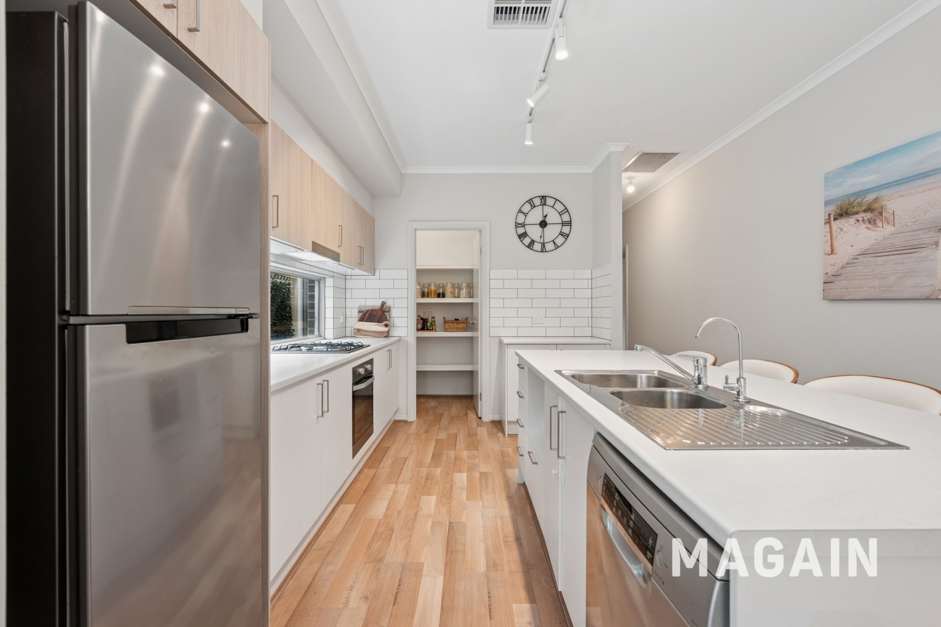 The kitchen showcases a sleek, contemporary design that balances style with functionality. Ample cabinetry, crisp white countertops, and a classic subway tile splashback create a timeless backdrop ready to suit any décor. Premium stainless-steel appliances, including a 4-burner gas cooktop with rangehood, oven, and dishwasher, make cooking and cleanup effortless. A spacious walk-in pantry, dedicated fridge nook, double sink with PuraTap, and a versatile breakfast bar further enhance this space, making it ideal for both everyday living and entertaining.