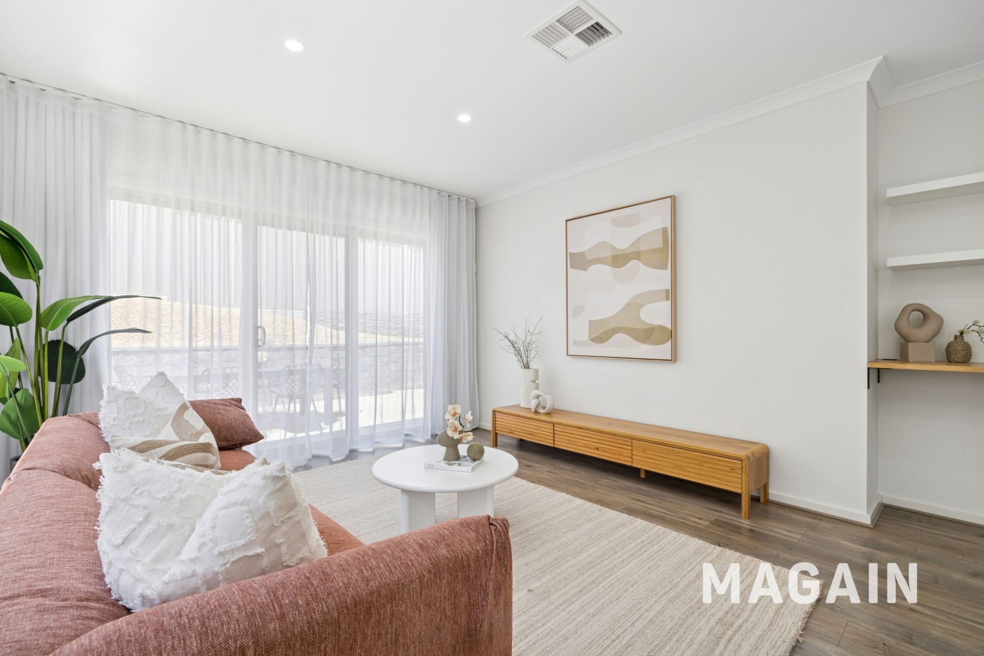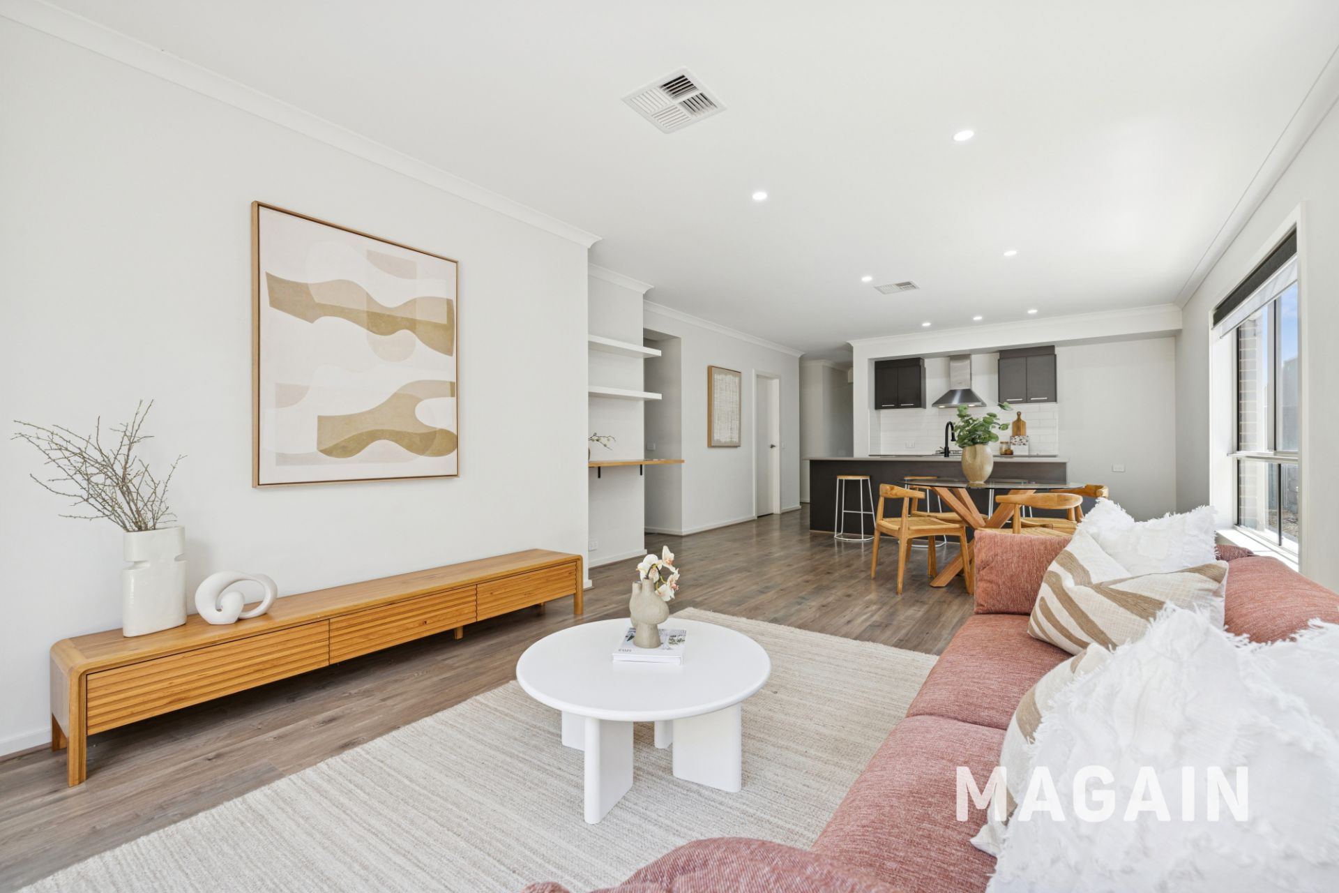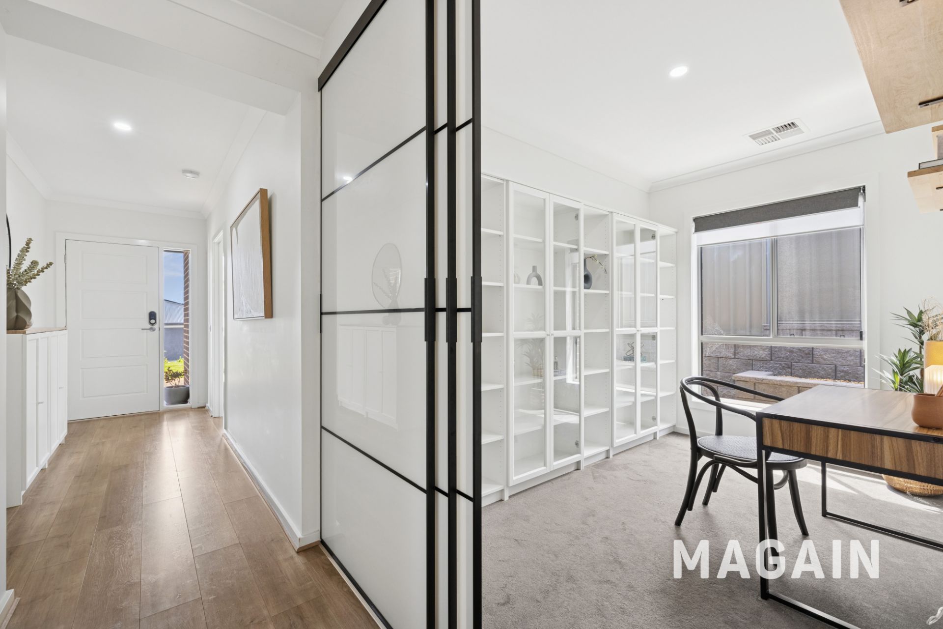 A home with a sophisticated interior with large sun-drenched picture windows, quality double roller blinds, a gossamer floor-to-ceiling lounge room curtain, timber-look floors, crisp white walls, grey toned carpets, LED down-lights, an artisan pocket sliding door and zoned ducted reverse cycle air-conditioning.