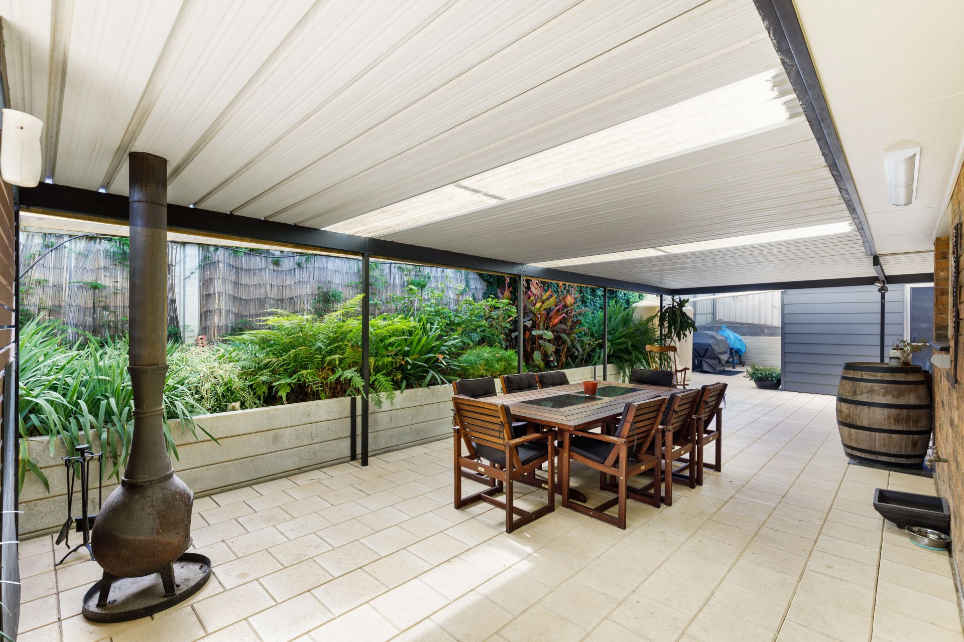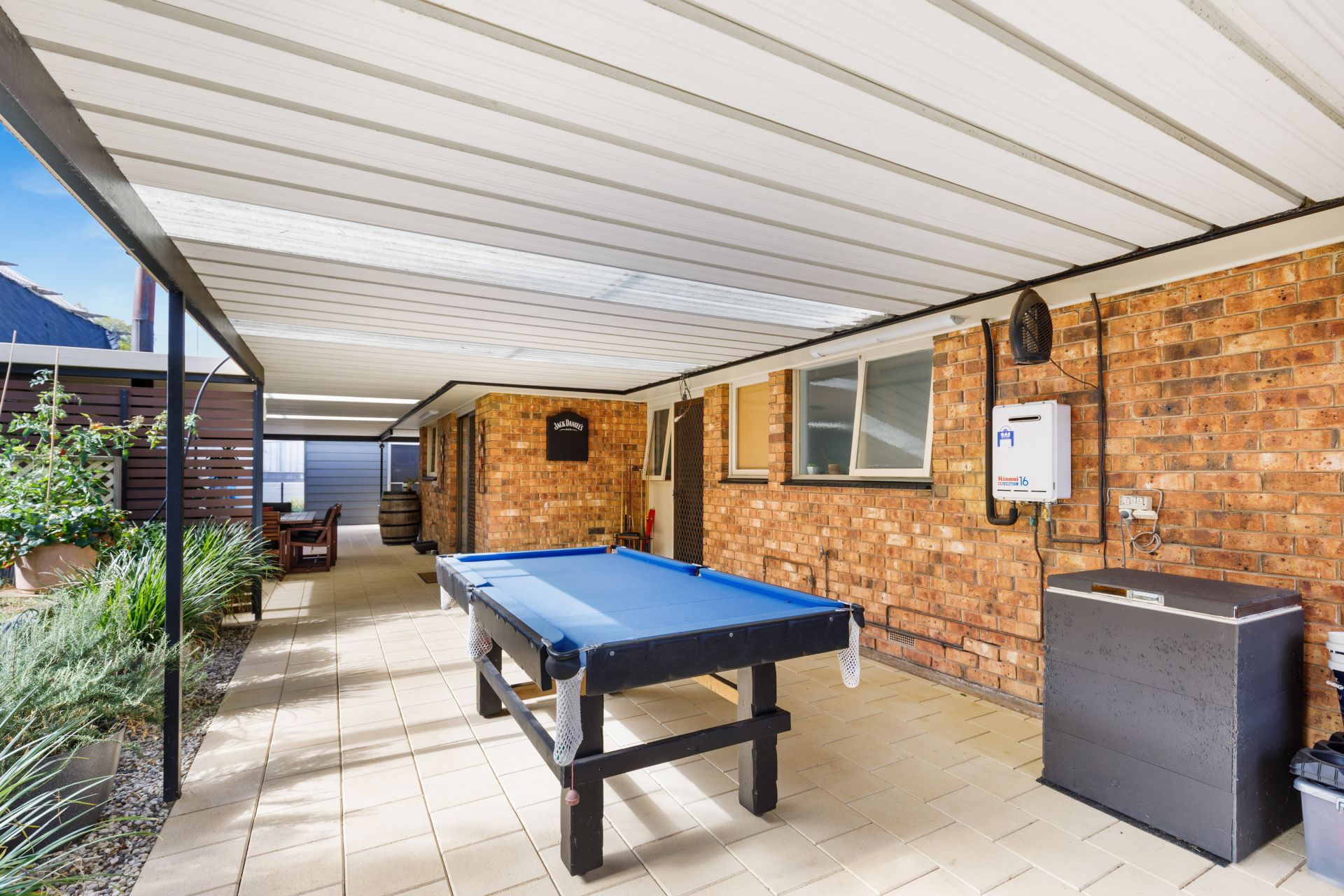 Glass sliding doors from the kitchen/meals provide a stunning view and seamless access to an enormous paved entertaining area wrapping around the entire back of the house, with a skillion roof pergola, the great sized space perfect for those large family gatherings and entertaining friends. Here you will also find a beautifully designed split-level yard with lovely established garden beds and access to an external rumpus room, fully lined and with an air conditioning wall unit, it would make a fantastic teenage retreat or home office.