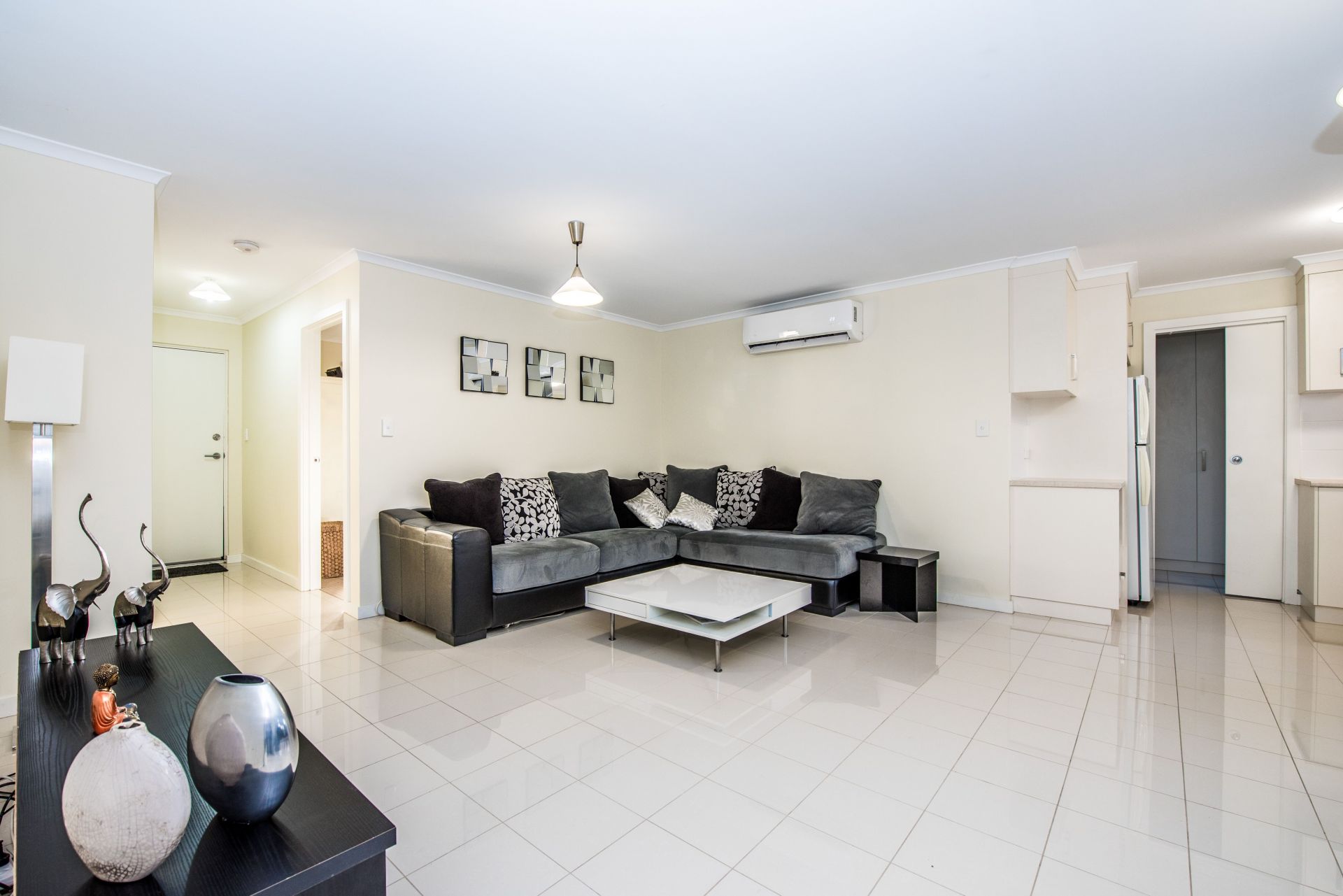 > the heart of the home is open plan featuring, tiles for ease of cleaning, split system heating/cooling, and is the perfect space to relax or play with the kids