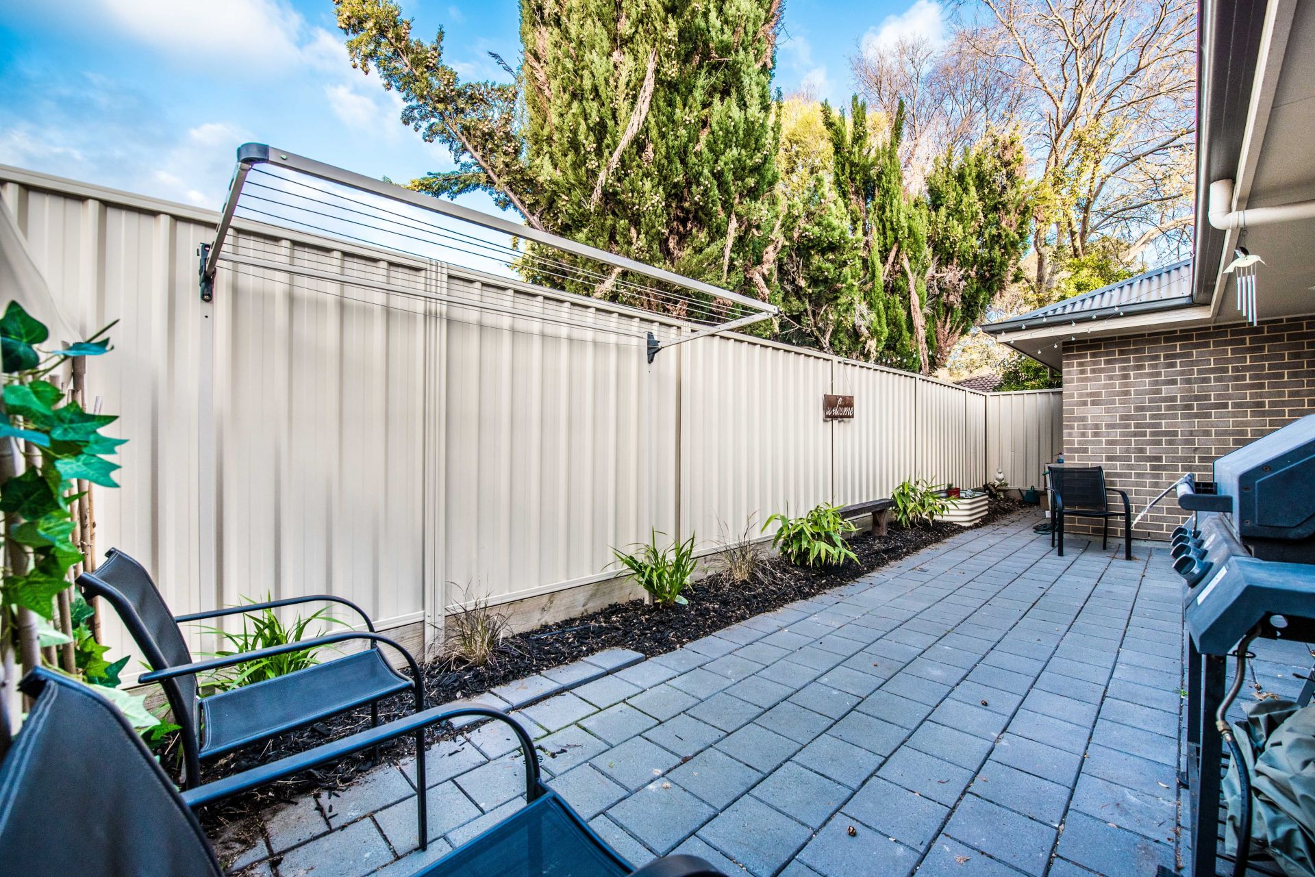> at the rear of the home is a paved area with a small garden bed, perfect for a table and chair setting, bbq and your friends!