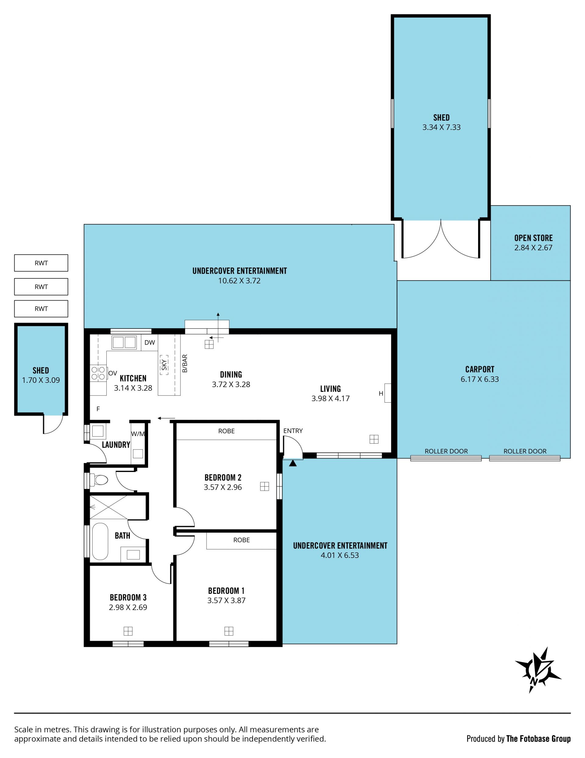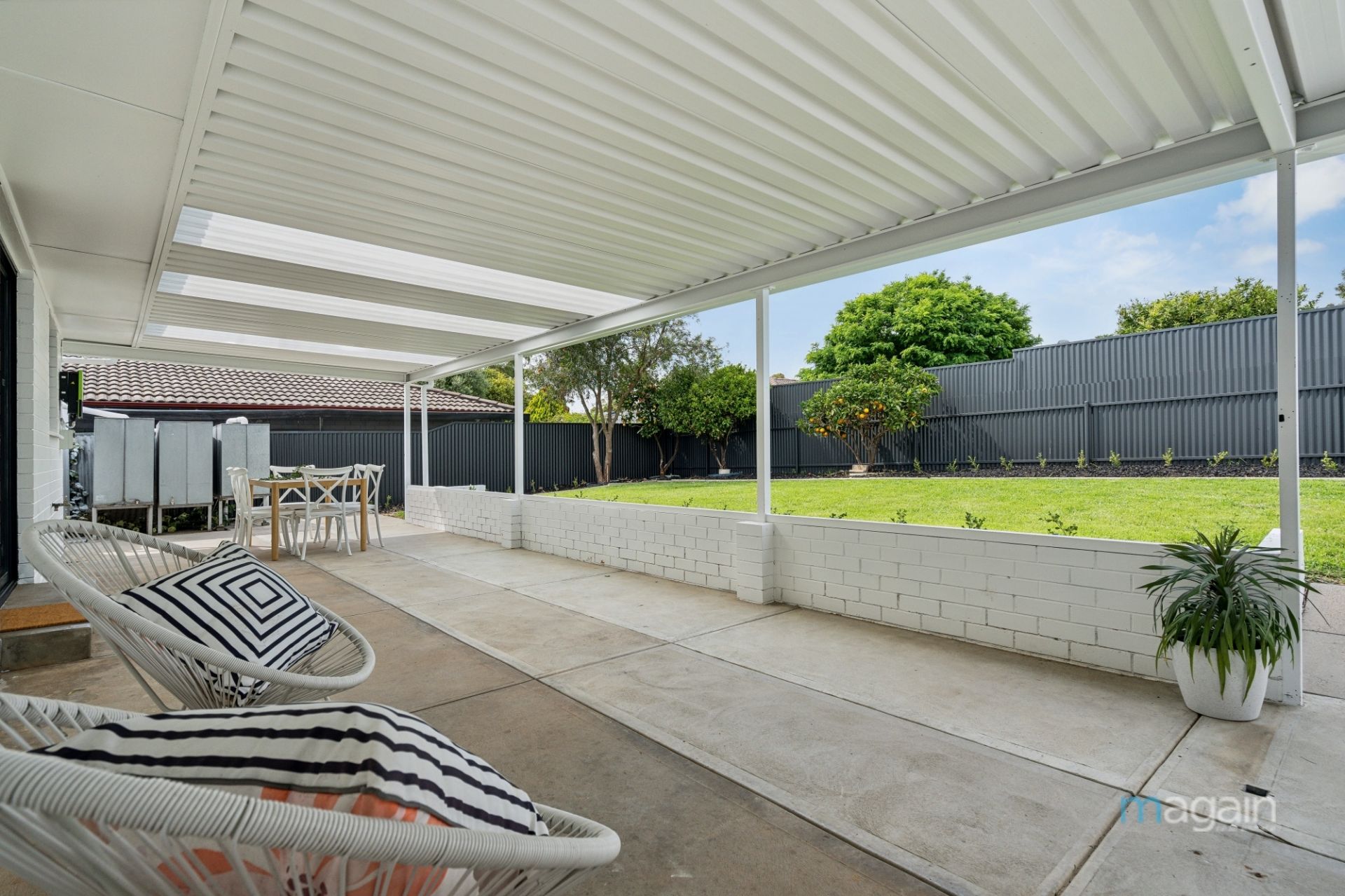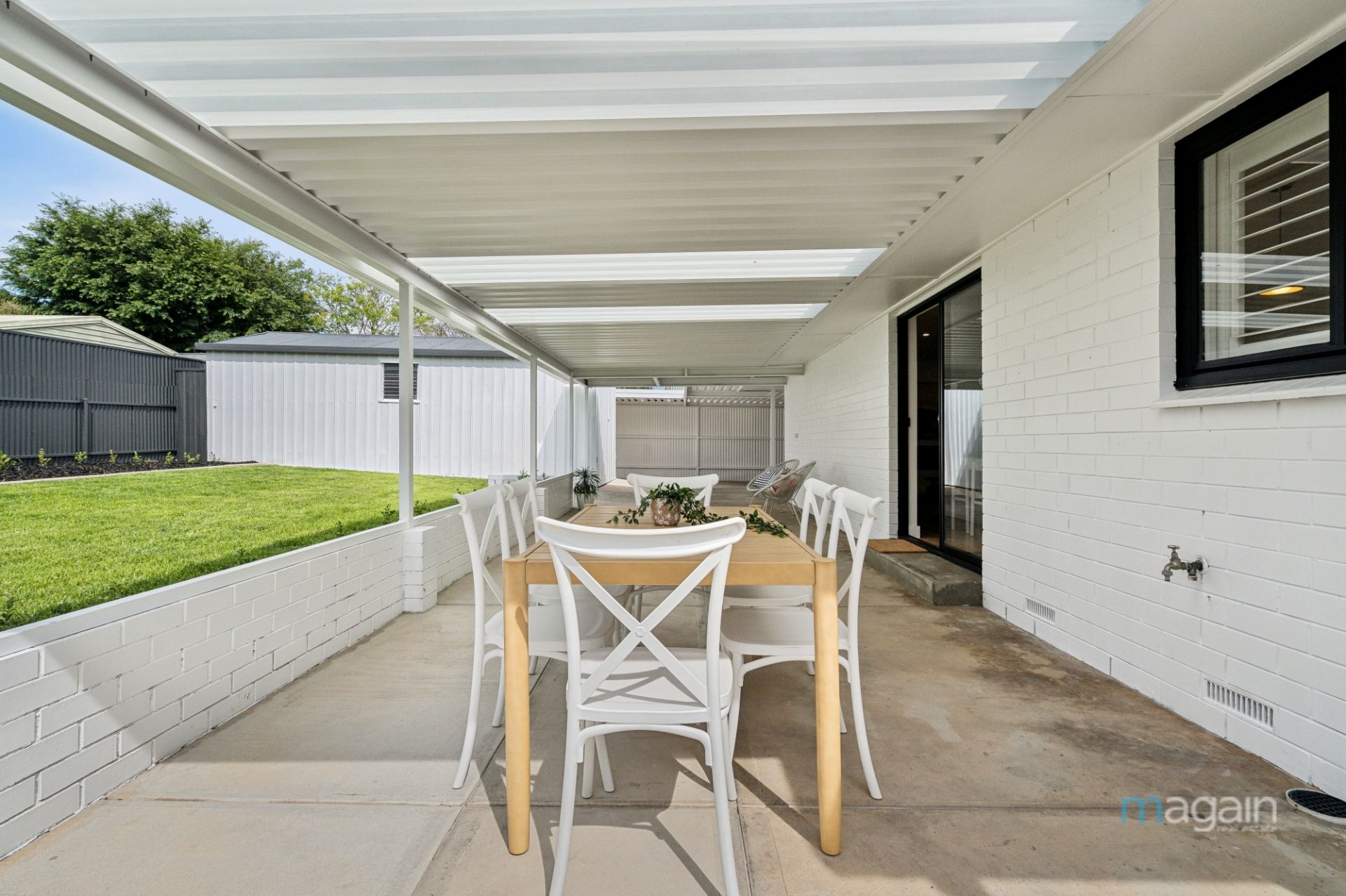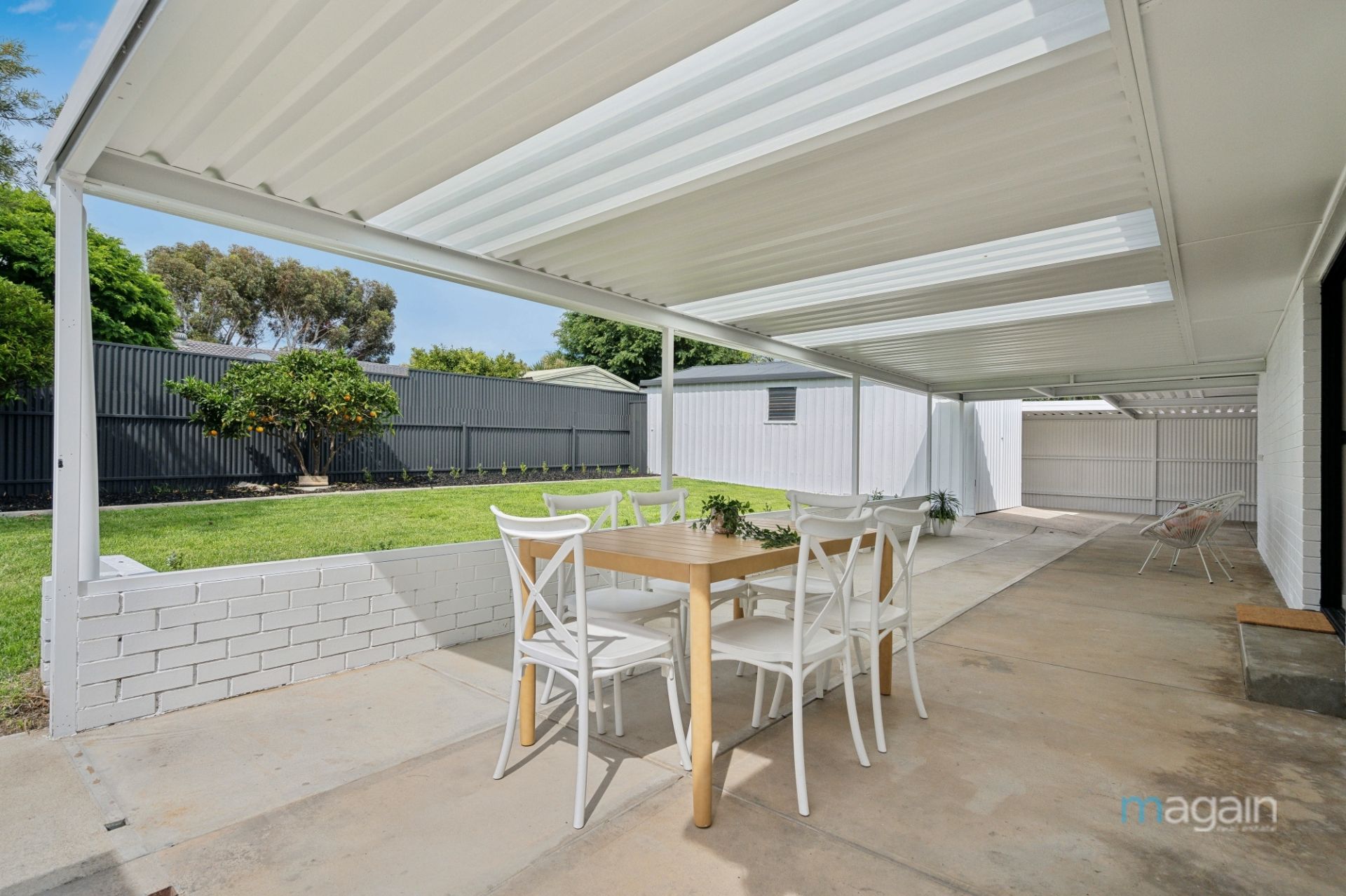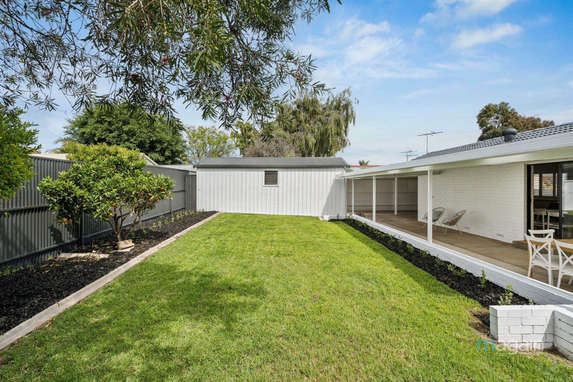 For those who love to entertain, glass sliding doors from the living area lead to a spacious undercover entertaining area, spanning the width of the home and sheltered by a skillion roof pergola. A split-level design takes you to a neatly manicured lawn surrounded by newly planted shrubs, which will flourish over time, creating a picturesque outdoor retreat. The backyard also features a couple of fruit trees, a large shed/garage with drive-through access from the front carport, rainwater tanks, and an additional small shed.