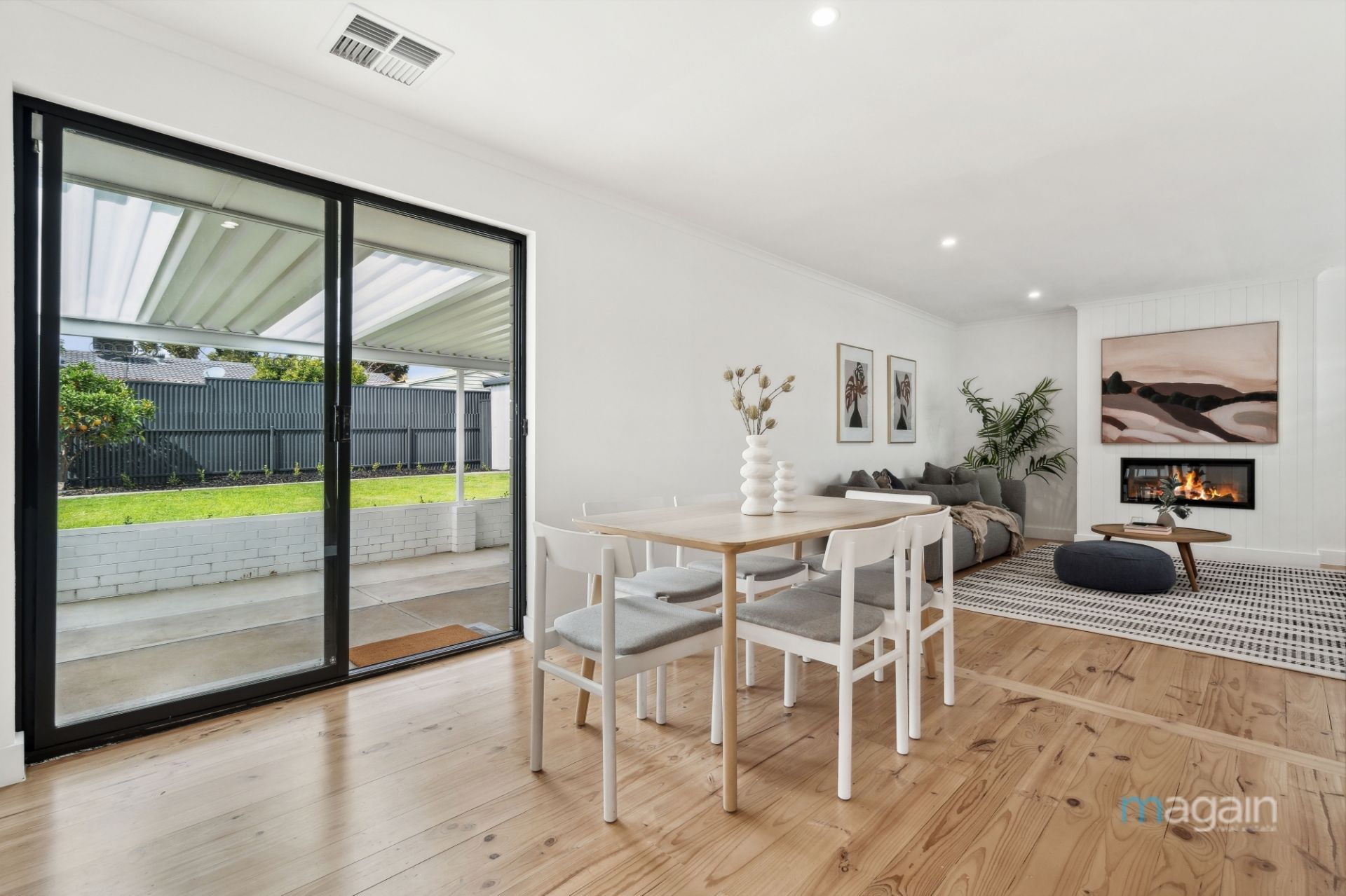 This stunning renovated home in Reynella East boasts undeniable kerbside appeal, with its freshly painted modern white brick façade and neatly landscaped front yard. As you approach the entrance, a charming partially enclosed porch provides the perfect spot to enjoy your morning coffee or relax outdoors. Step inside to be greeted by an open-plan lounge, dining, and kitchen area, where timber flooring, crisp white interiors, and plantation shutters set the tone for modern elegance. The electric fireplace adds a cosy touch, perfect for those chilly evenings.