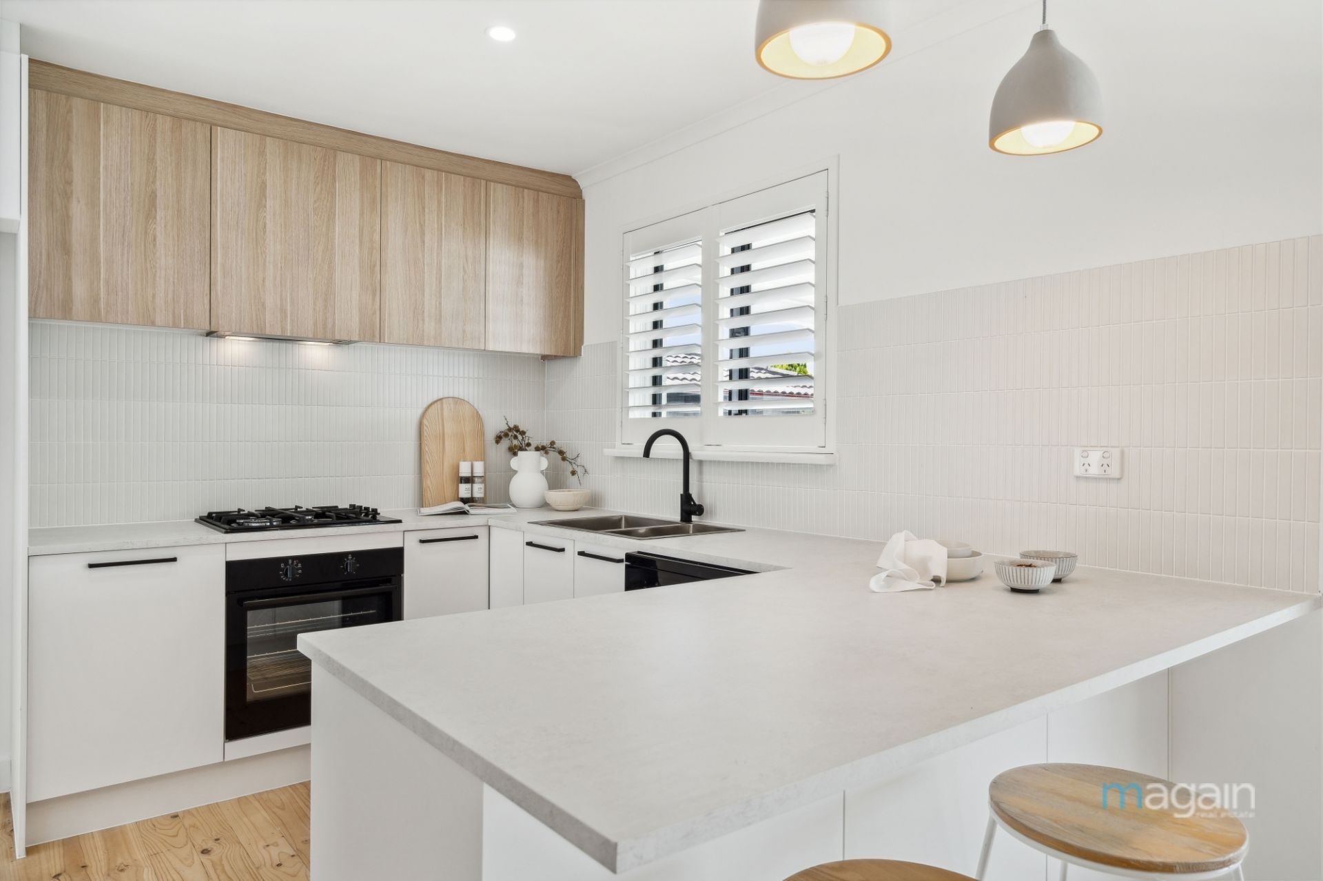 The brand-new kitchen is a standout feature, showcasing sleek black fittings, a dishwasher, a gas cooktop, and a breakfast bar ideal for casual meals or entertaining guests. Down a private hallway, you'll find three generously sized bedrooms, with built-in robes in bedrooms one and two, all equipped with plantation shutters. The stylishly renovated main bathroom offers a freestanding bath, exquisite feature tiling, and a separate toilet for convenience.