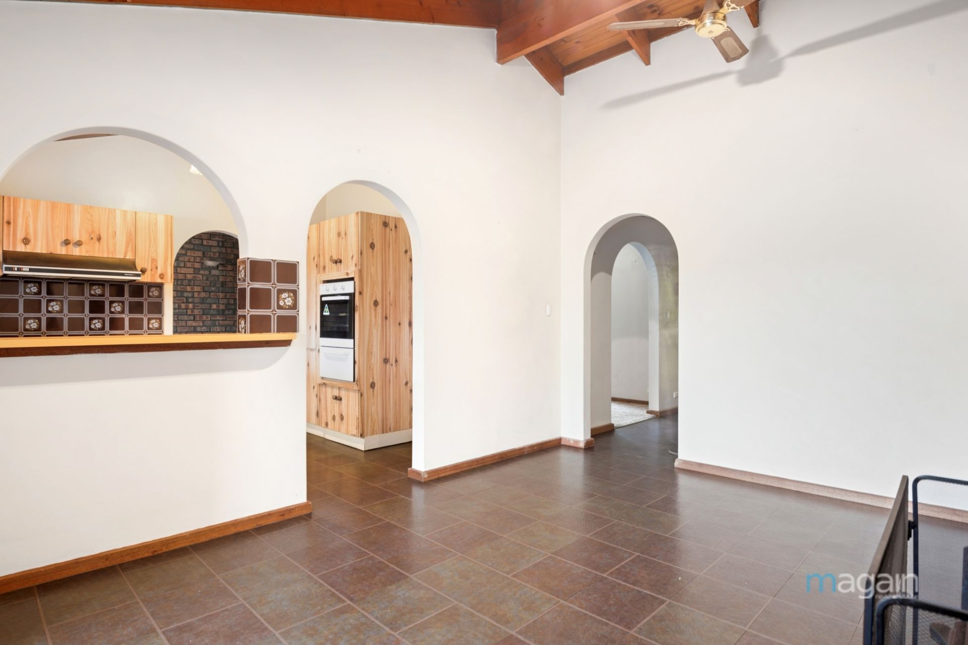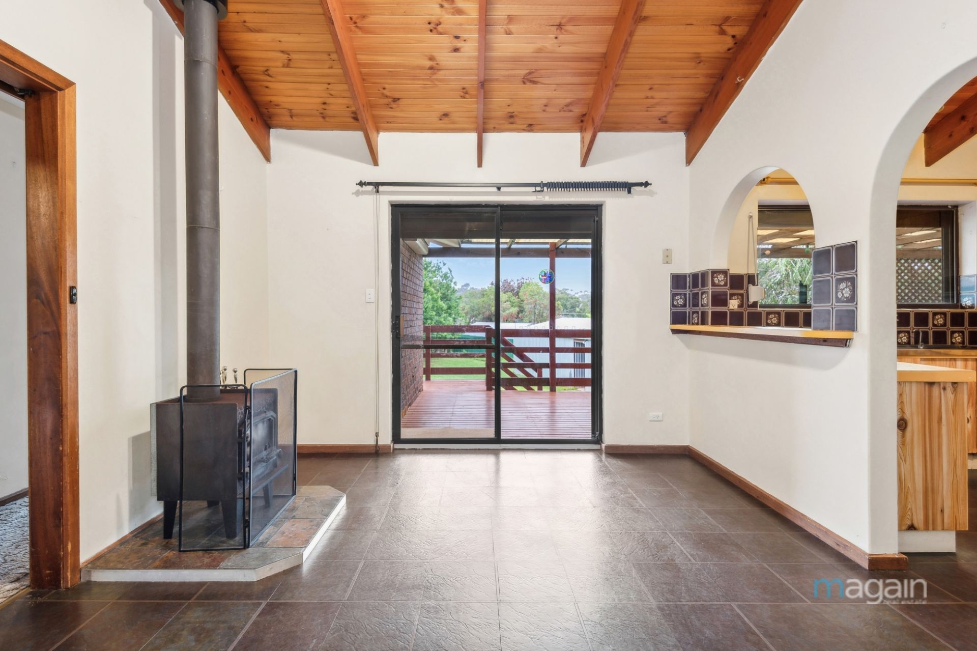 Step into this family home and you'll find a welcoming formal lounge and dining with stunning raked ceilings, adjacent to the original kitchen, featuring plenty of cupboard and preparation space, and a servery window connecting to a second living area.