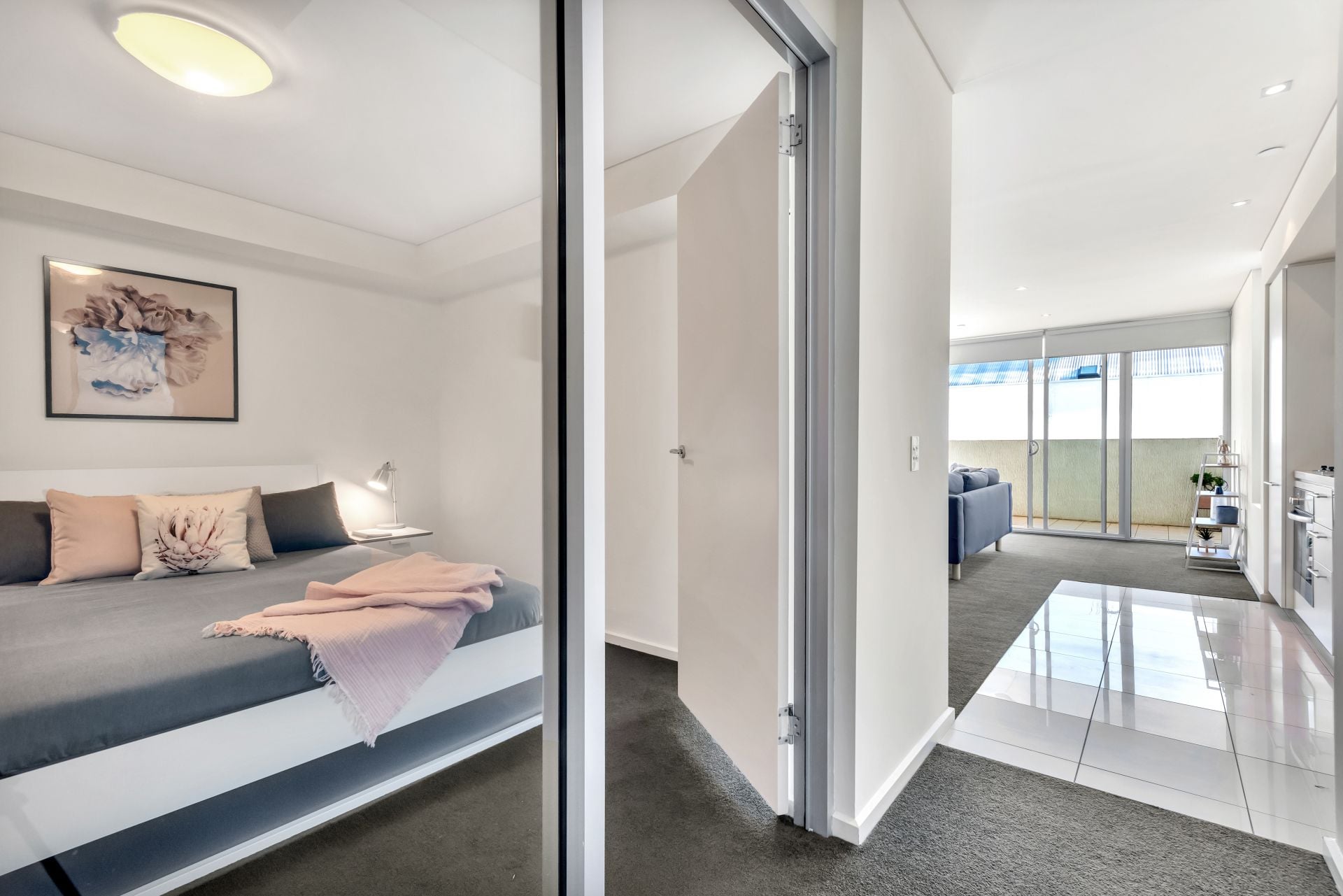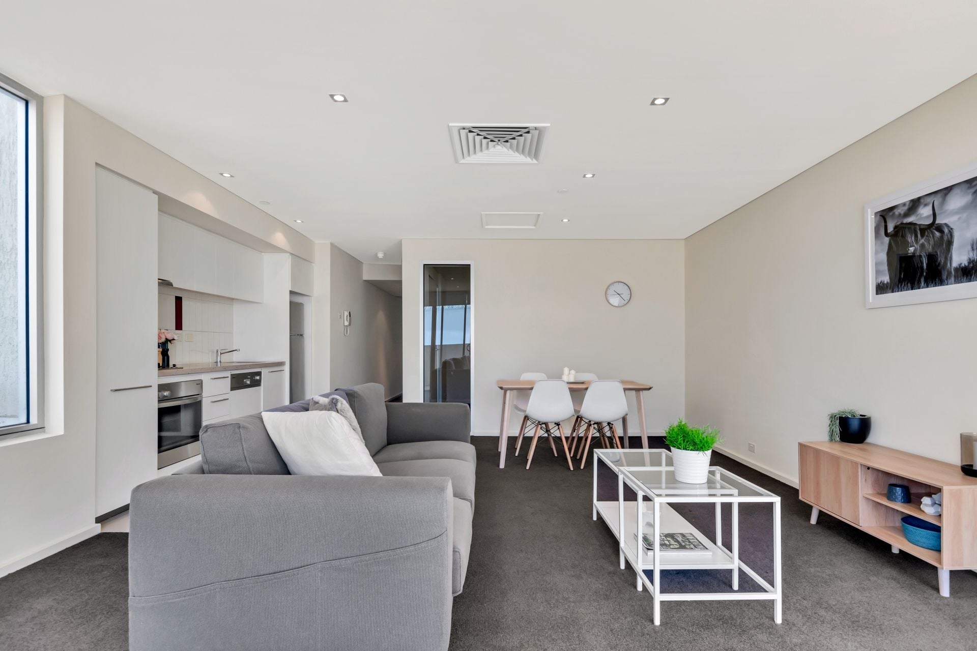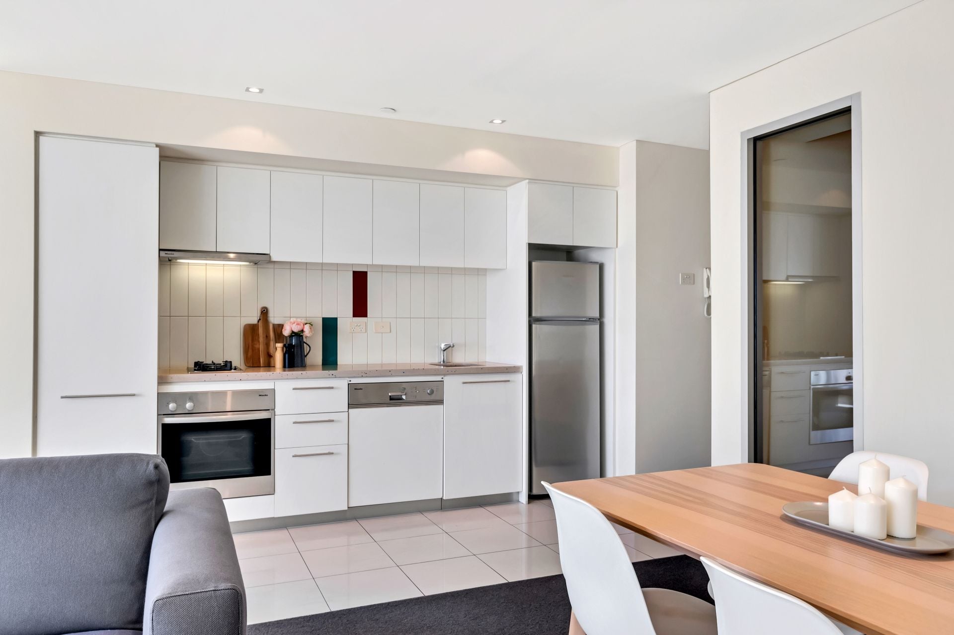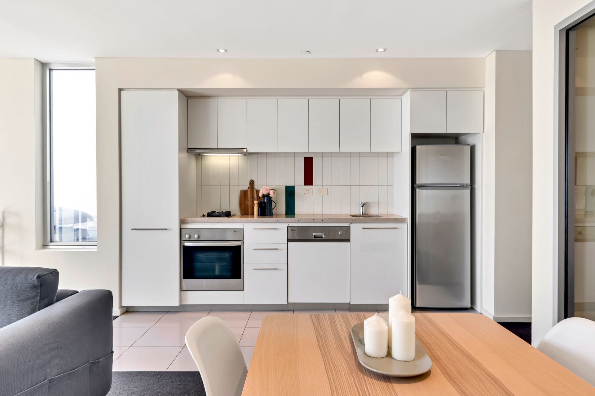 This conveniently situated apartment features 1 generous bedroom, 1 bathroom and a modern open plan living, kitchen and dining space. The modern kitchen and dining space features luxury finishes including Miele appliances, an integrated dishwasher, and gas cooktop.