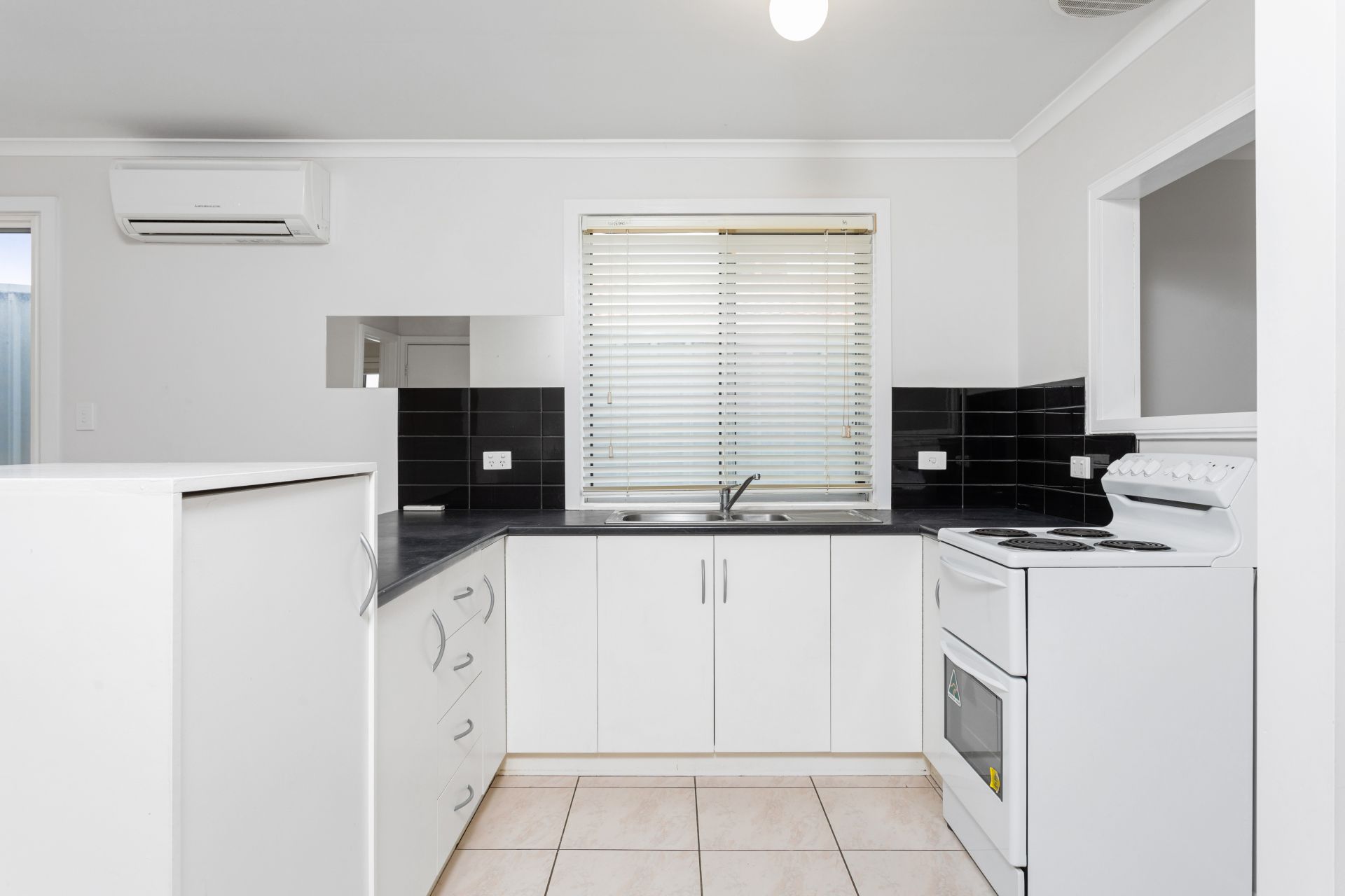 > open plan kitchen, dining and living areas with air conditioning