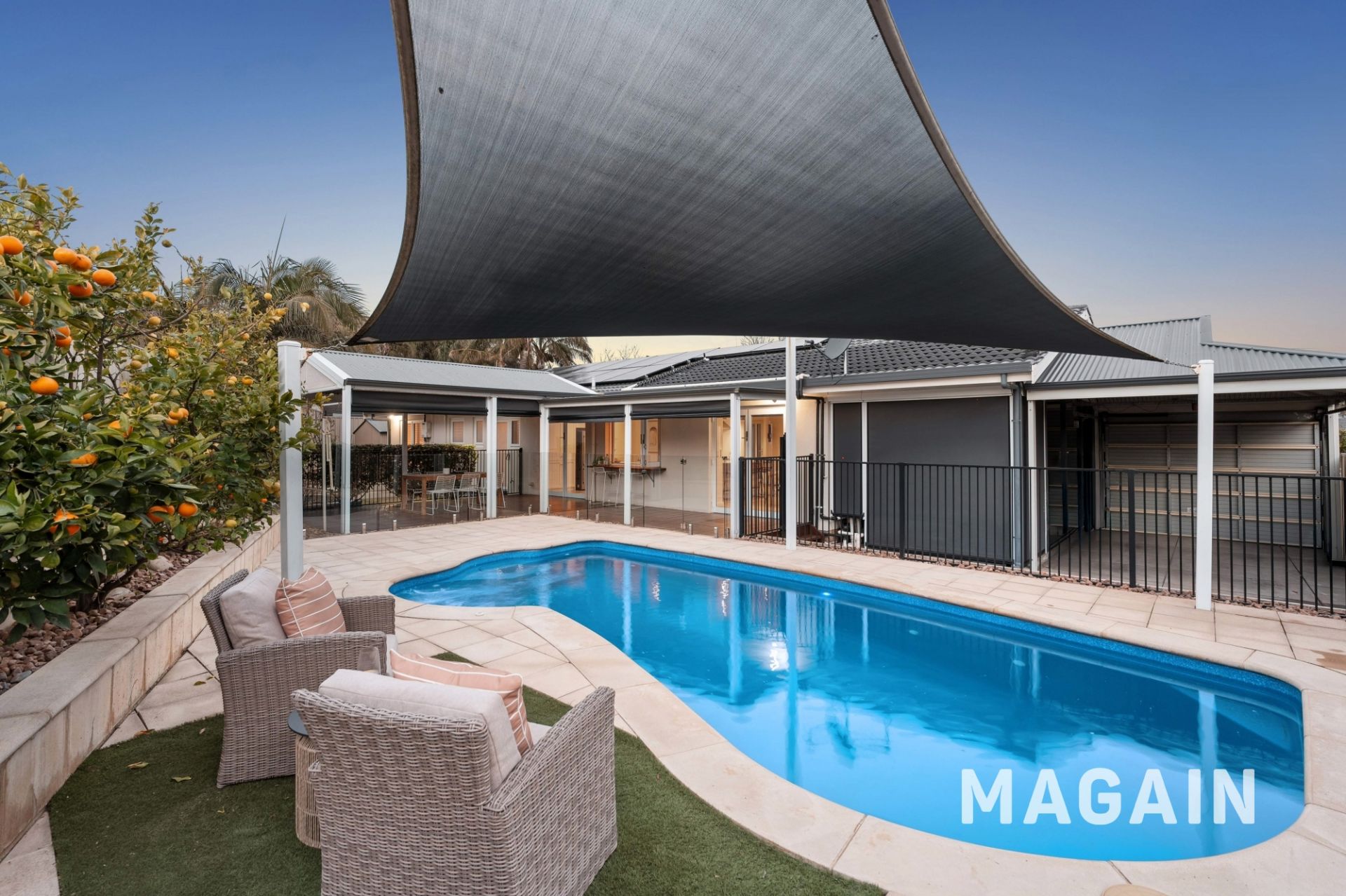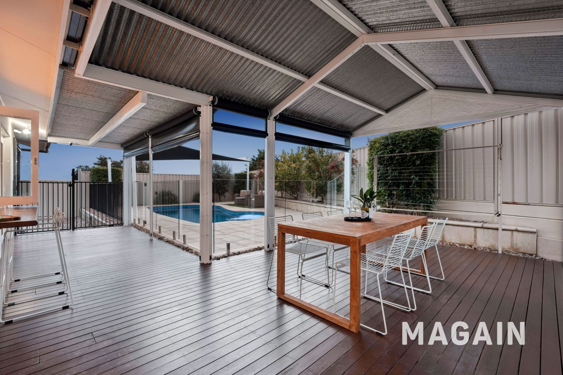 Outdoor living is a highlight here-two sets of double doors open to an 8.45m x 6.05m timber-decked undercover entertaining area complete with café blinds, perfect for summer gatherings. Overlooking the sparkling pool, surrounded by ample lounging space and shaded by a sail, this is a backyard designed for fun and relaxation. A small lawn, a 4m x 2.4m garden/tool shed, and fire pit area complete the picture, while access from the large carport ensures privacy and security at the rear.