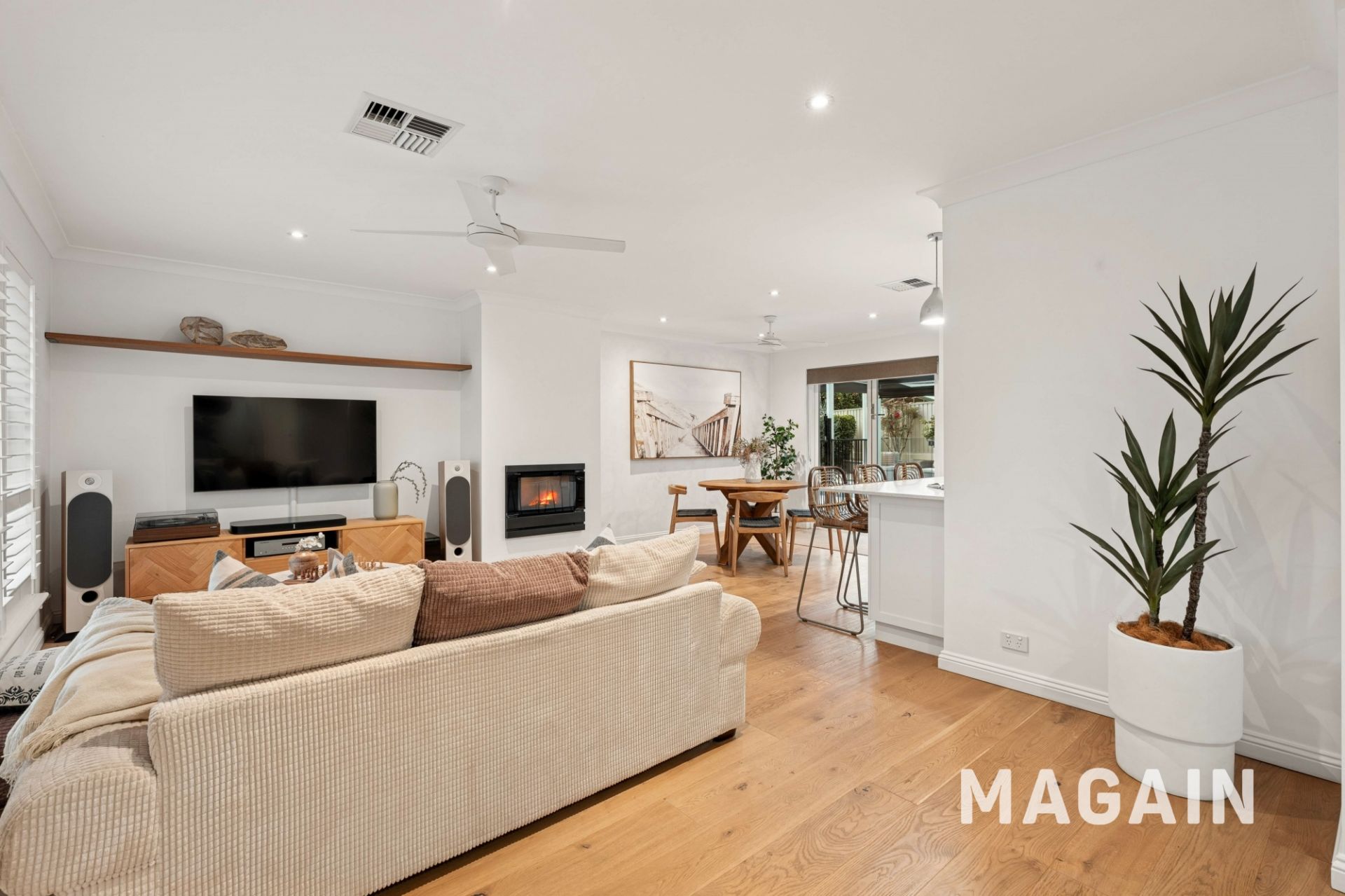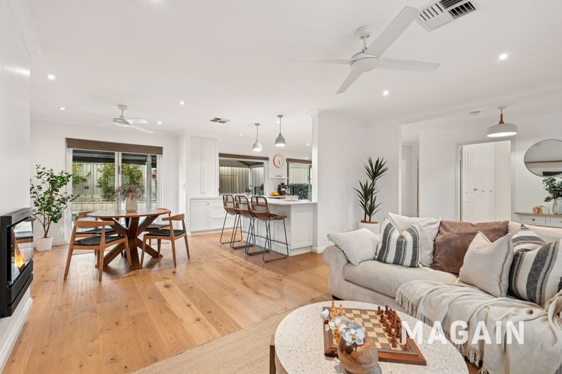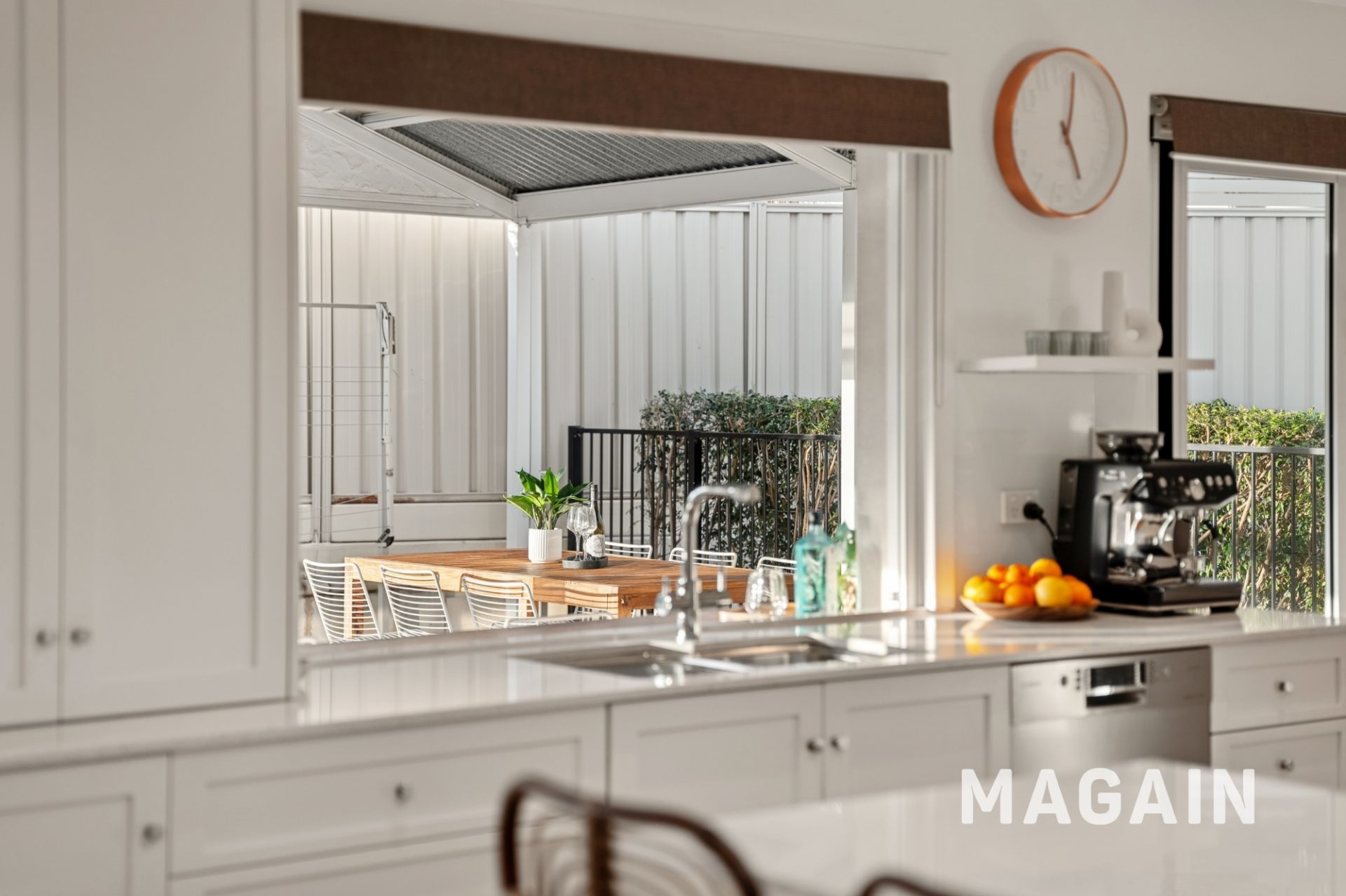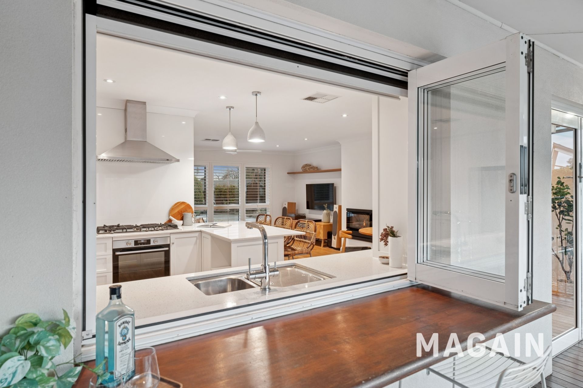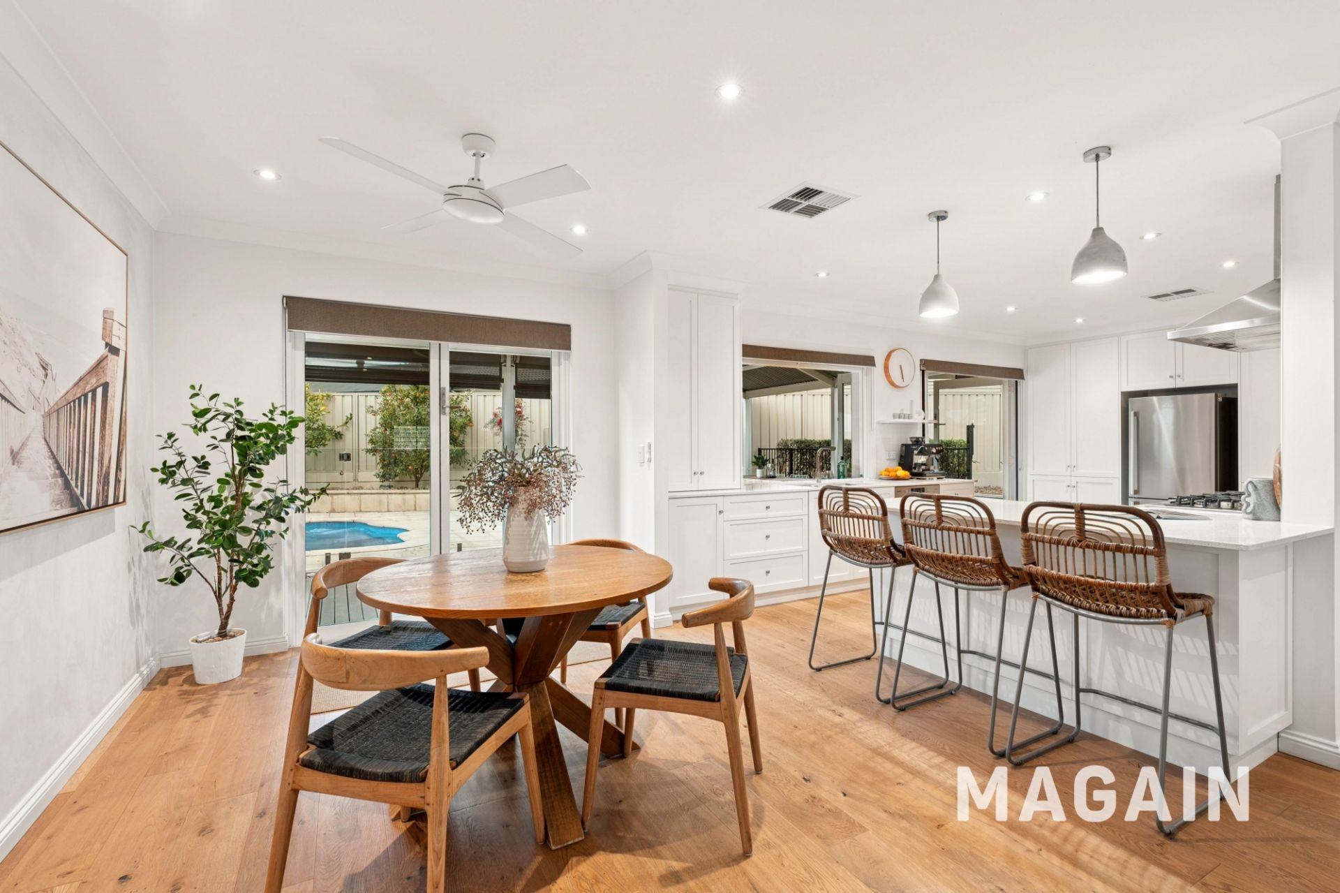 Step inside through the welcoming portico and entry foyer to discover oak floating floors, high ceilings, and energy-efficient LED downlights. The light-filled L-shaped lounge and dining area create a versatile space for entertaining guests or enjoying relaxed family living. Overlooking the dining zone, the stylish kitchen impresses with stone benchtops, soft-close cabinetry and throughtfully designed storage choices, a 900mm gas cooktop, dishwasher, stainless steel sink with filter tap, and a clever tri-fold sliding window/servery that overlooks the gabled outdoor entertaining and sparkling pool area.