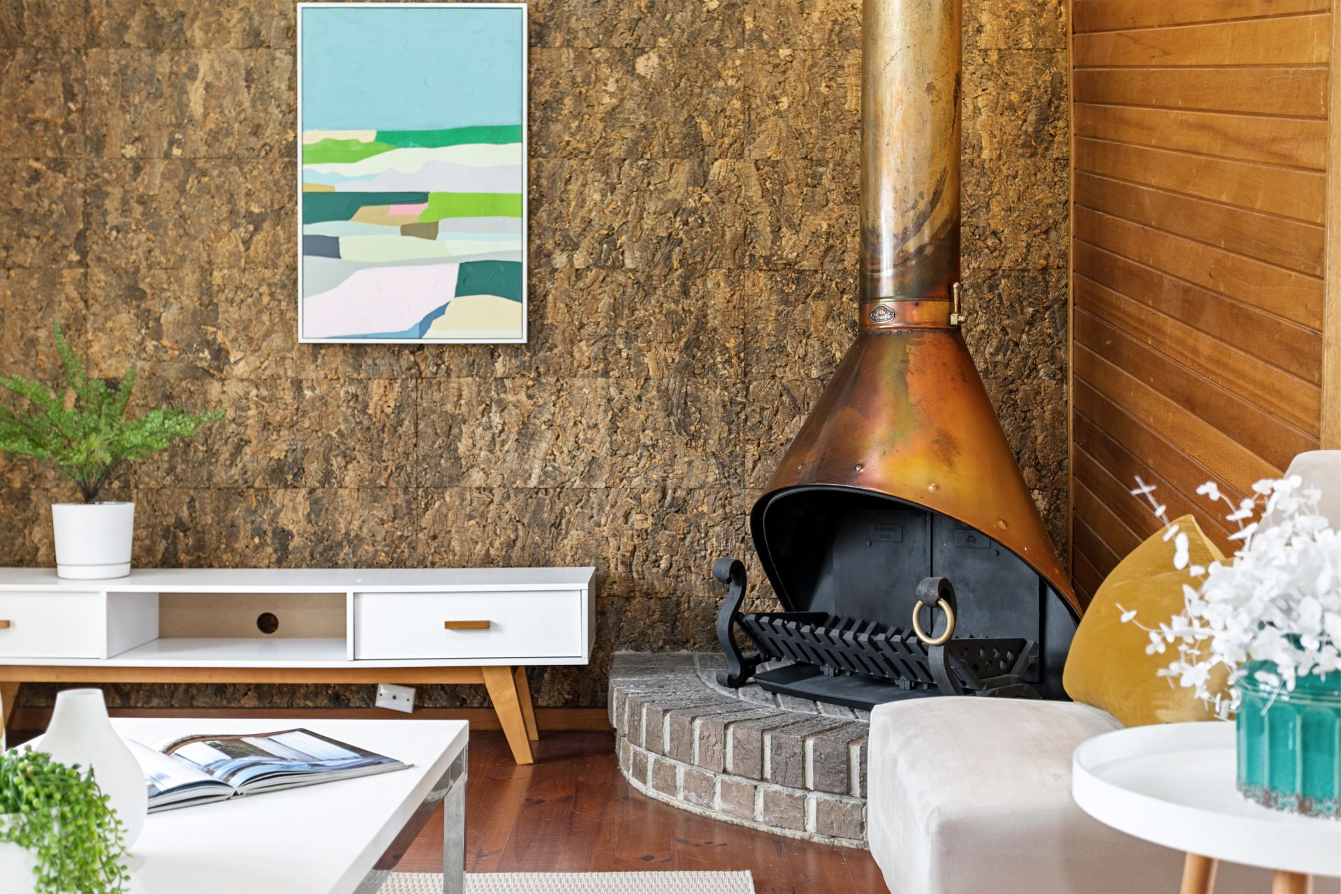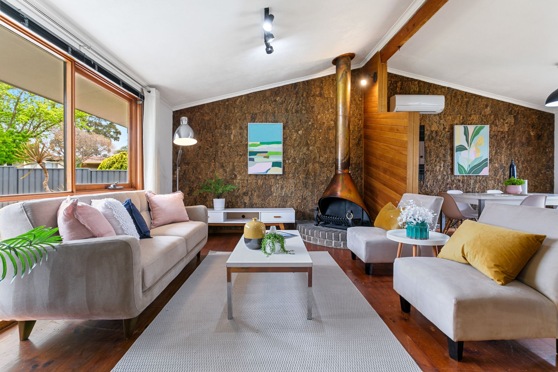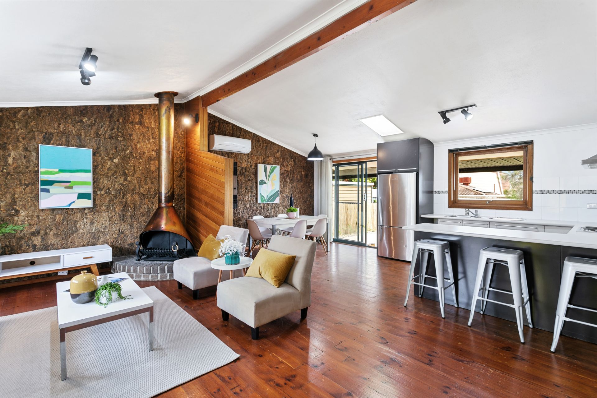 Once you enter the home you will immediately be welcomed by the generous open plan kitchen, living and dining spaces, the kitchen boasts ample storage and bench space and as you draw your attention to the open areas you are met with a pitched ceiling, one of a kind cork feature wall and fully functioning copper fireplace you can't help but feel right at home.