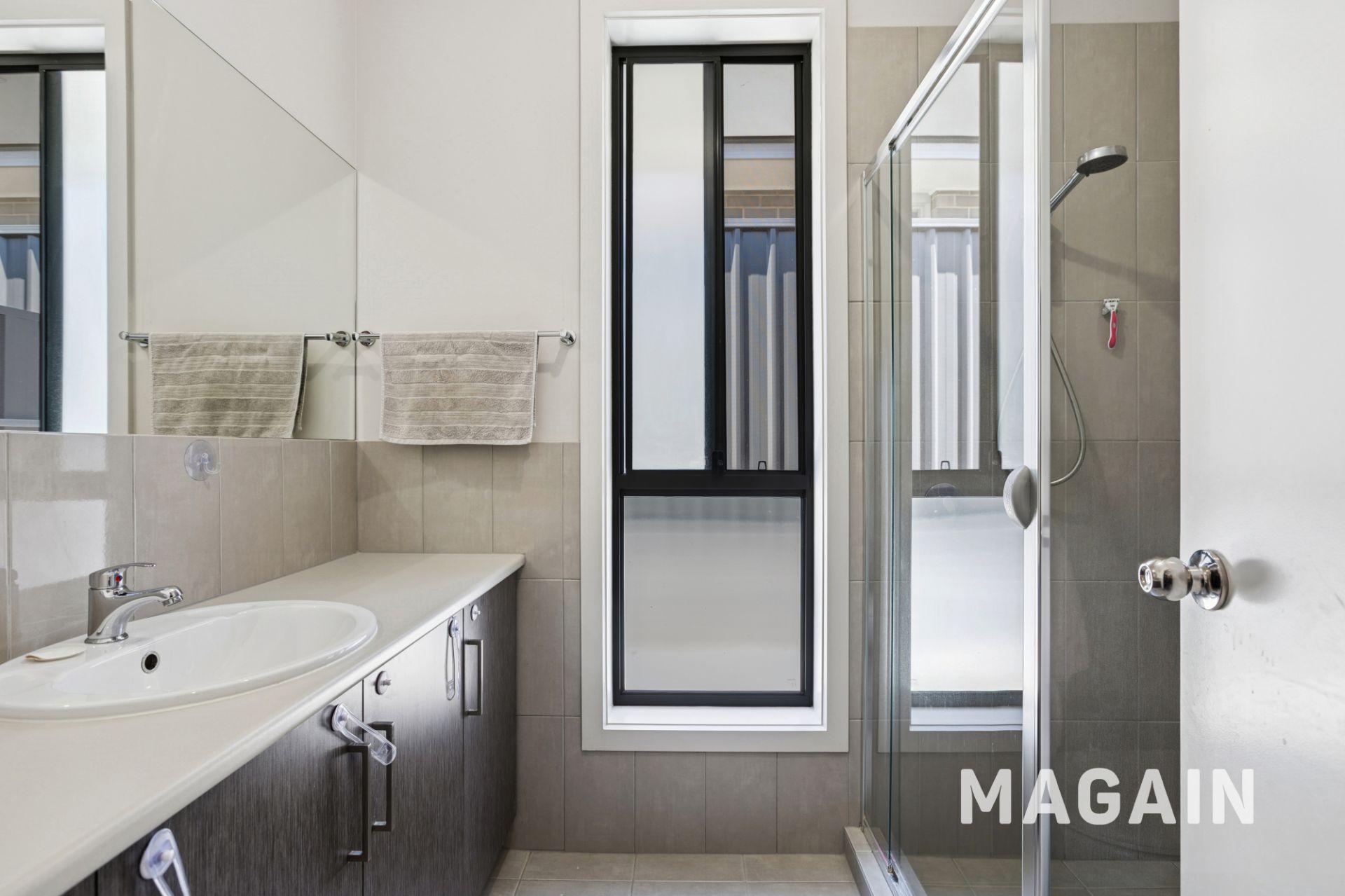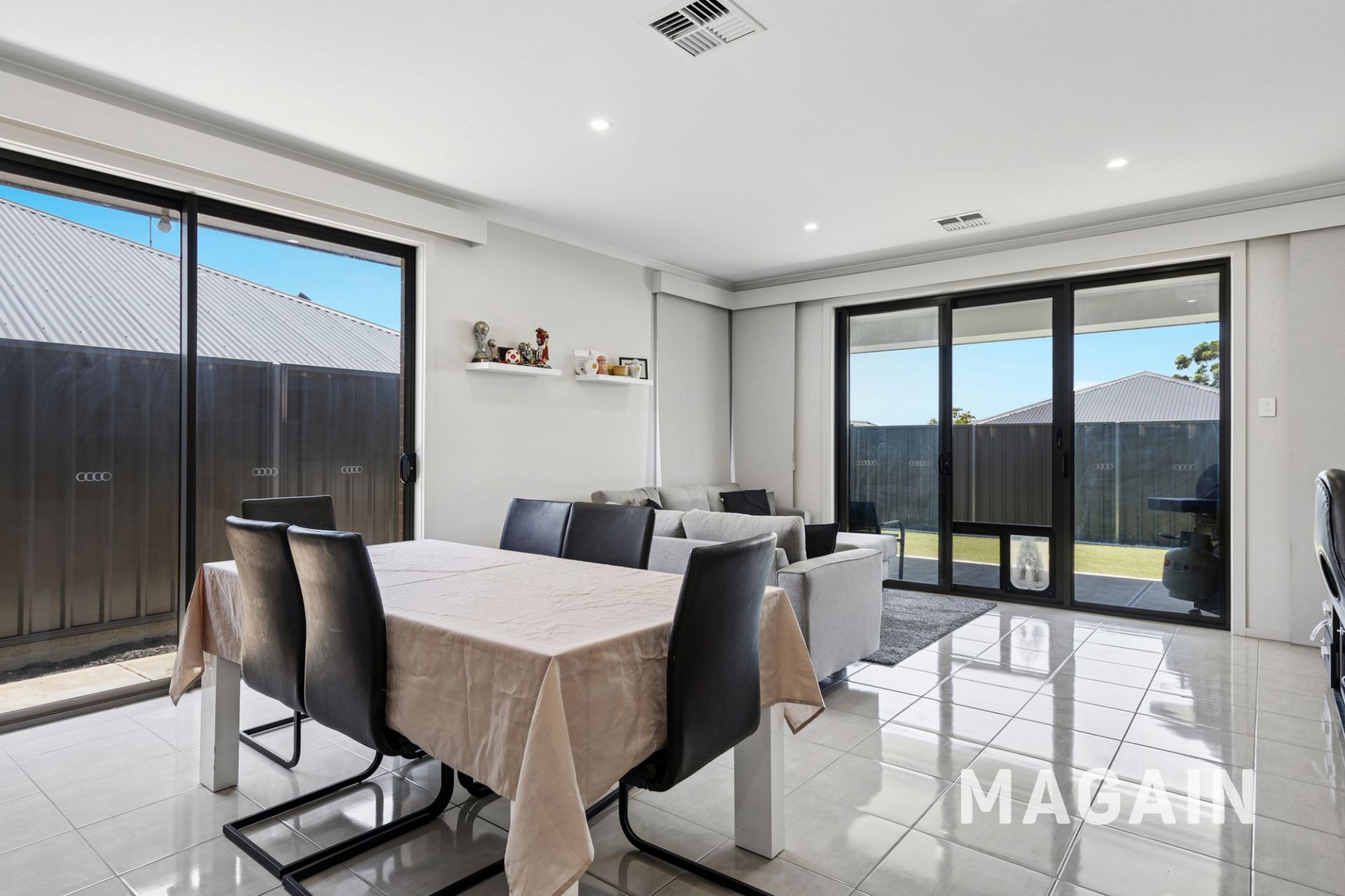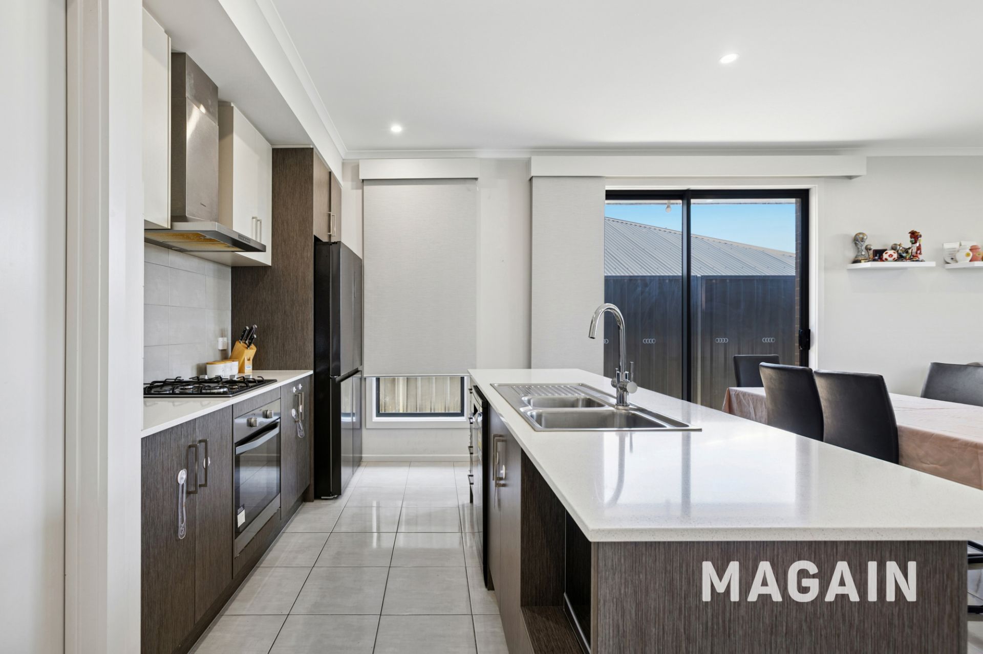 At the heart of the home is the light-filled open-plan kitchen, living and meals area, enhanced by high ceilings and designed for effortless everyday living. The kitchen is well appointed with a generous island bench, dishwasher and walk-in pantry, and is perfectly positioned to overlook the meals and family living zone, ensuring a seamless connection while entertaining or keeping an eye on the family. Sliding doors extend this space to the undercover alfresco area, creating an ideal indoor–outdoor flow, with artificial lawn beyond providing a low-maintenance and practical outdoor setting.