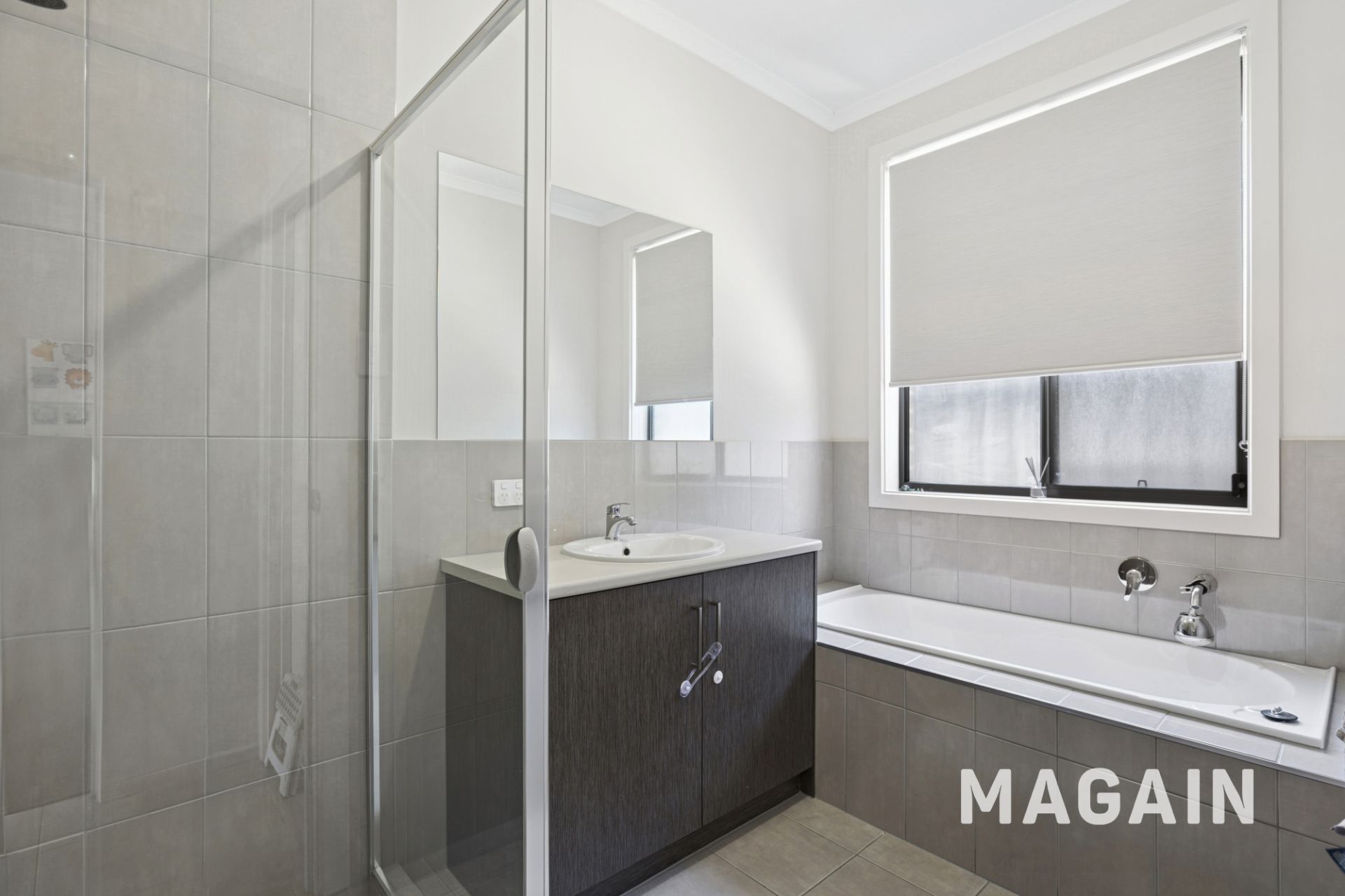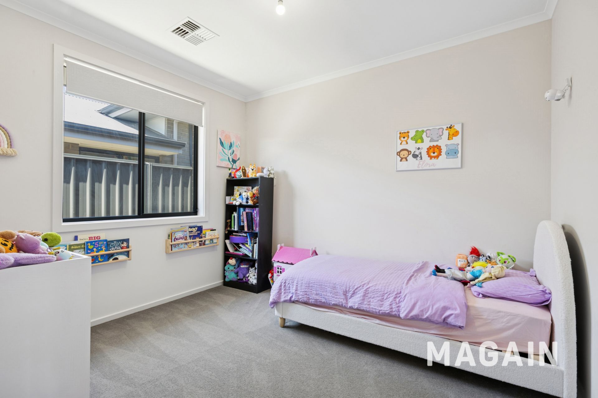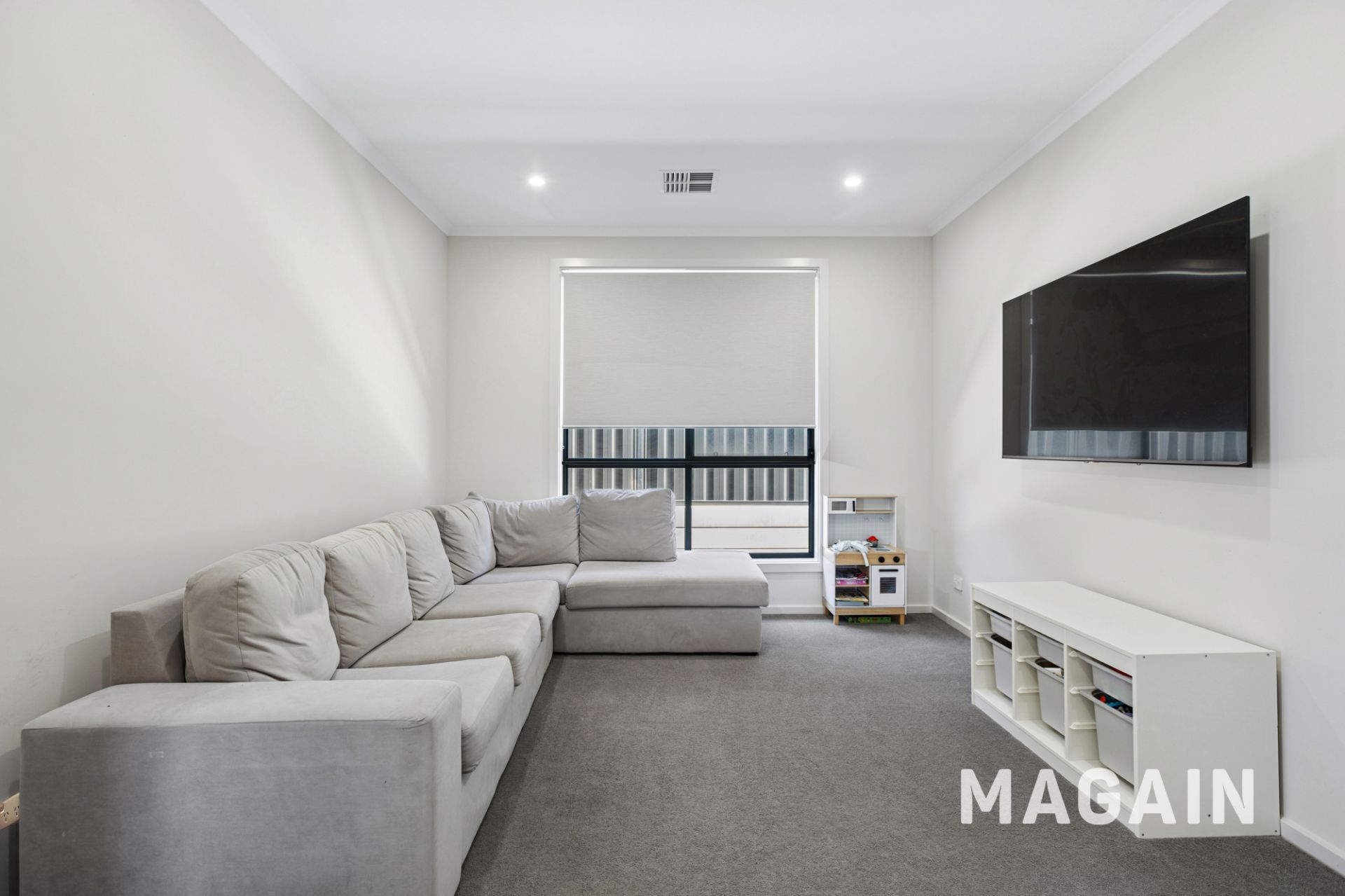 At the heart of the home is the light-filled open-plan kitchen, living and meals area, enhanced by high ceilings and designed for effortless everyday living. The kitchen is well appointed with a generous island bench, dishwasher and walk-in pantry, and is perfectly positioned to overlook the meals and family living zone, ensuring a seamless connection while entertaining or keeping an eye on the family. Sliding doors extend this space to the undercover alfresco area, creating an ideal indoor–outdoor flow, with artificial lawn beyond providing a low-maintenance and practical outdoor setting.