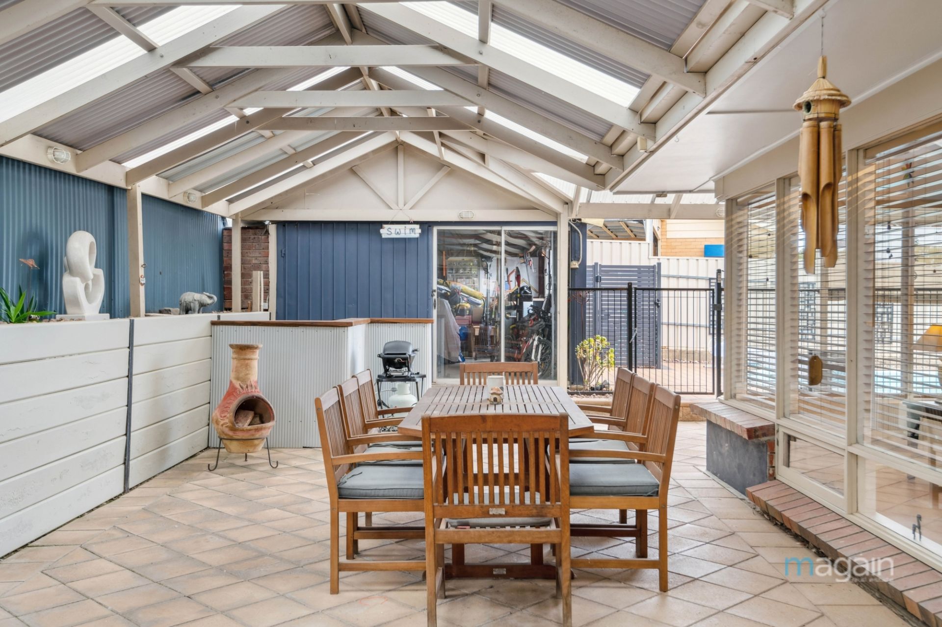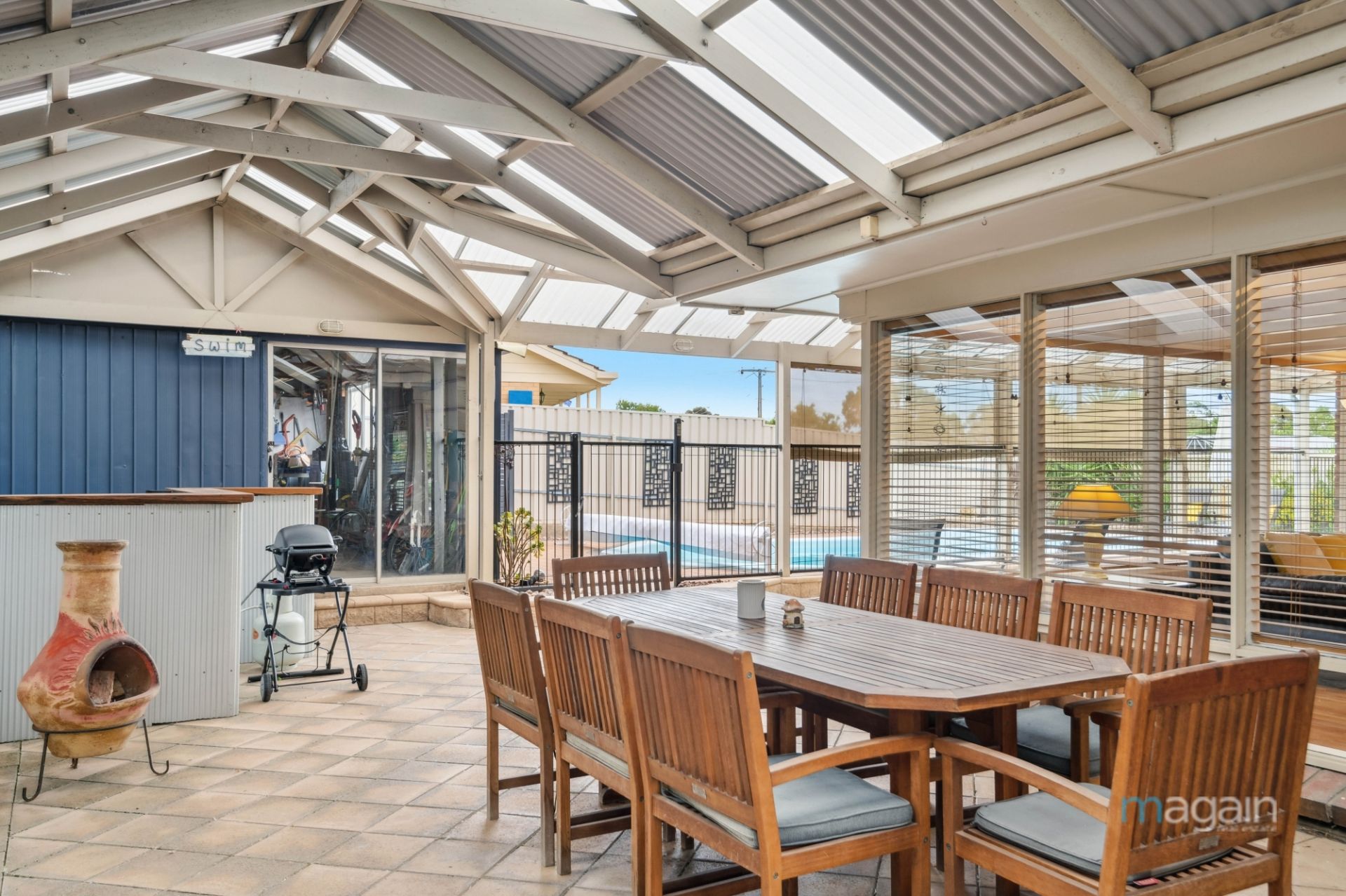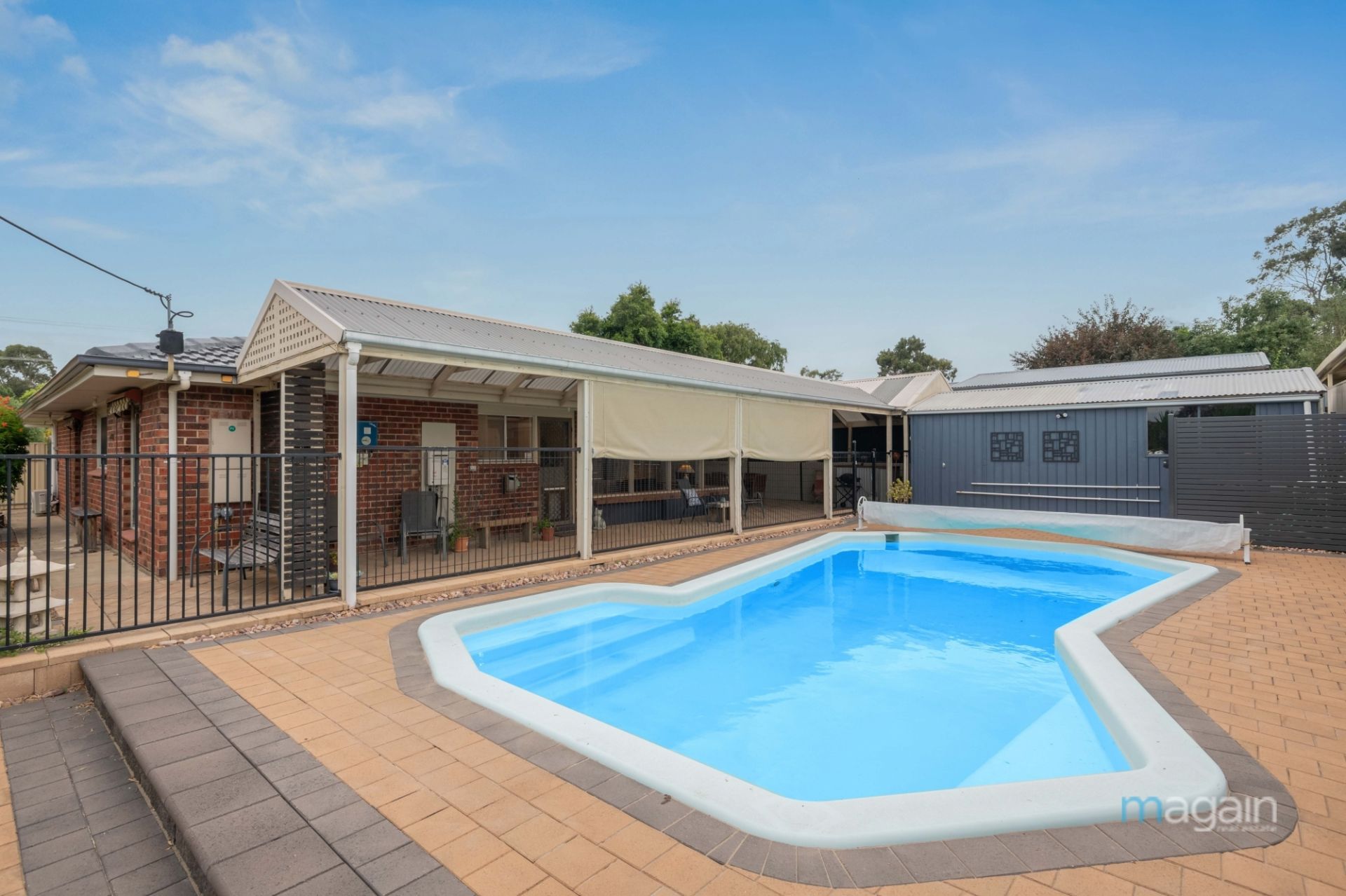 For those who relish outdoor entertaining, the central living area opens up to an enormous paved entertaining space that wraps around the house. This alfresco haven features a built-in bar and is sheltered by a pitched roof pergola, providing the perfect vantage point to overlook the inviting inground solar-heated swimming pool. A paved area with garden beds and a sizable shed/workshop with power connected complete the backyard oasis.