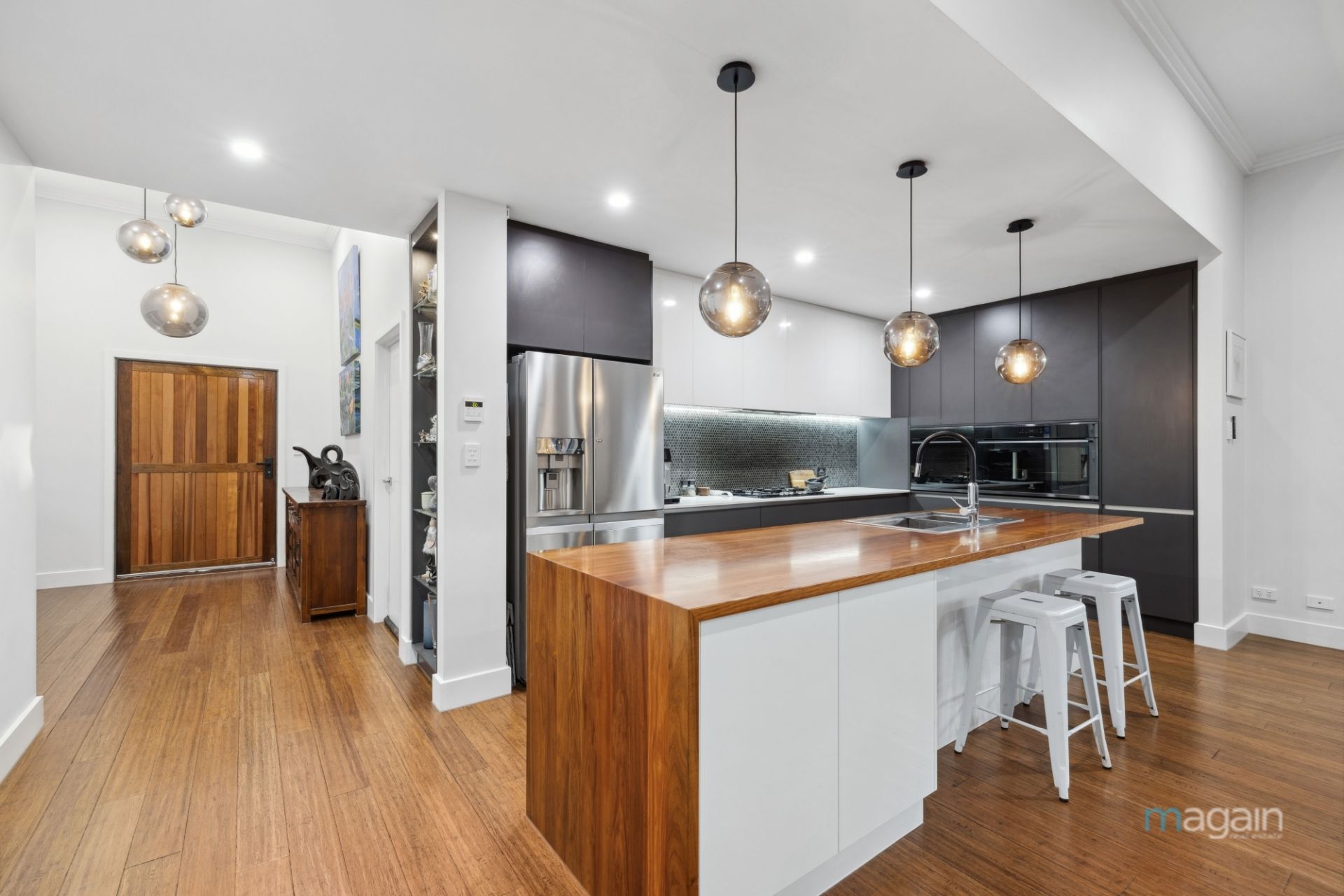 Flow through the Foyer to the heart of the home to the sprawling open-plan kitchen, dining, and living area that's purpose-built for both everyday living and year-round entertaining. The gourmet kitchen is a chef's dream, showcasing a timber island bench with breakfast bar, quality stone countertops, a gas cooktop, wall ovens, a dishwasher, premium finishes including soft-close cabinetry and a clever hideaway nook for appliances.
