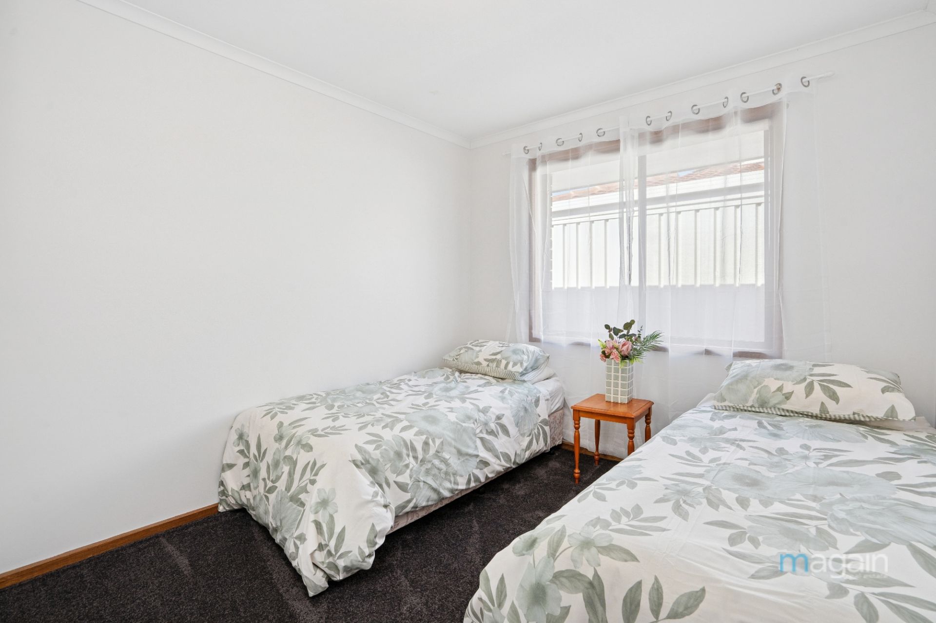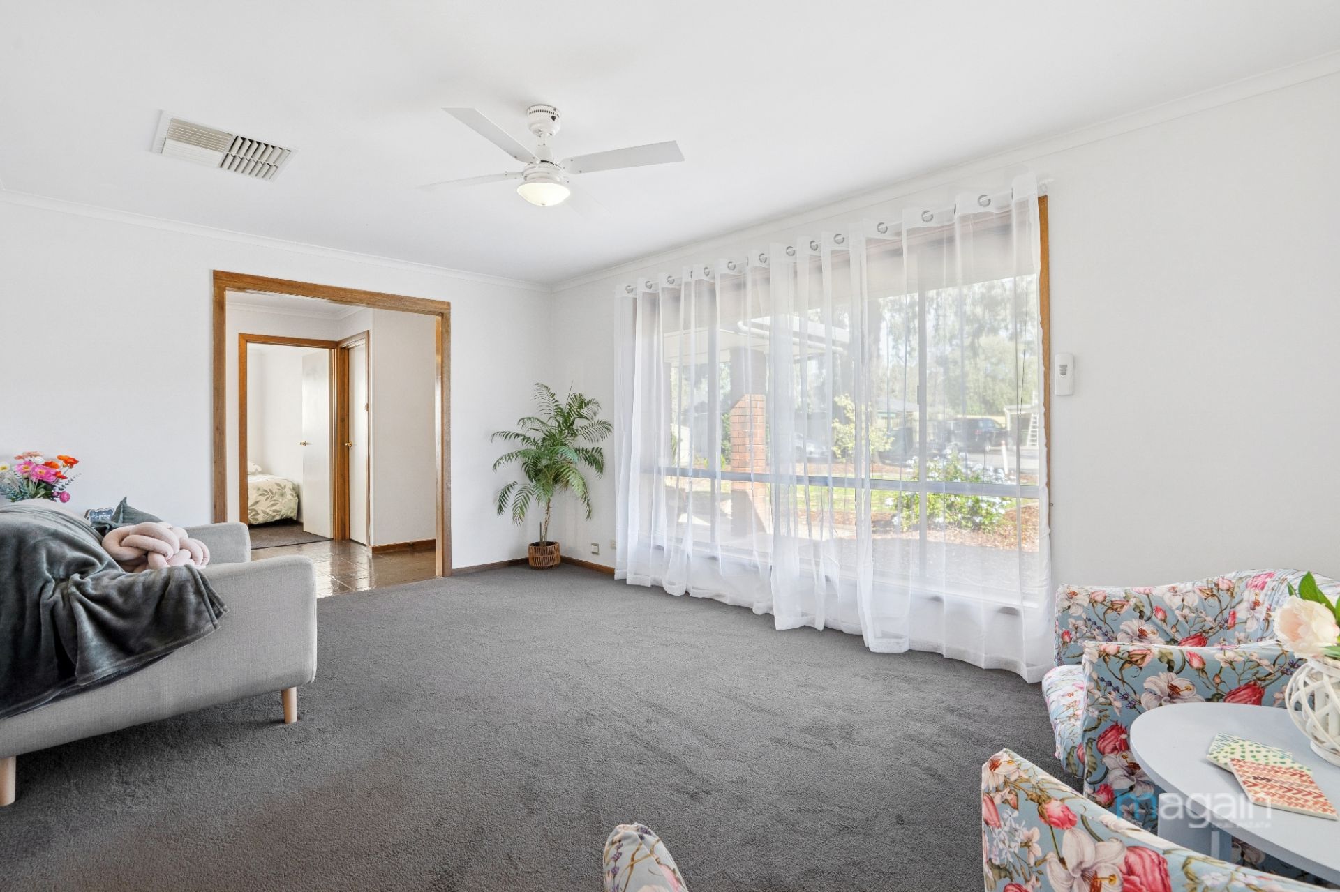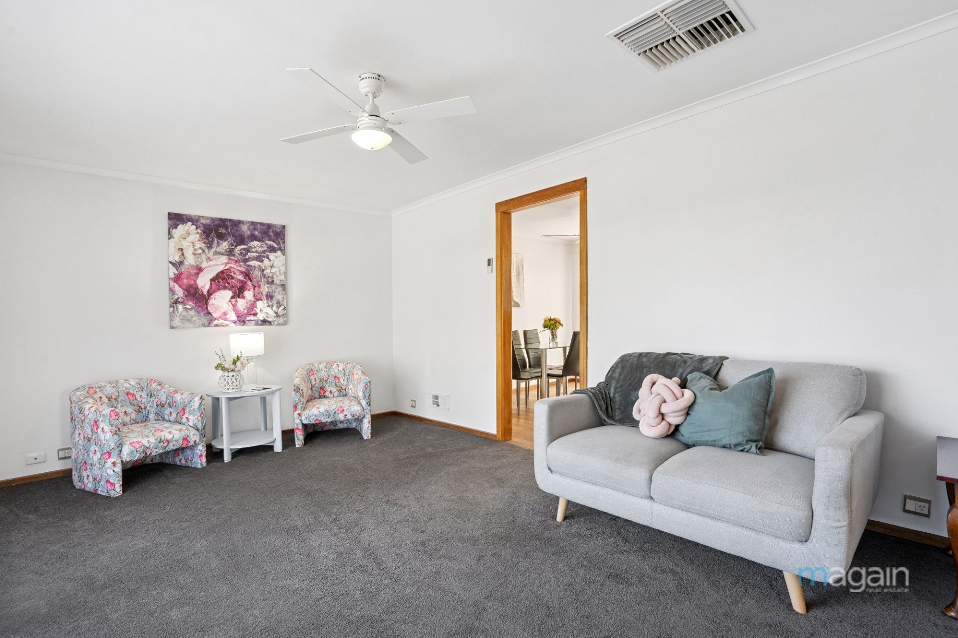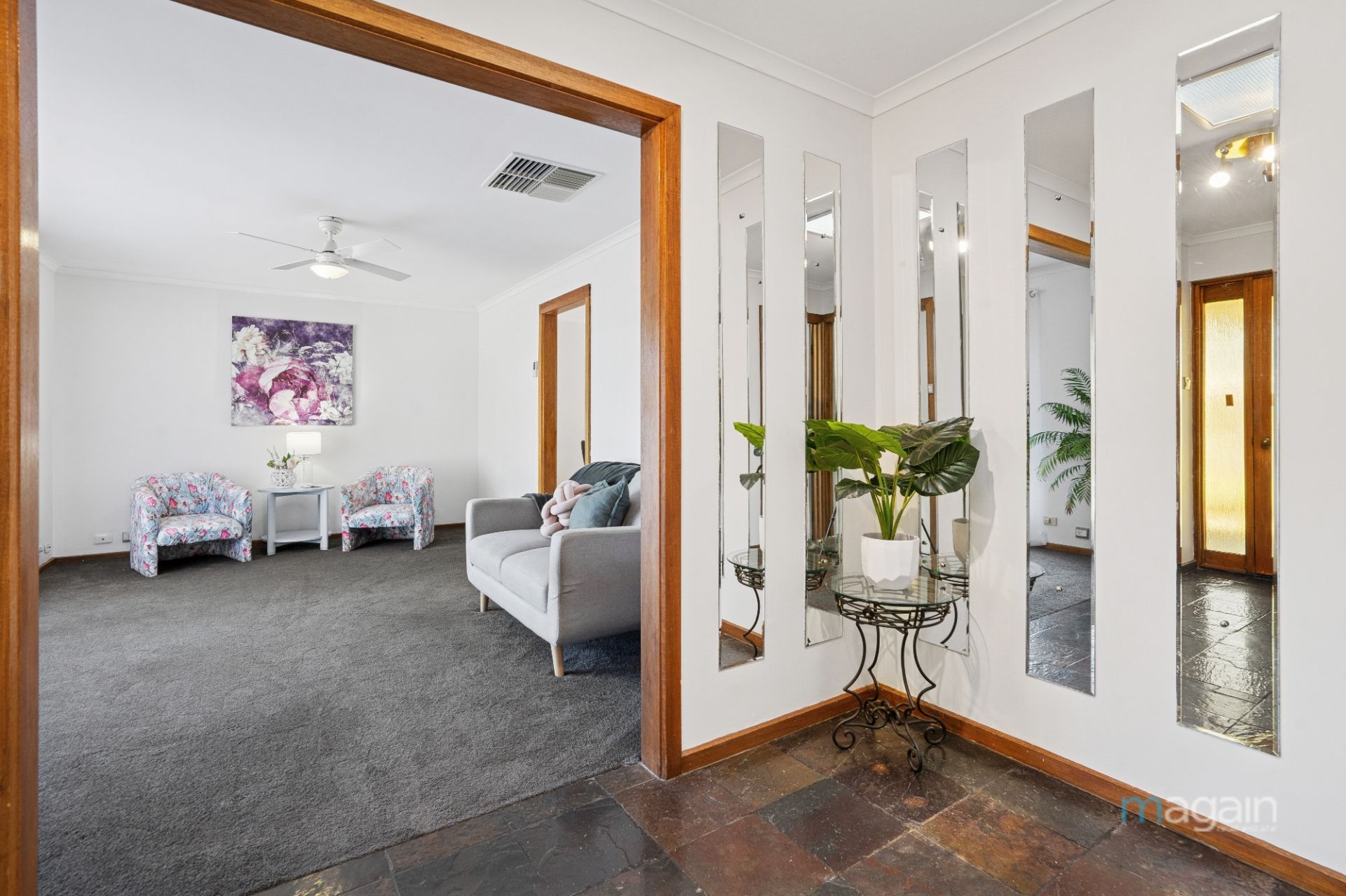 Upon entry, you're welcomed by a hallway with a skylight that fills the space with natural light. All three bedrooms feature built-in robes, while two include ceiling fans for added comfort. The formal lounge is both spacious and light-filled, offering a peaceful view over the front garden and a ceiling fan for year-round comfort.