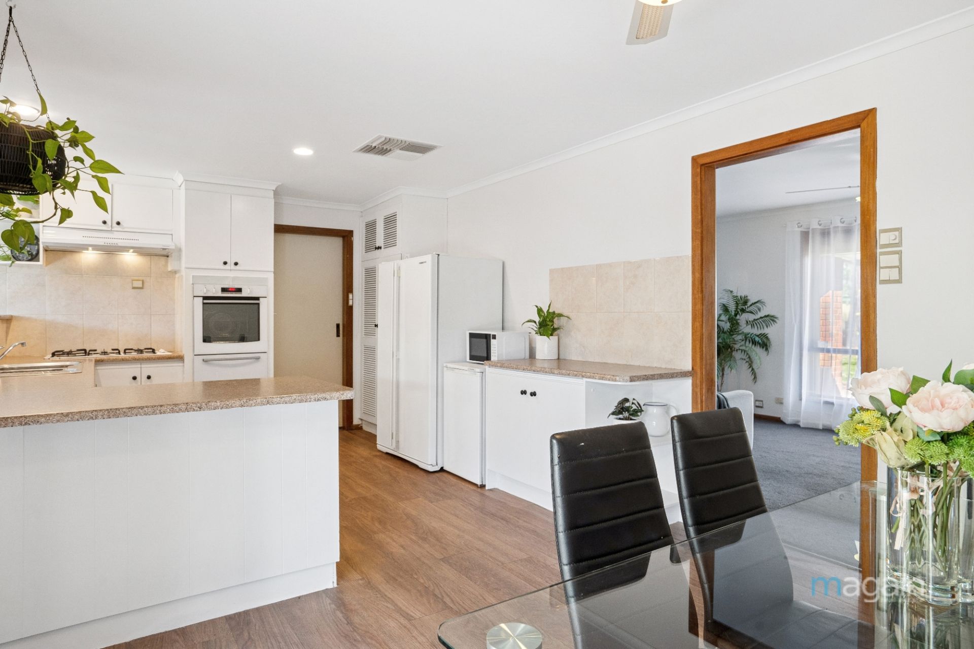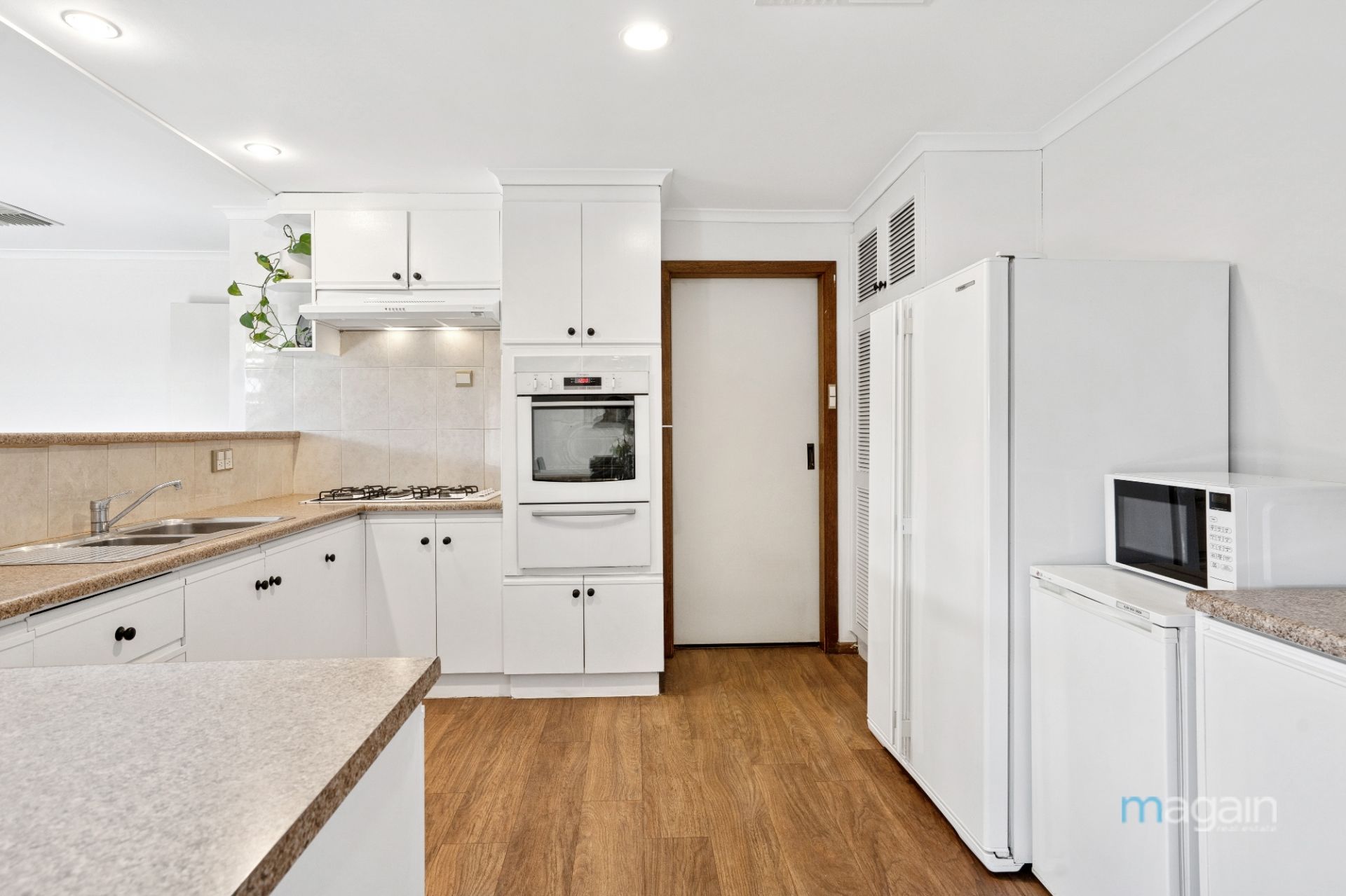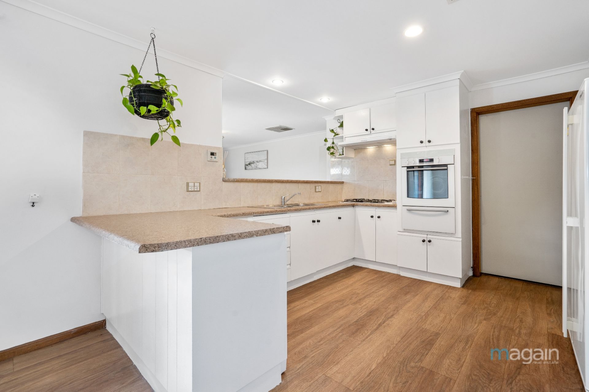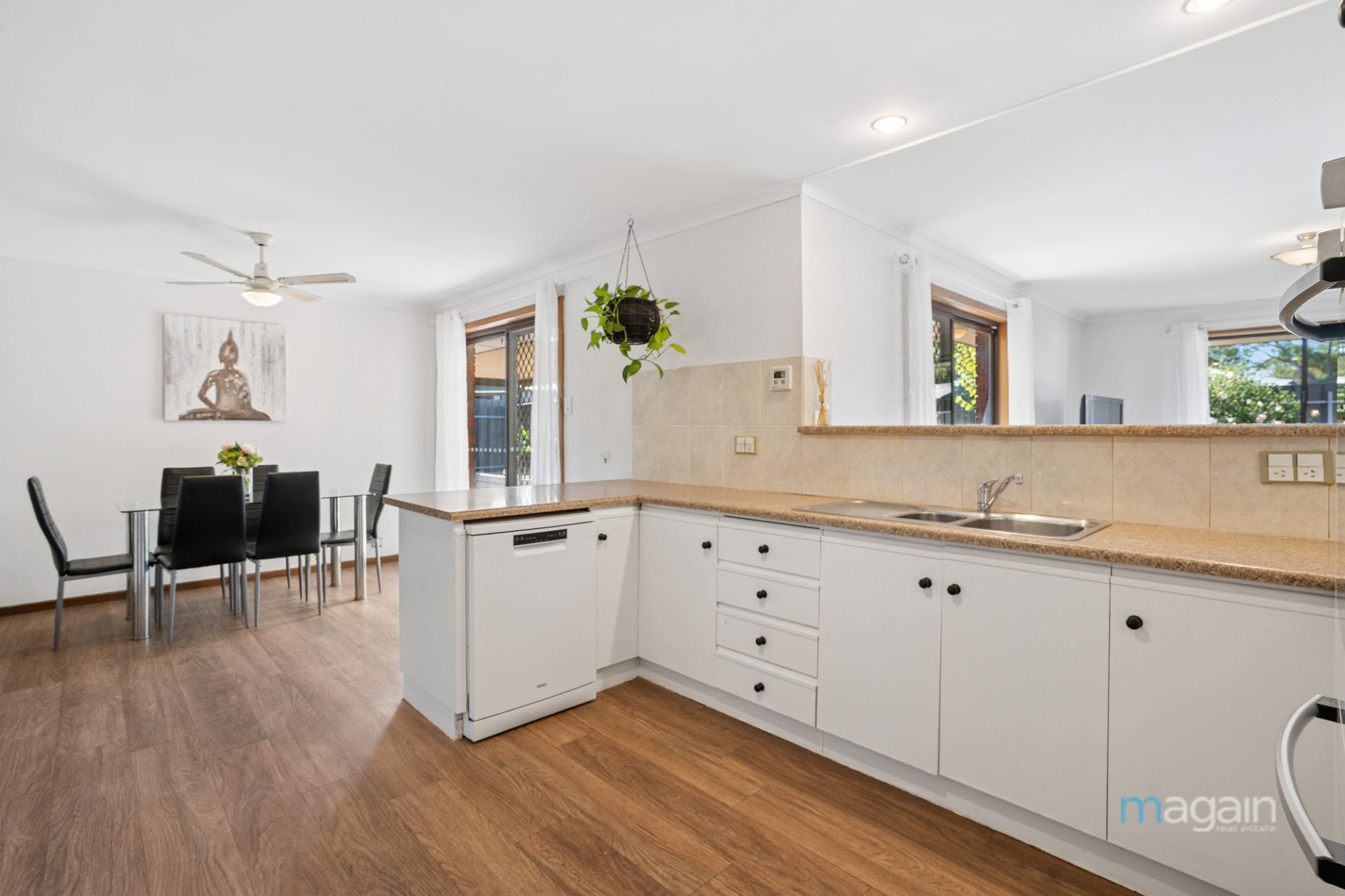 The kitchen has been tastefully updated with a new dishwasher and rangehood, gas cooktop, breakfast bar, double fridge space, and a pantry. Adjacent to the kitchen, the dining area includes a ceiling fan and sliding glass doors that open to the undercover entertaining area, creating a seamless indoor-outdoor flow.