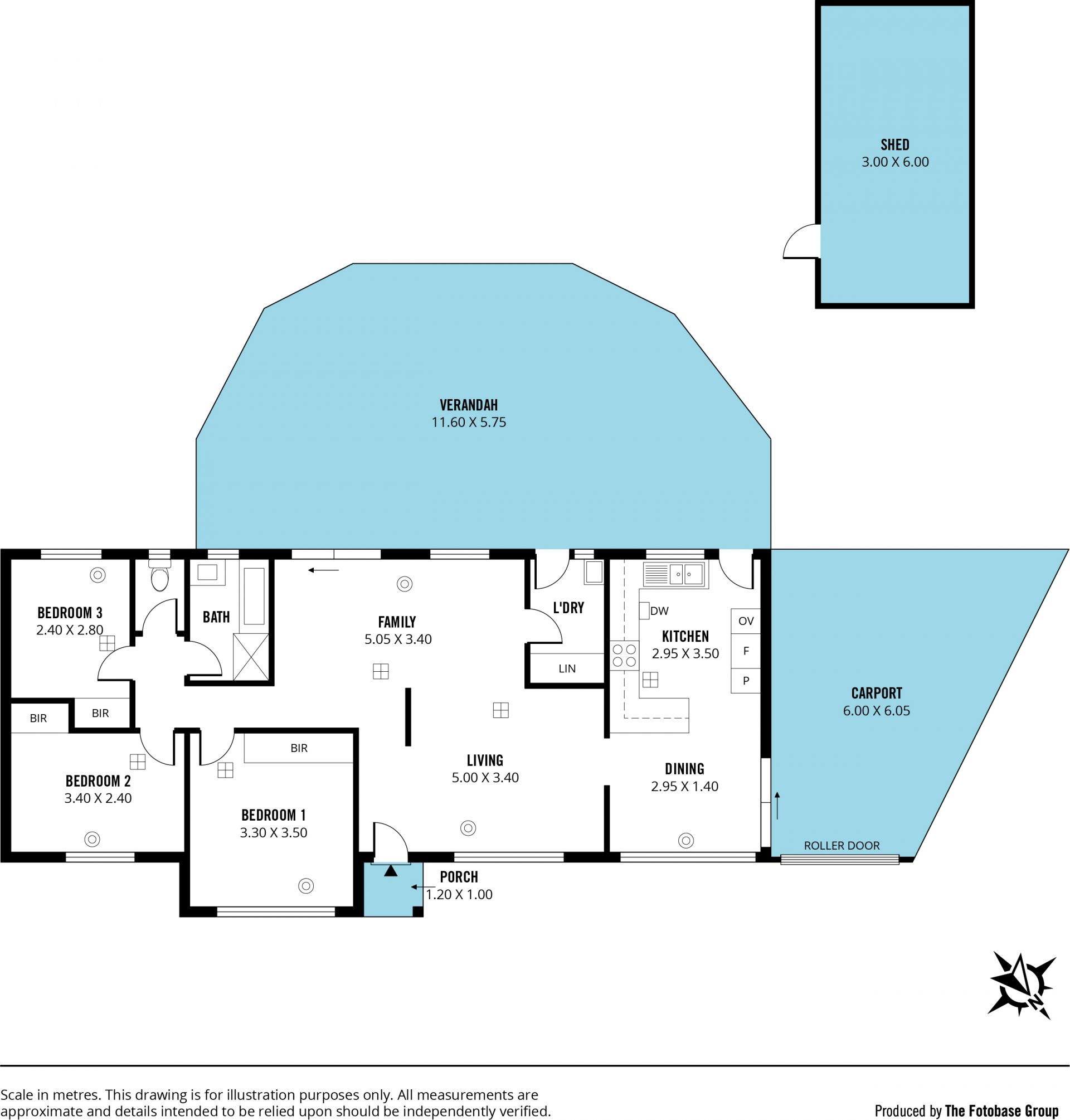 > from the family living area, sliding doors open to an outdoor entertaining space, thoughtfully enclosed by café blinds and sheltered under a flat roof pergola. This inviting area overlooks a generous lawn, creating the perfect setting for gatherings and outdoor activities. A compact garden shed is neatly tucked away, providing convenient storage for all your gardening essentials