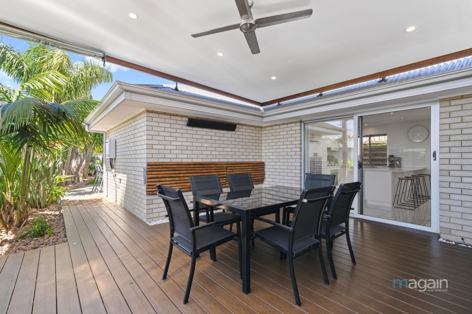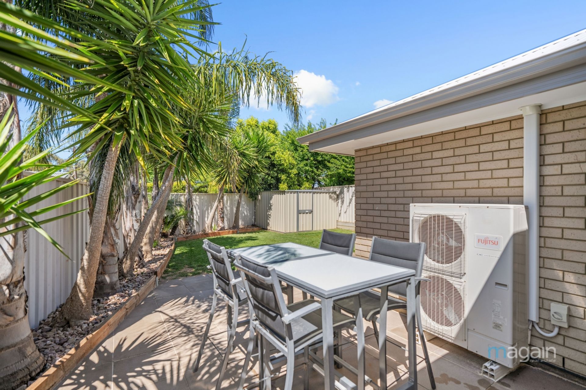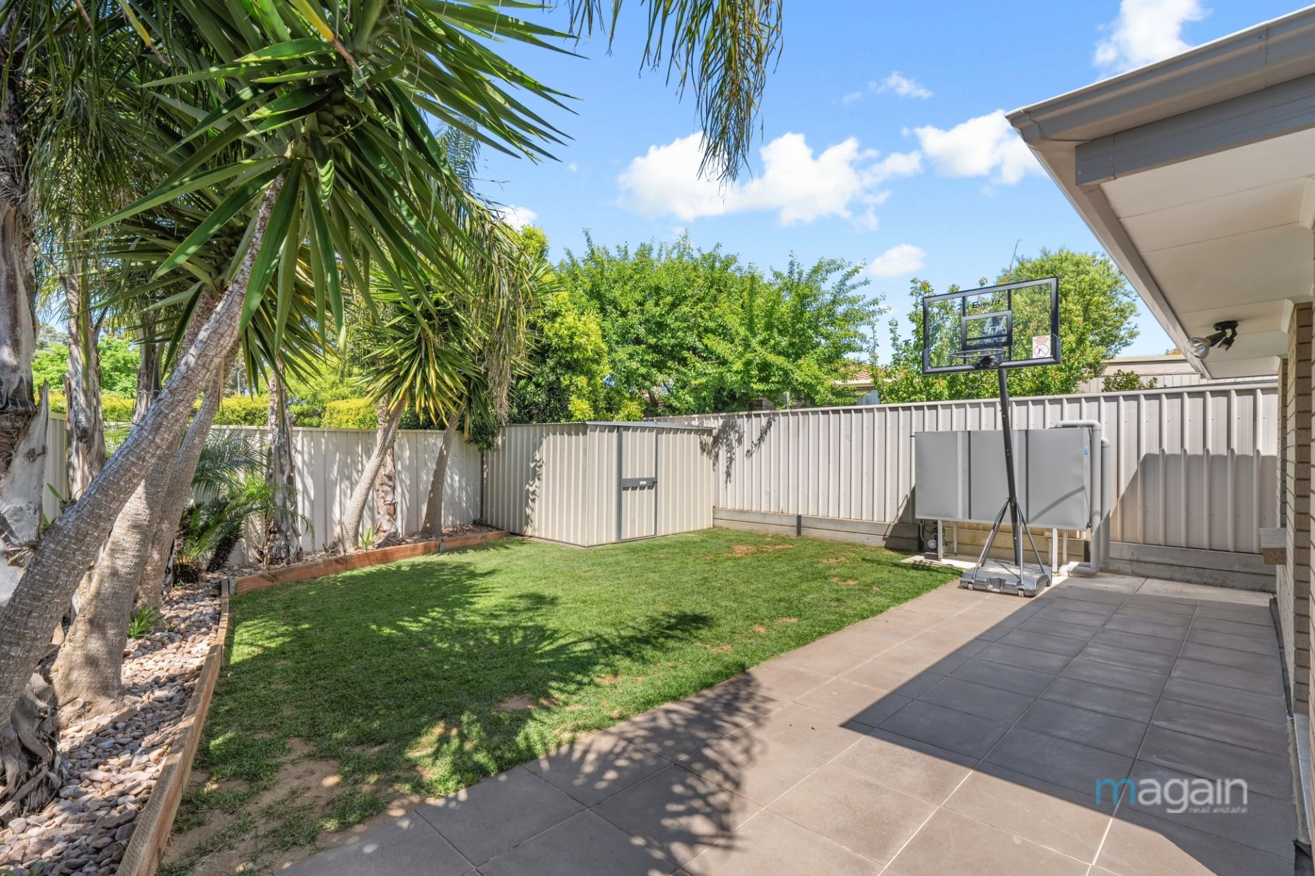 For those who love outdoor living, glass sliding doors from the kitchen open onto a decked alfresco space, surrounded by a tropical oasis-style garden. With café blinds, a ceiling fan, and outdoor heaters, this is the perfect place to relax and entertain all year round. Additionally, the rear yard features a second paved entertaining area, a good-sized grassy expanse, and a small tool shed for your convenience.