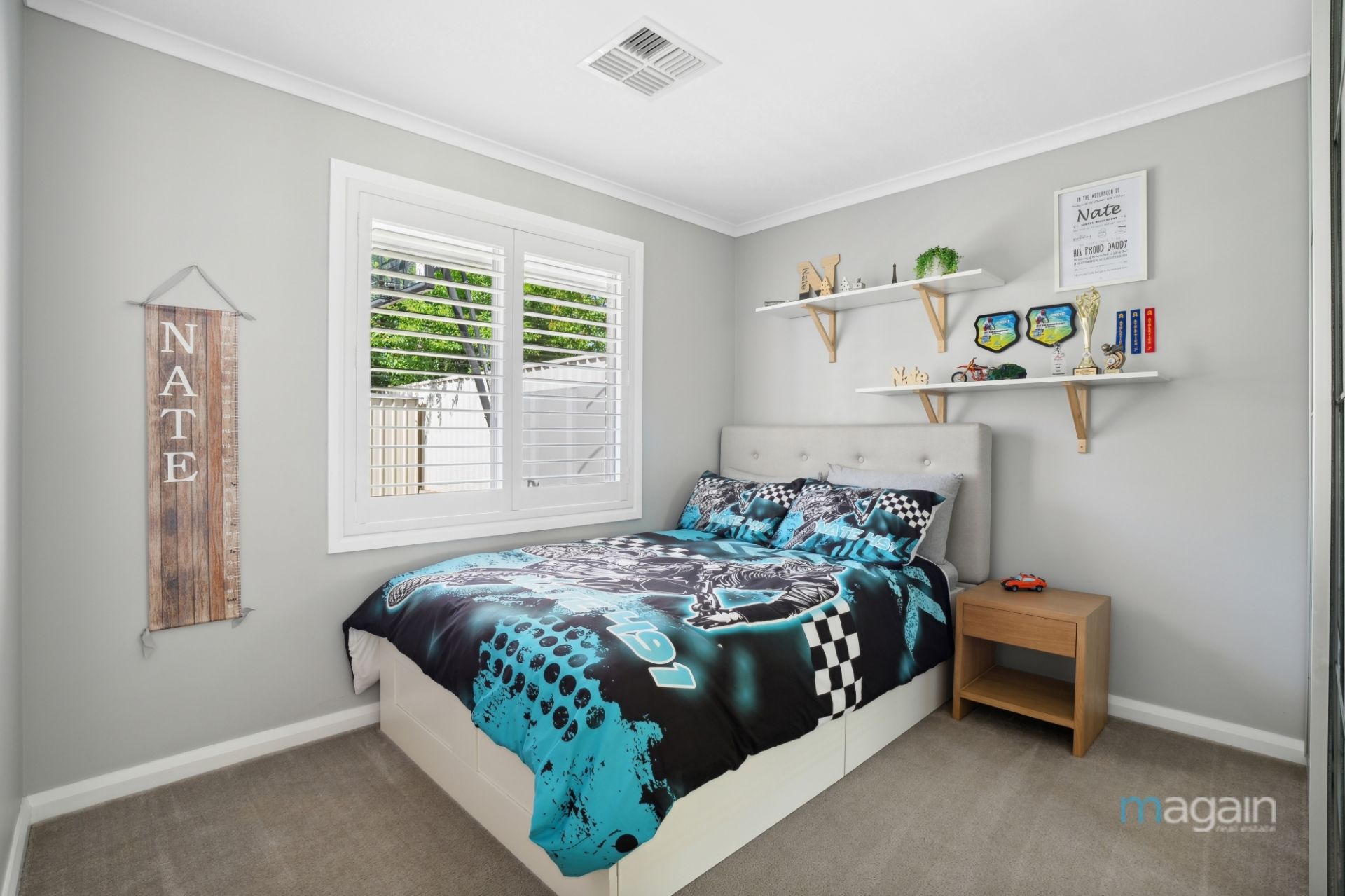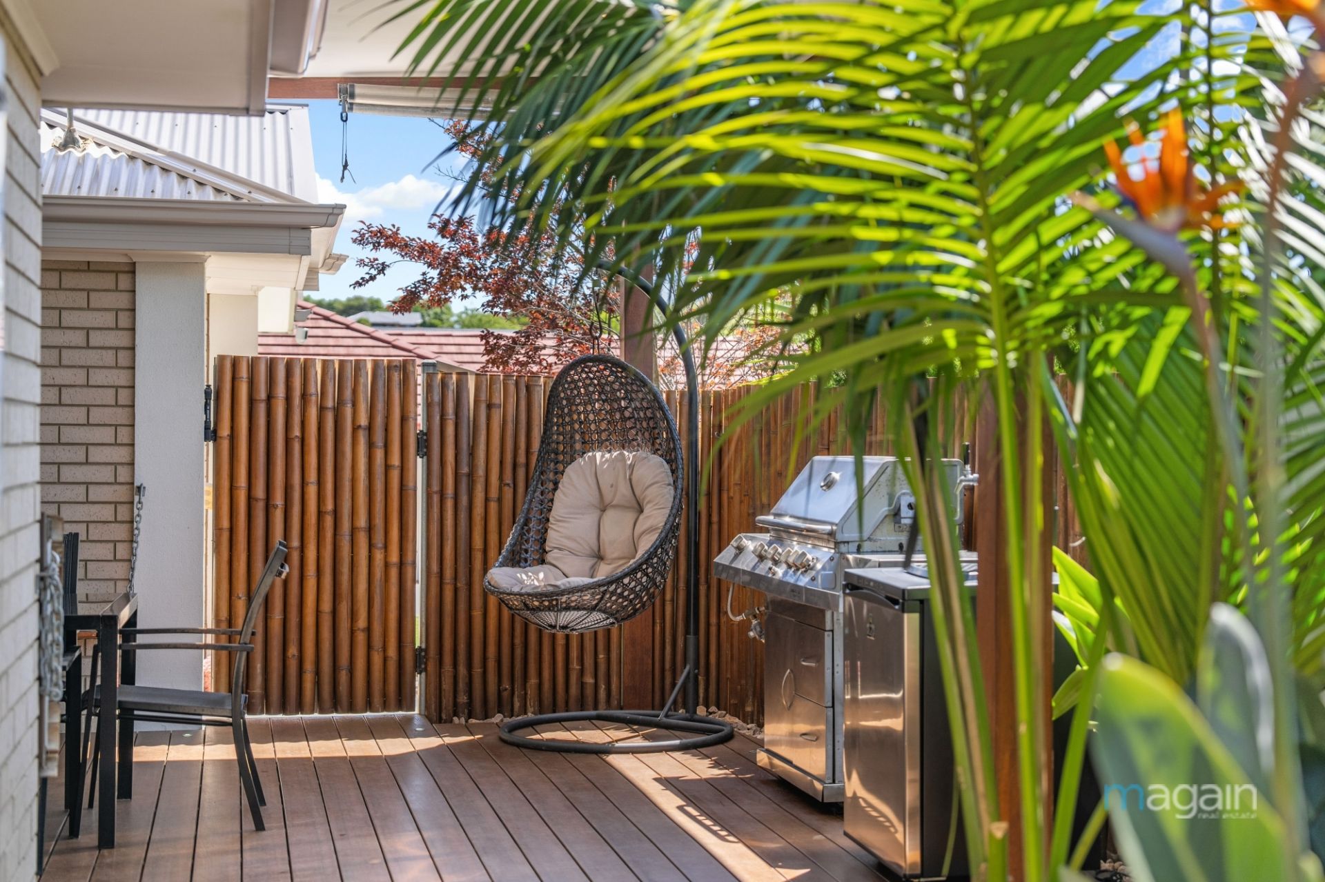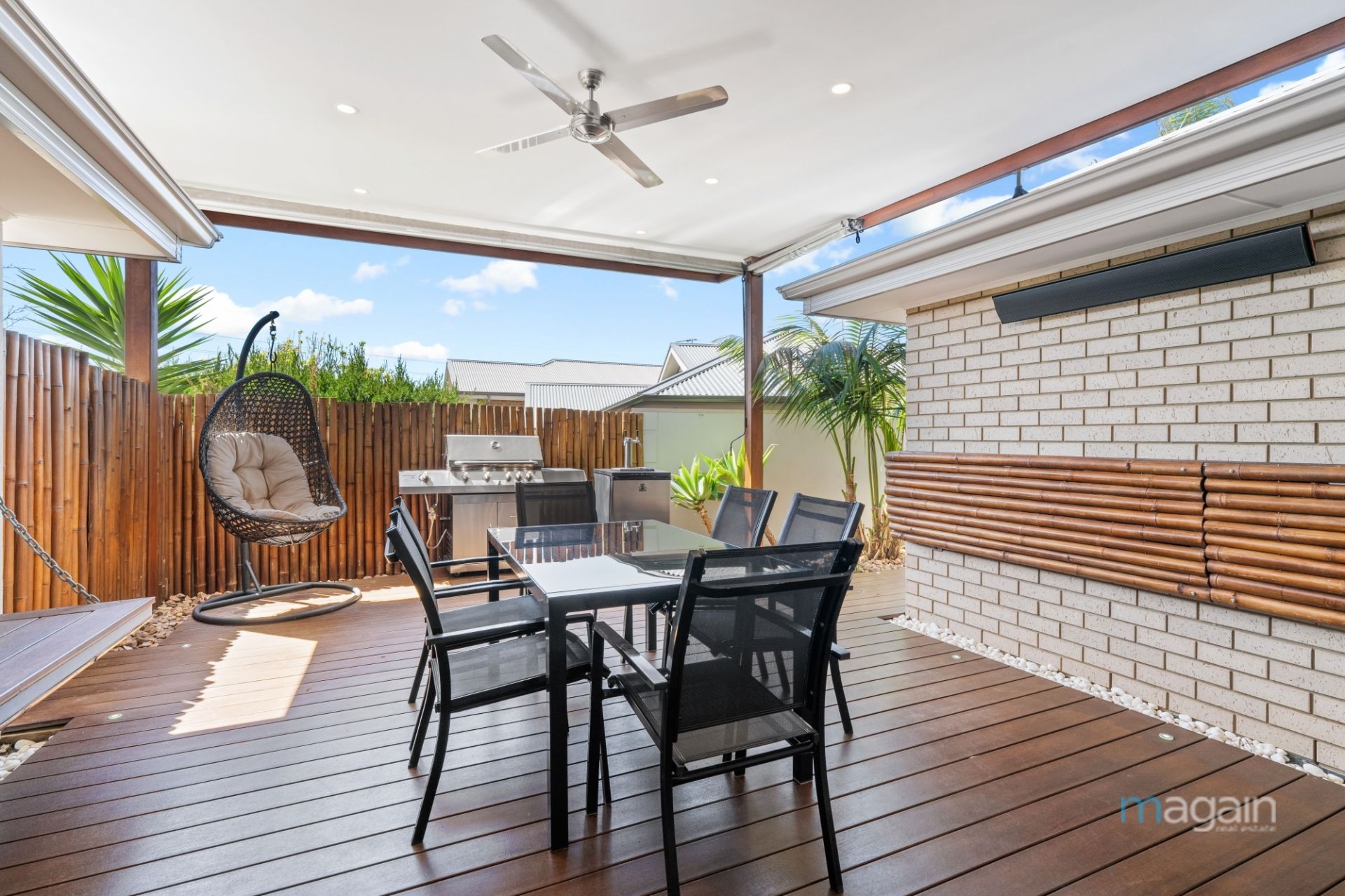 For those who love outdoor living, glass sliding doors from the kitchen open onto a decked alfresco space, surrounded by a tropical oasis-style garden. With café blinds, a ceiling fan, and outdoor heaters, this is the perfect place to relax and entertain all year round. Additionally, the rear yard features a second paved entertaining area, a good-sized grassy expanse, and a small tool shed for your convenience.