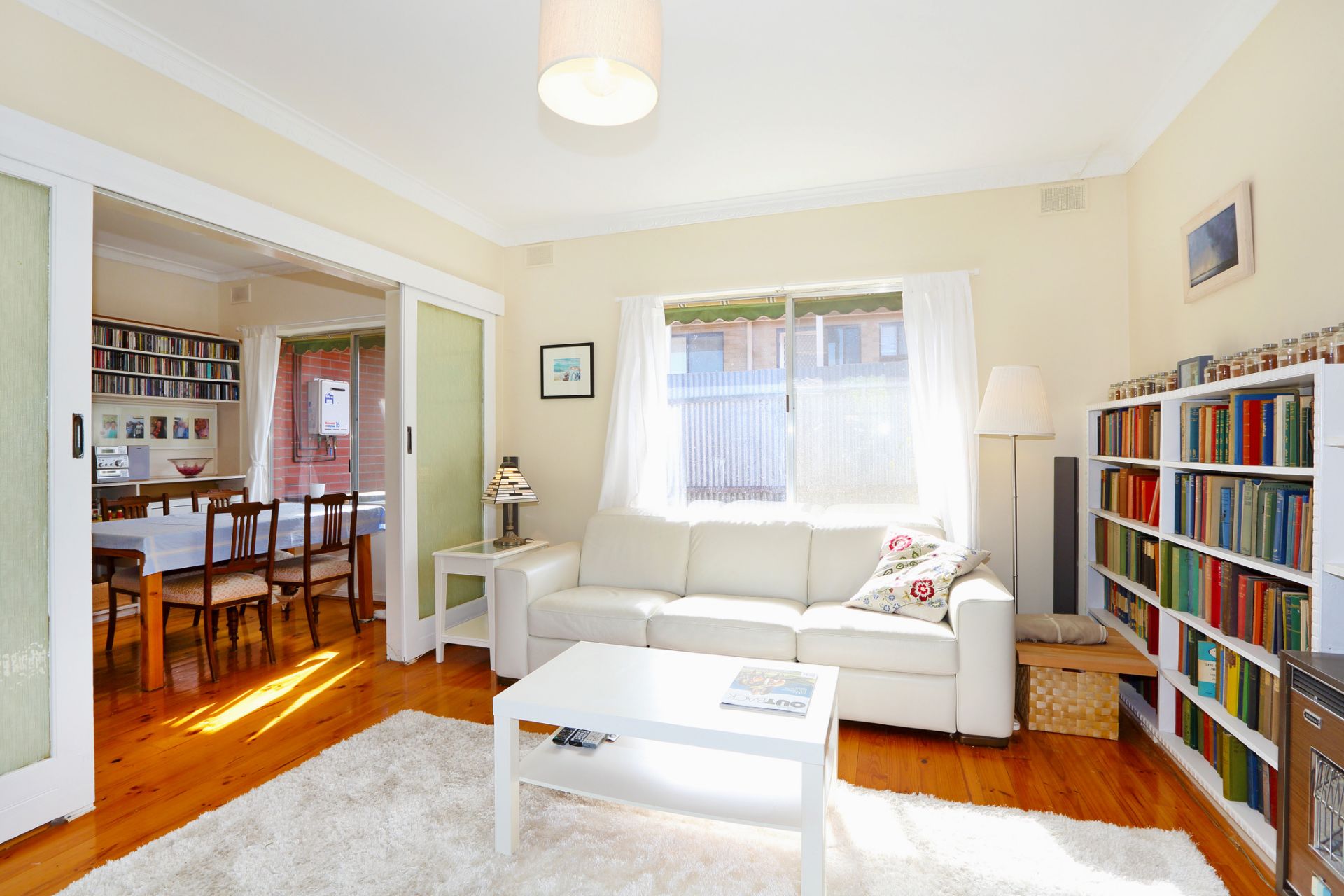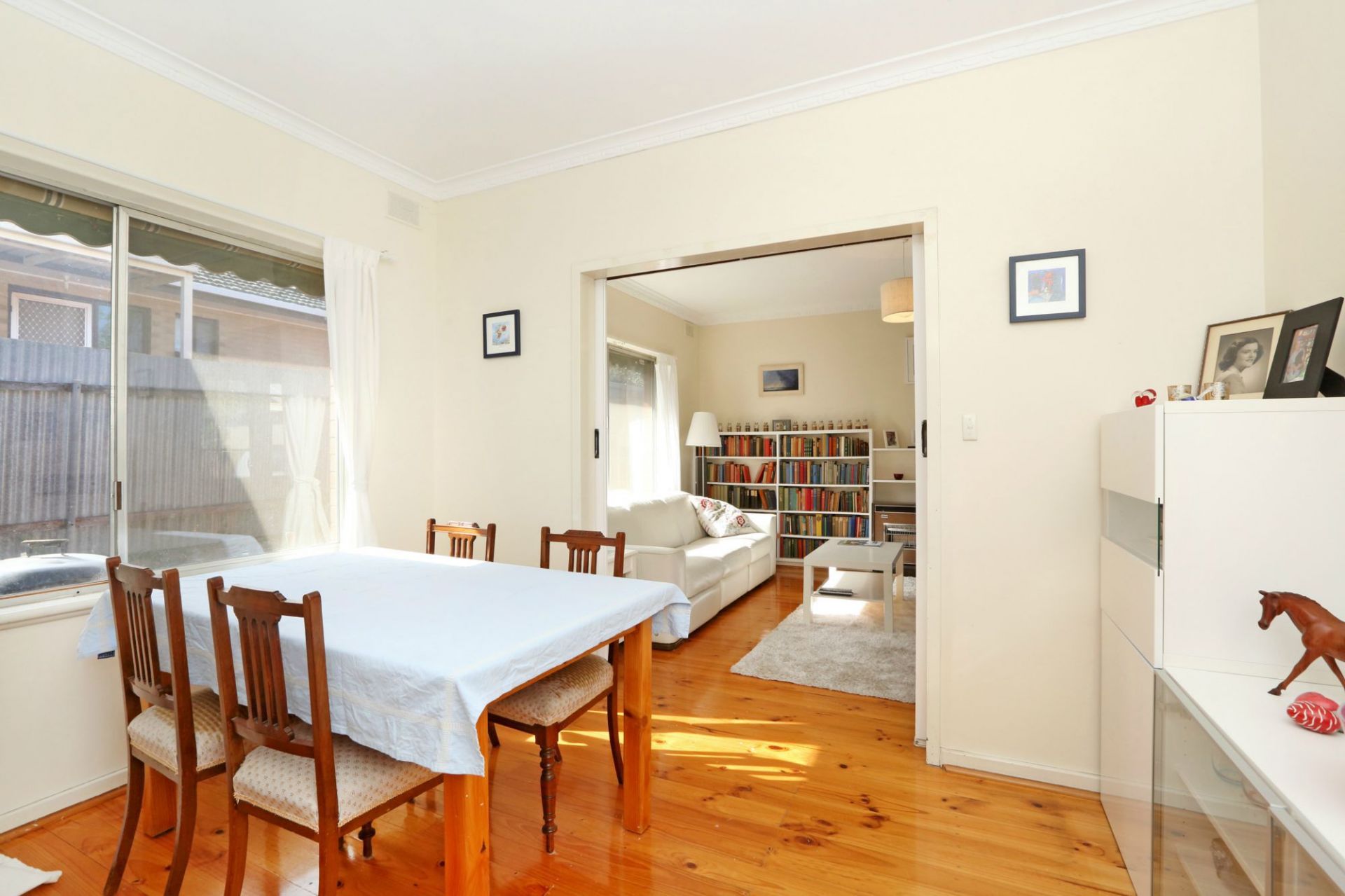 >lounge room with adjacent dining room, both with timber floors and some built in storage.