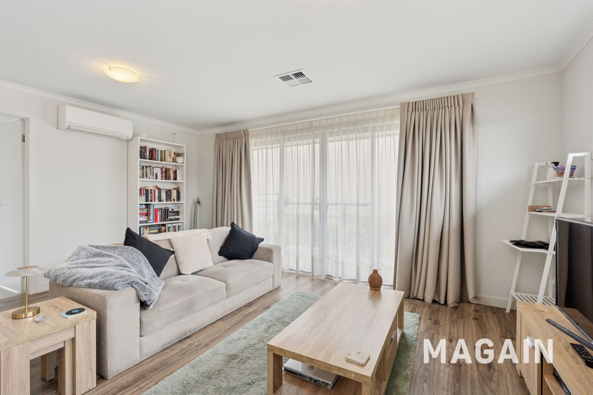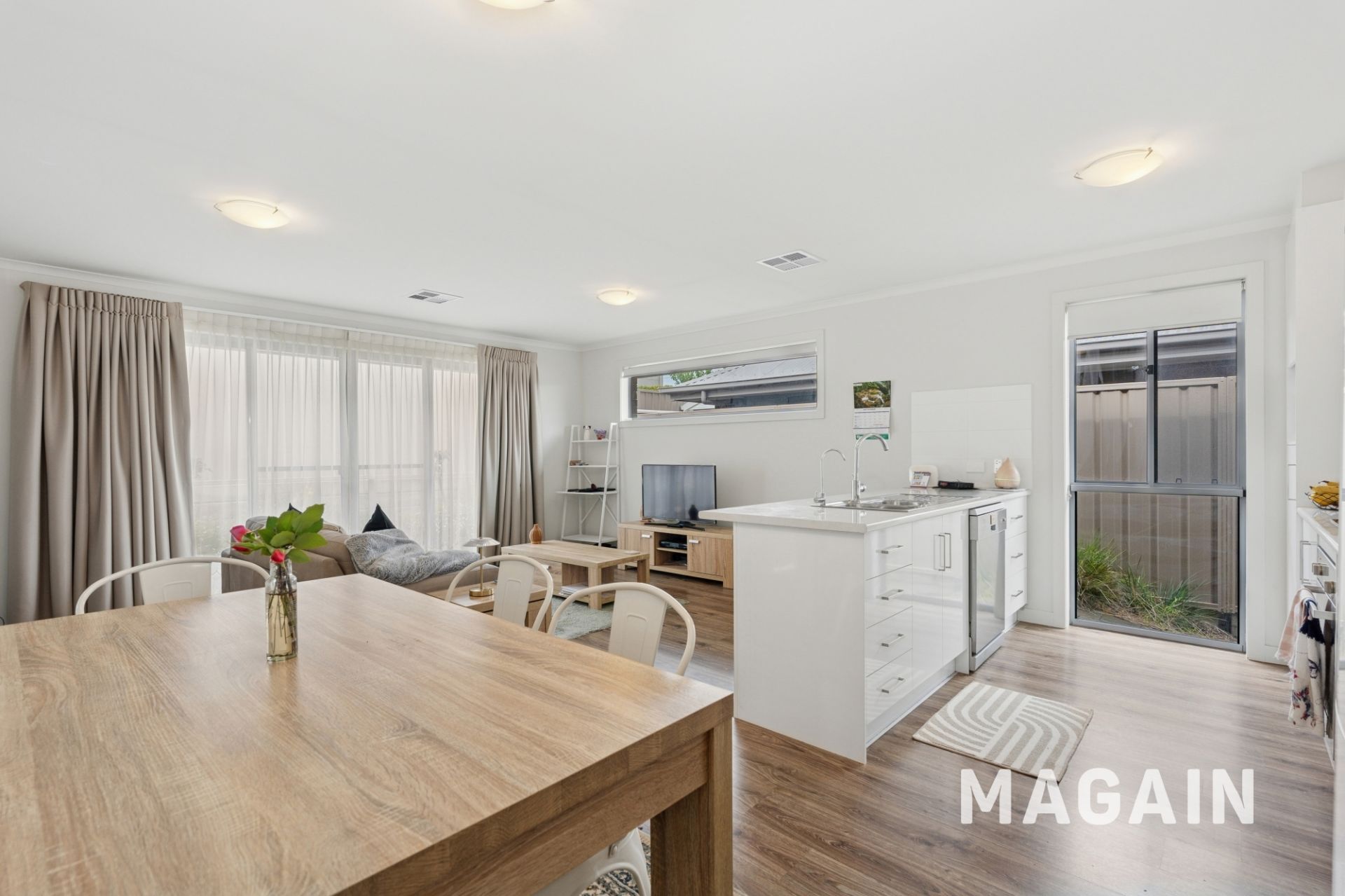 Step inside to discover a light filled open plan layout combining the kitchen, dining, and living area, creating a welcoming hub for everyday living. The kitchen is equipped with ample cupboard and bench space, quality stainless steel appliances, including a dishwasher, and a breakfast bar that doubles as the perfect spot for casual meals or entertaining friends. A split system air conditioning unit ensures year round comfort, while glass sliding doors invite natural light and provide easy access outdoors.