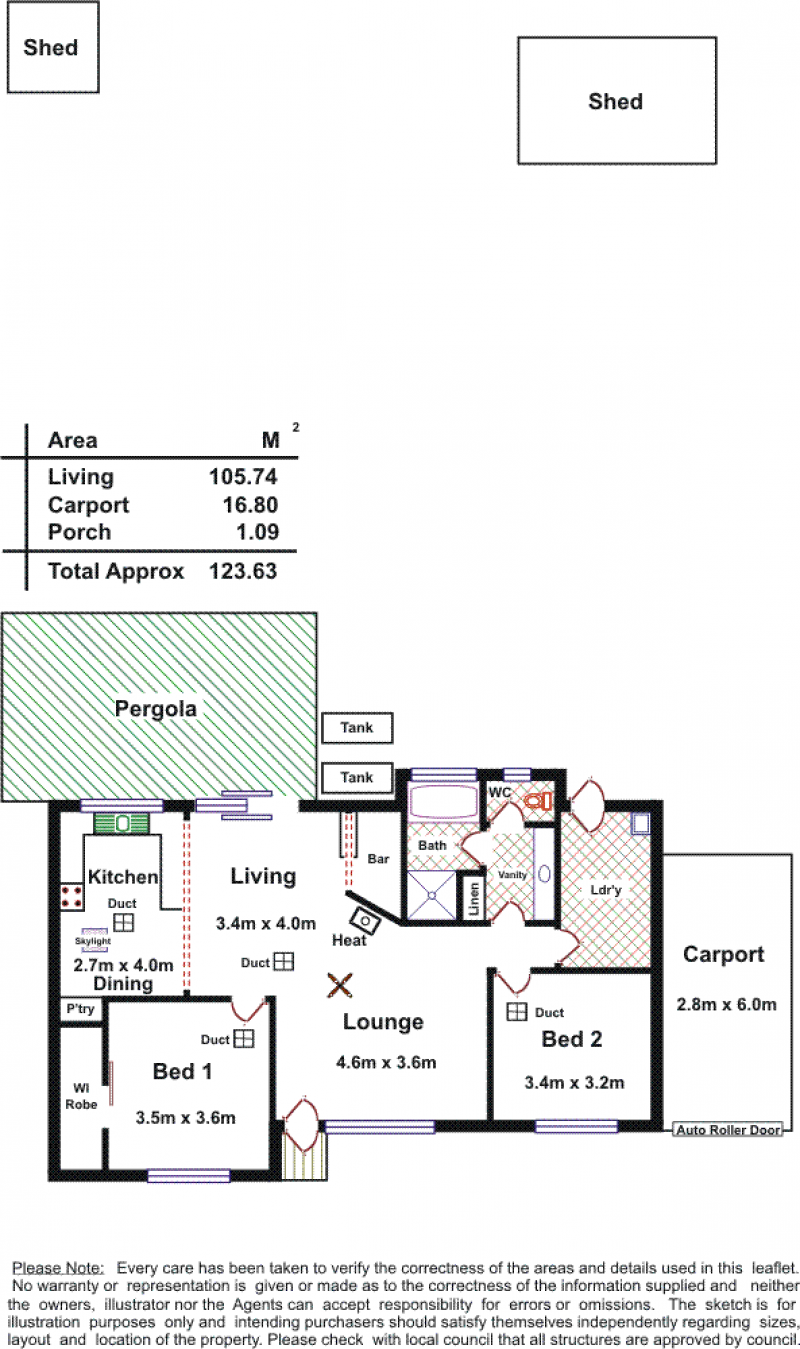 Outside there is a recent addition of an all-weather pergola, complete with cafe blinds perfect for all weather BBQ?s and entertaining family and friends. The hard work in the garden has all been done, it is very neat and low maintenance with areas for vegetables, herbs and flowers plus the bonus of 2 rain water tanks. There's lots of space for children and pets to run around and for the handyman a tool shed. A single carport under the main roof with auto roller door and the front of the home has awnings on all windows including the porch, great for keeping the heat out during Adelaide's hot summers.