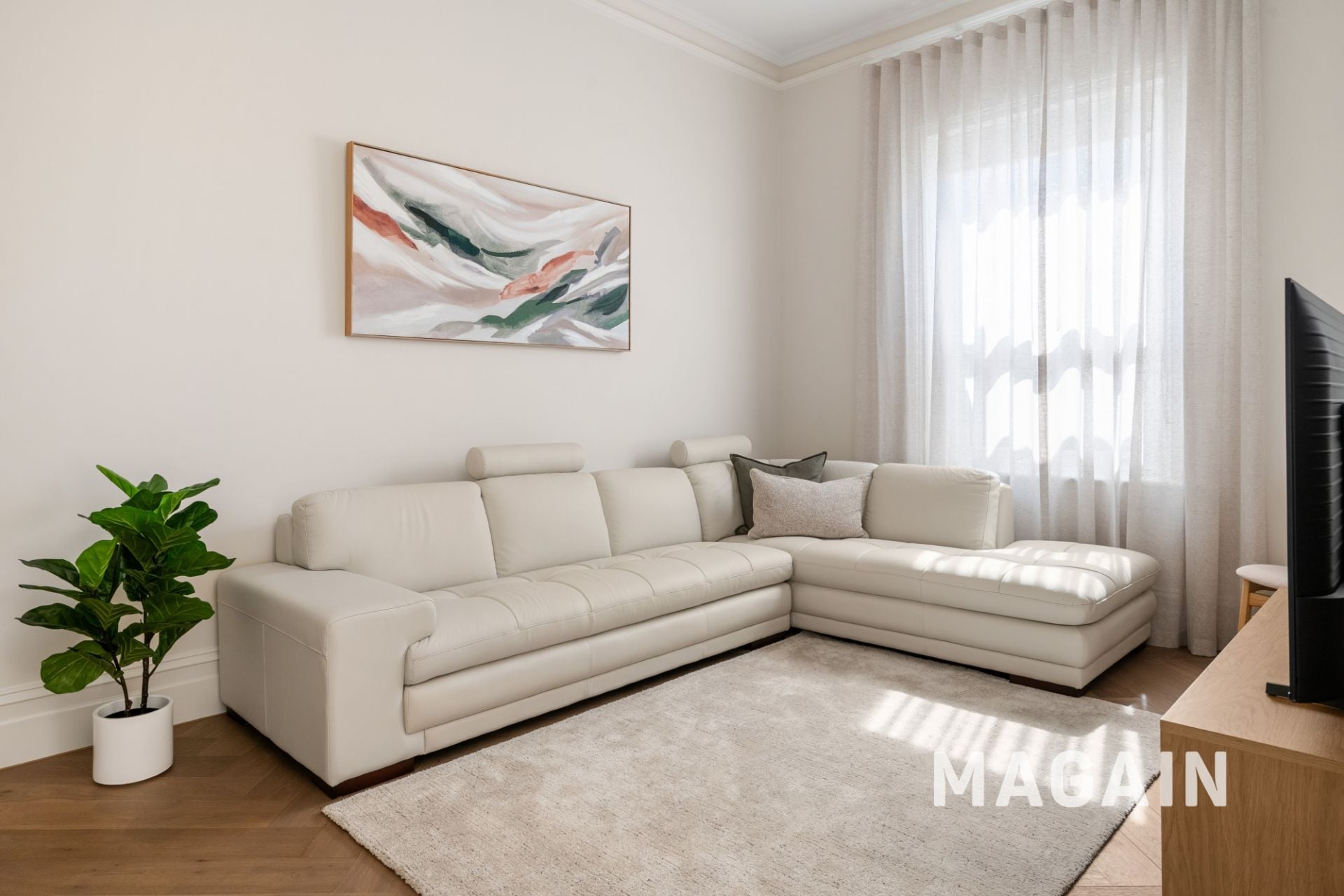 > Large lounge room, fitted with modern furnishings.