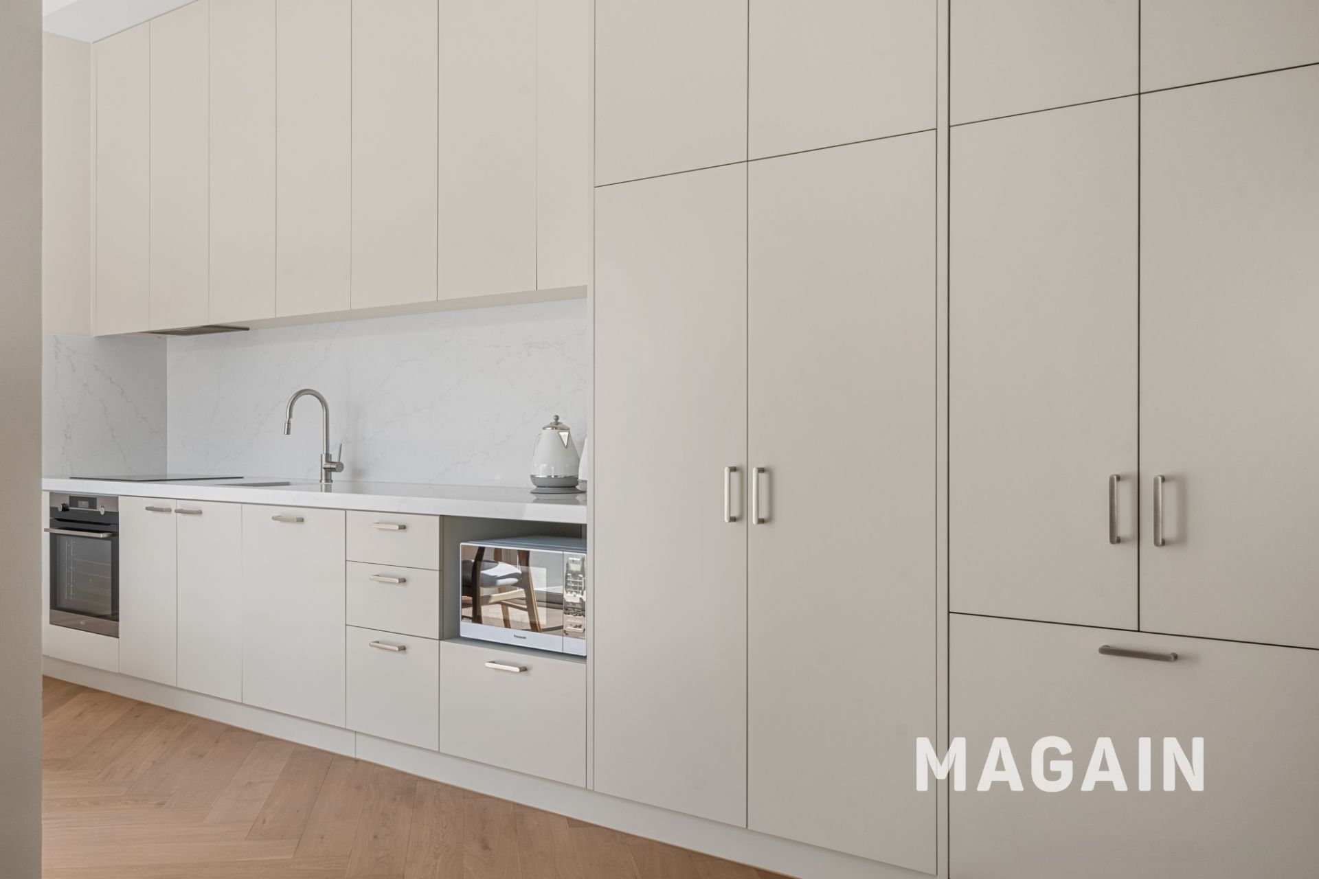 > Sleek, modern kitchen with integrated fridge, integrated dishwasher and electric induction cooking.