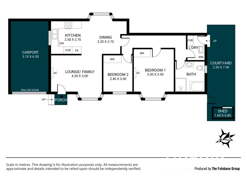 The home features two generously sized bedrooms, both with built-in robes, serviced by a central bathroom and separate laundry for added convenience. Outside, a private courtyard provides a peaceful retreat, while the carport with roller door ensures secure parking.