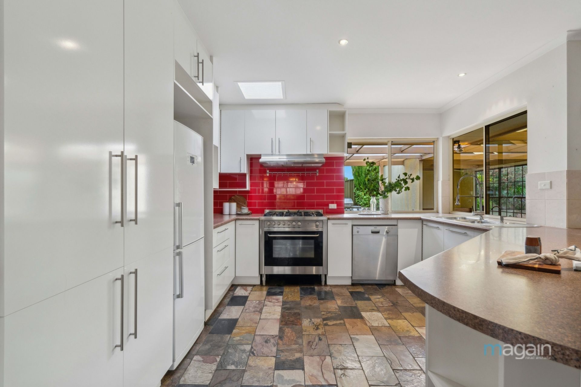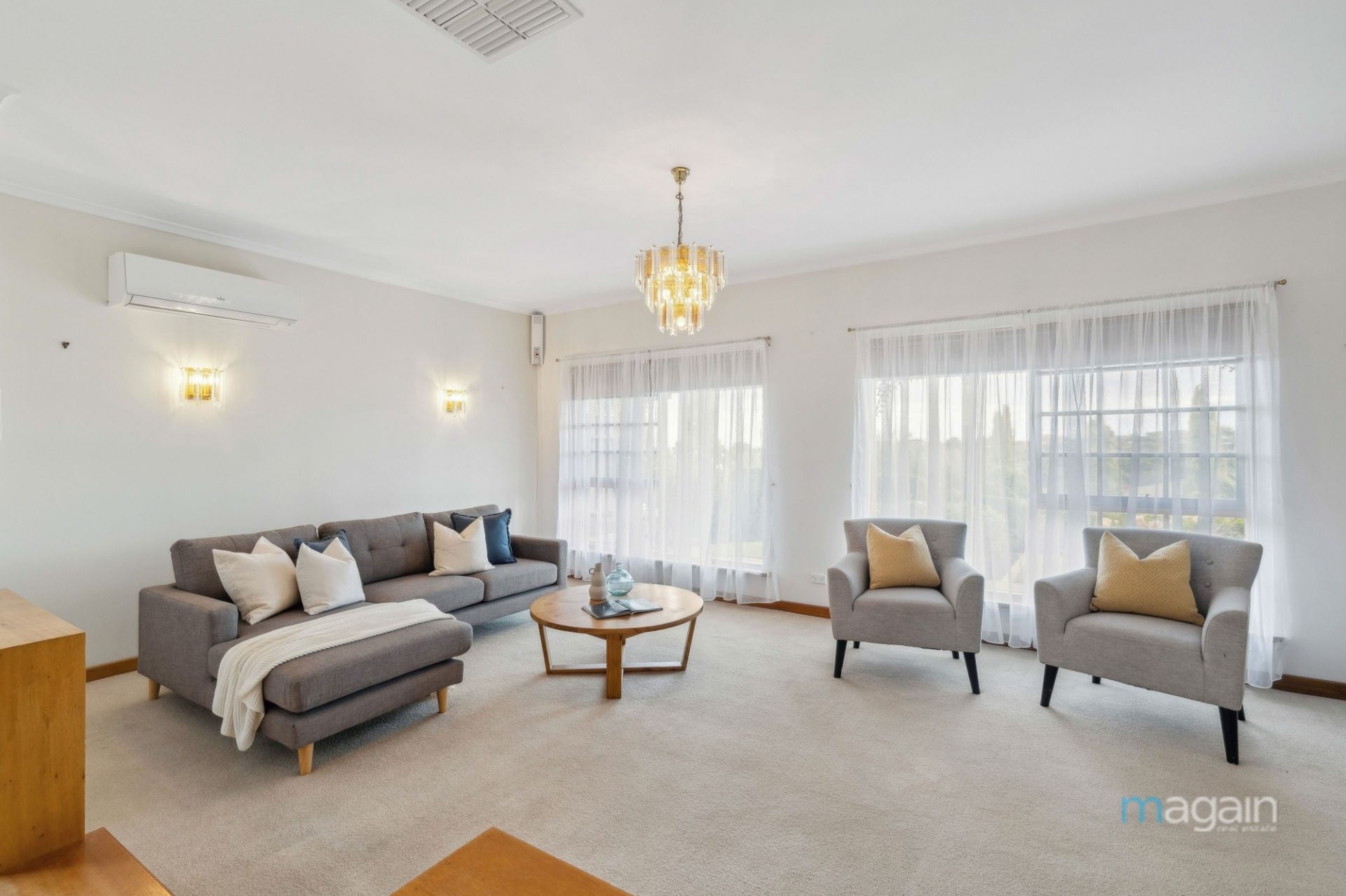Upon entry, you are welcomed by a neat foyer leading to a spacious formal lounge. Ascend a split level to find an adjoining formal dining area seamlessly connected to the elegantly appointed kitchen. This modernized kitchen is a marvel, boasting top-notch appliances including a dishwasher, a 900mm oven, a gas cooktop, and a breakfast bar flowing into a casual dining and family living space.