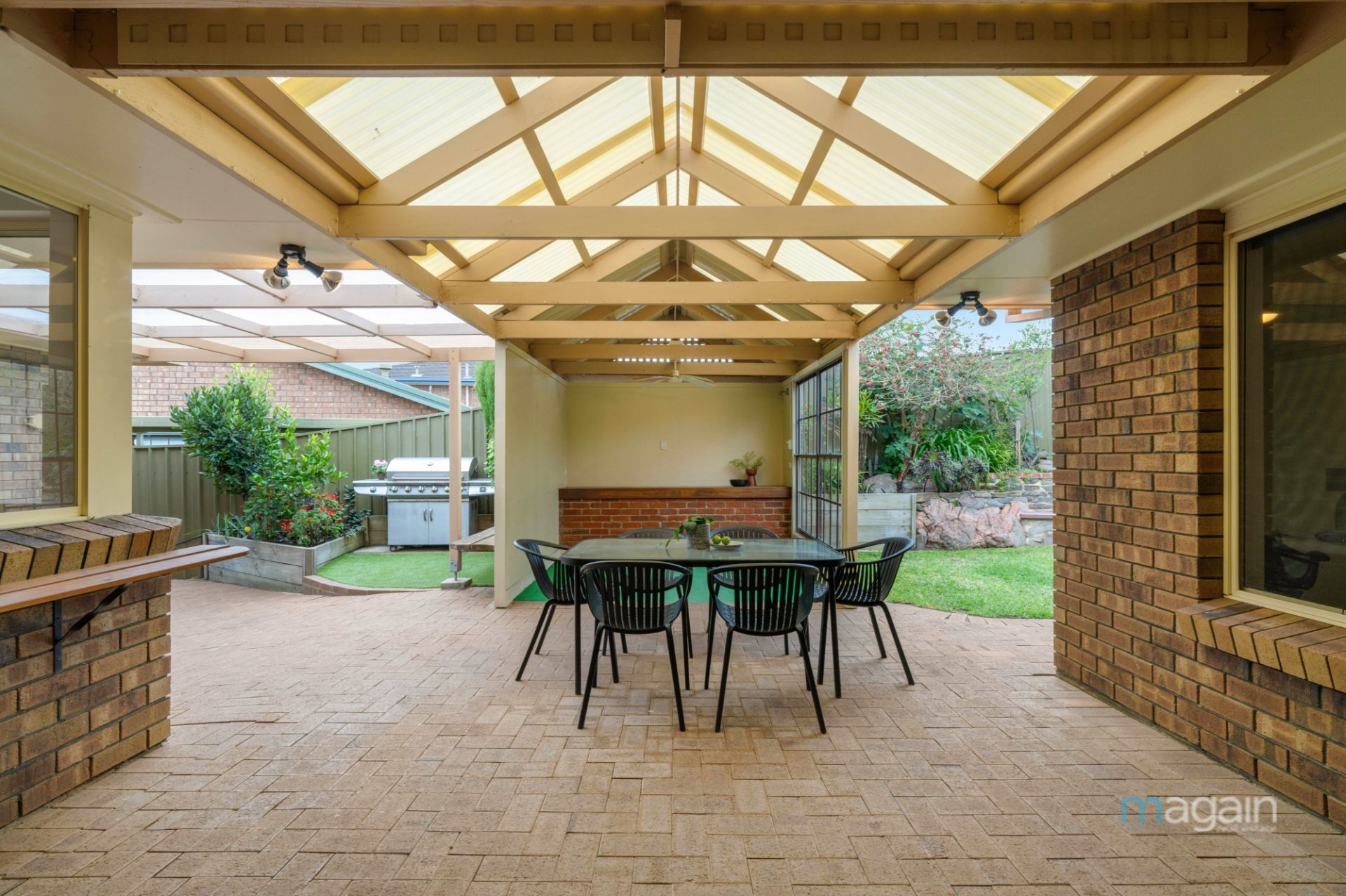 Step outside through glass sliding doors from the central living area to discover an expansive entertainment zone running along the side of the home. This area boasts a pitched roof pergola, perfect for year-round entertaining, along with a sizable grassy area surrounded by meticulously landscaped gardens.
