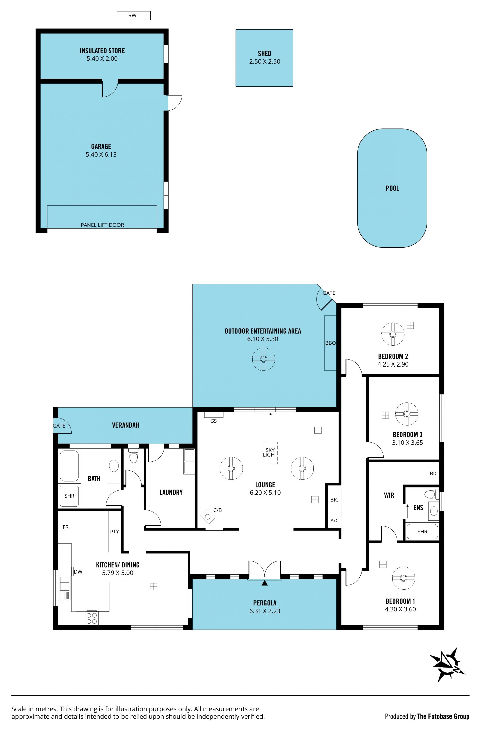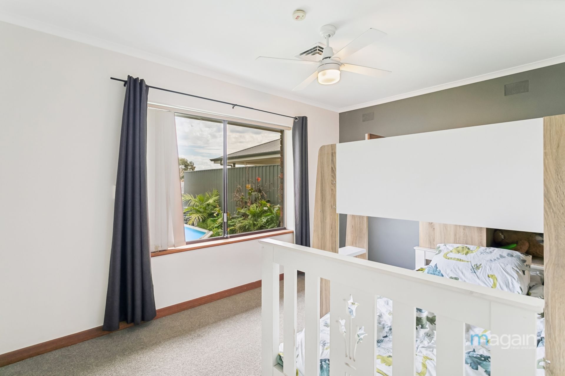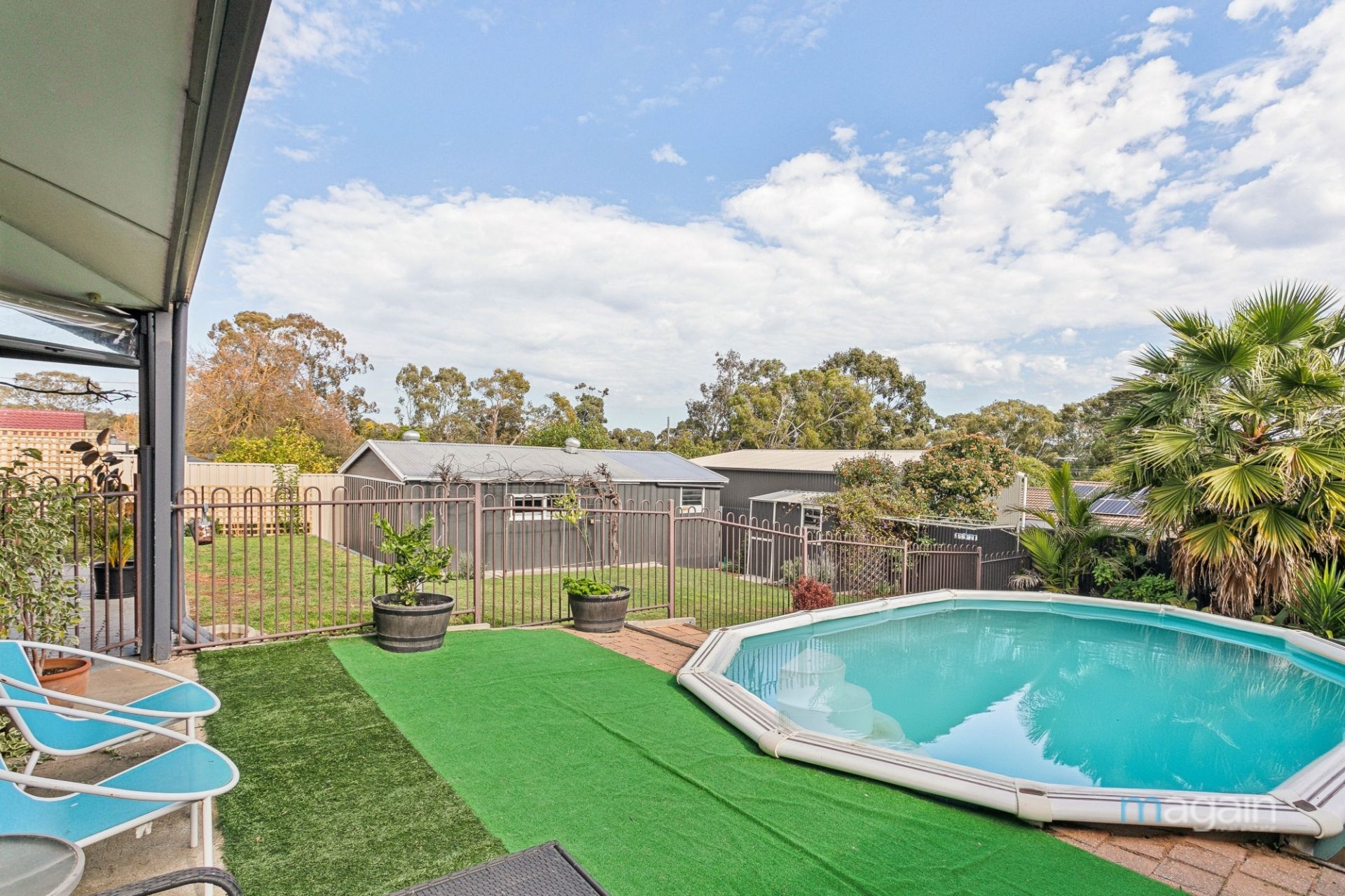 Glass sliding doors from the lounge open seamlessly to a paved outdoor entertaining area covered by a pitched roof pergola, complete with a ceiling fan for year-round enjoyment. Overlooking a meticulously maintained yard, highlighted by a partially above-ground pool and tiered lawn area framed by established trees and garden beds, this outdoor space is perfect for relaxation and gatherings.