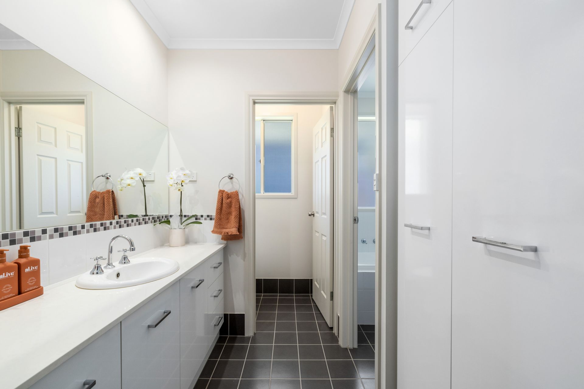 The master bedroom is ideally positioned at the front of the home and is complete with a lovely bay window, a walk-in robe, and a sophisticated ensuite with a stone benchtop, while the double sized bedroom two and bedroom three both with built-in robes, are serviced by the main bathroom, while a linen closet here provides valuable extra storage space.
