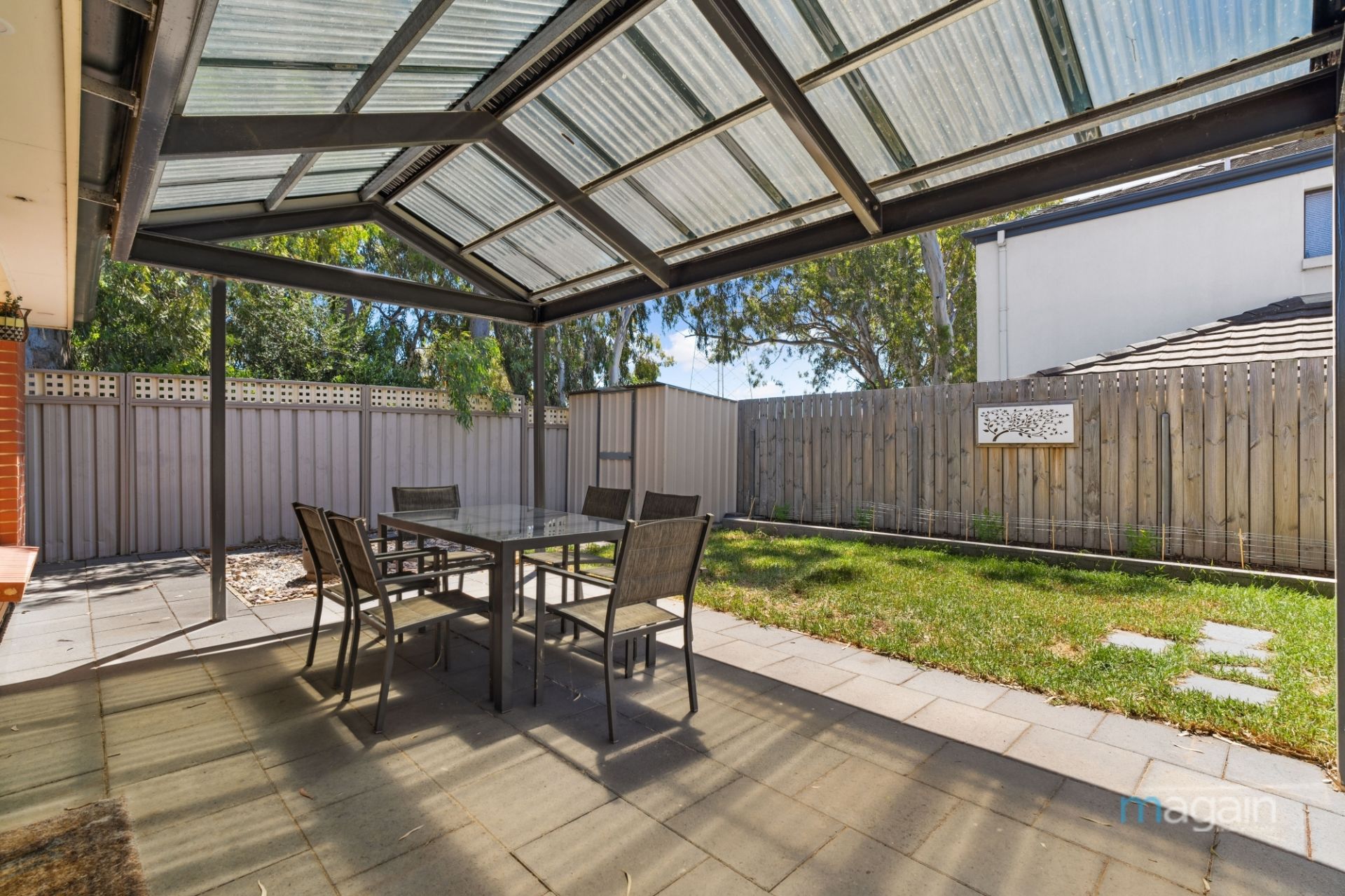 The central living area seamlessly connects to the outdoors through glass sliding doors, leading to a paved entertaining area covered by a pitched roof pergola. The outdoor space extends to a generous lawn area and a practical toolshed, creating a perfect blend of relaxation and utility.