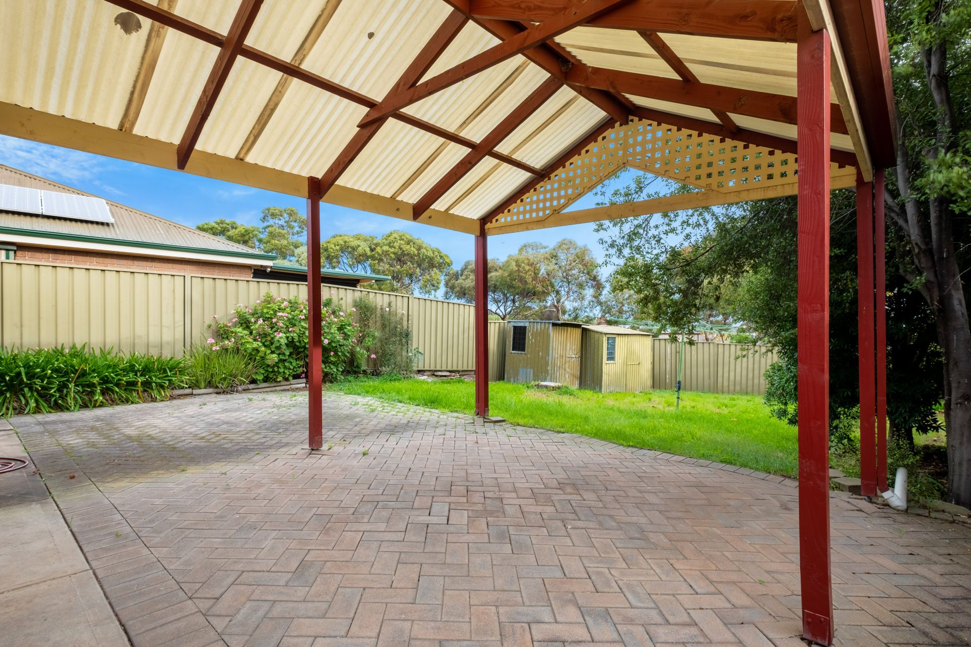> large outdoor paved entertaining area with a gabled pergola overlooking the backyard