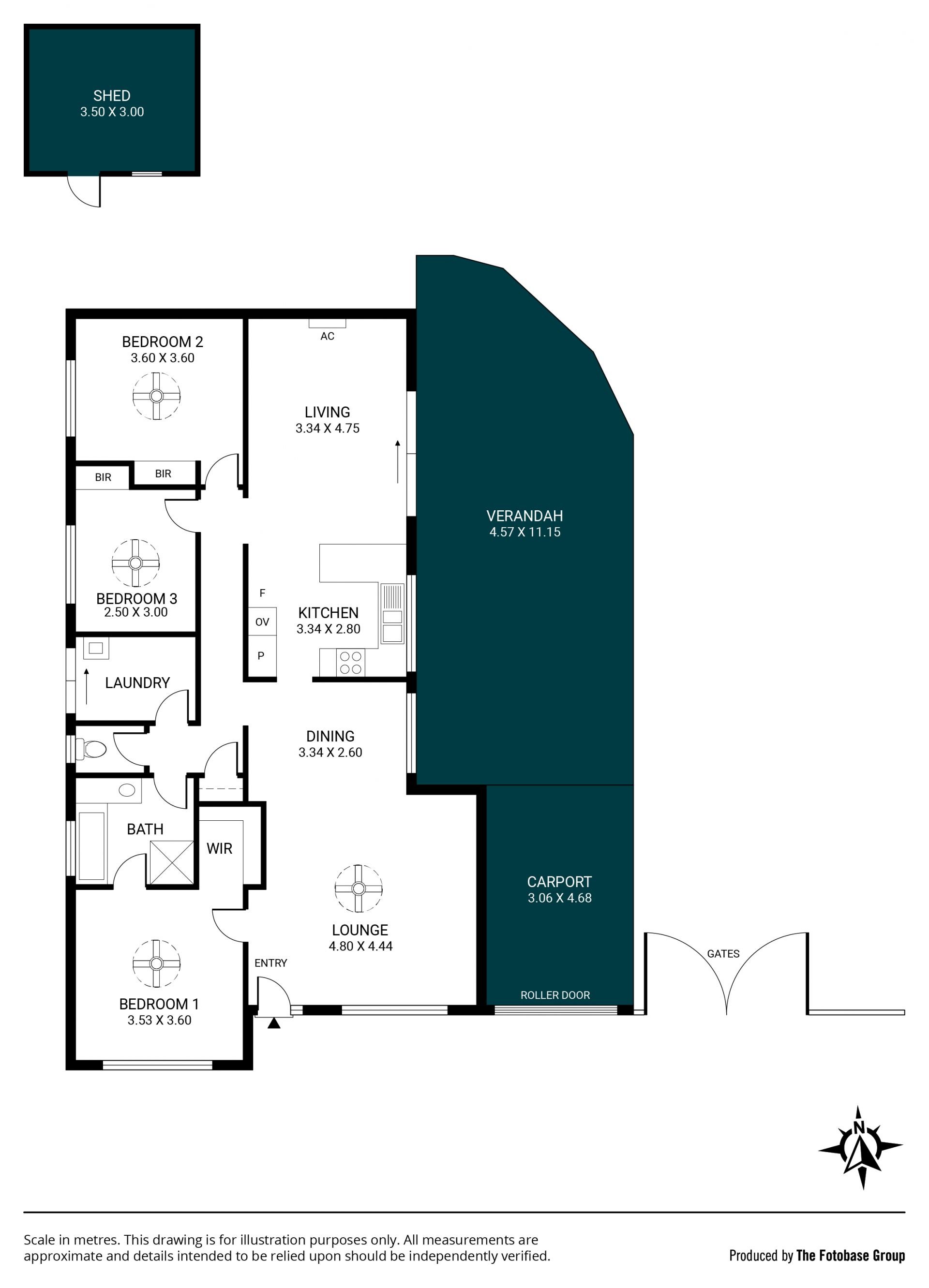 Accommodation includes three bedrooms, with the master bedroom featuring a walk-in robe and direct ensuite-style access to the central bathroom, which includes a separate bath and shower for family convenience. Bedrooms two and three are well-sized, both offering built-in robes and ceiling fans, while the laundry provides external access and completes the floorplan.