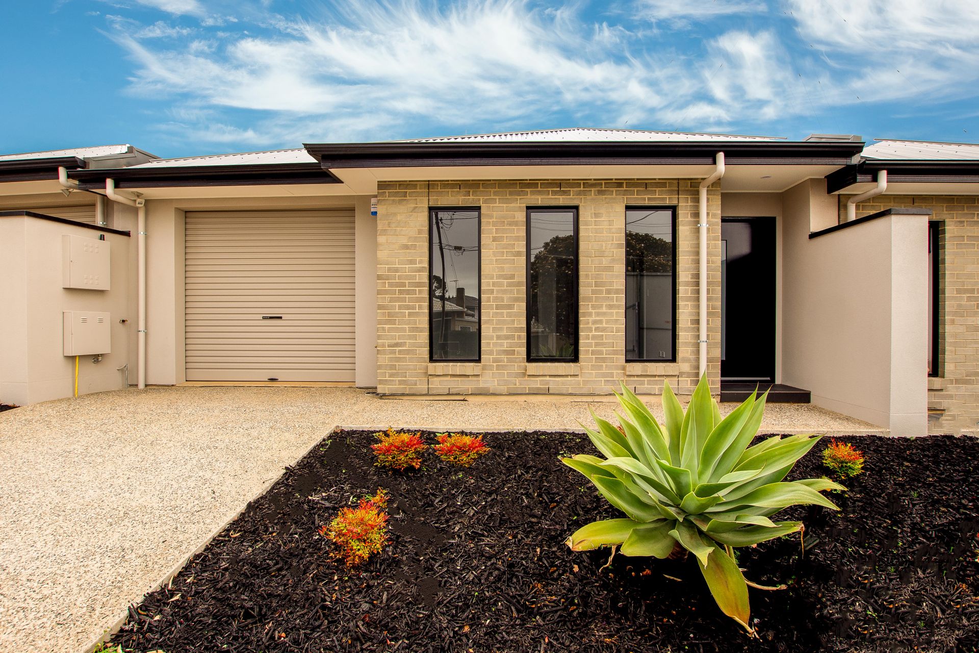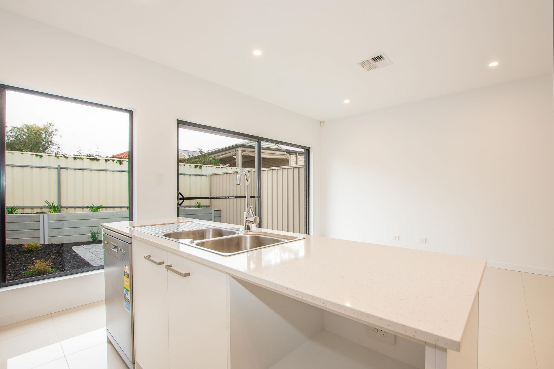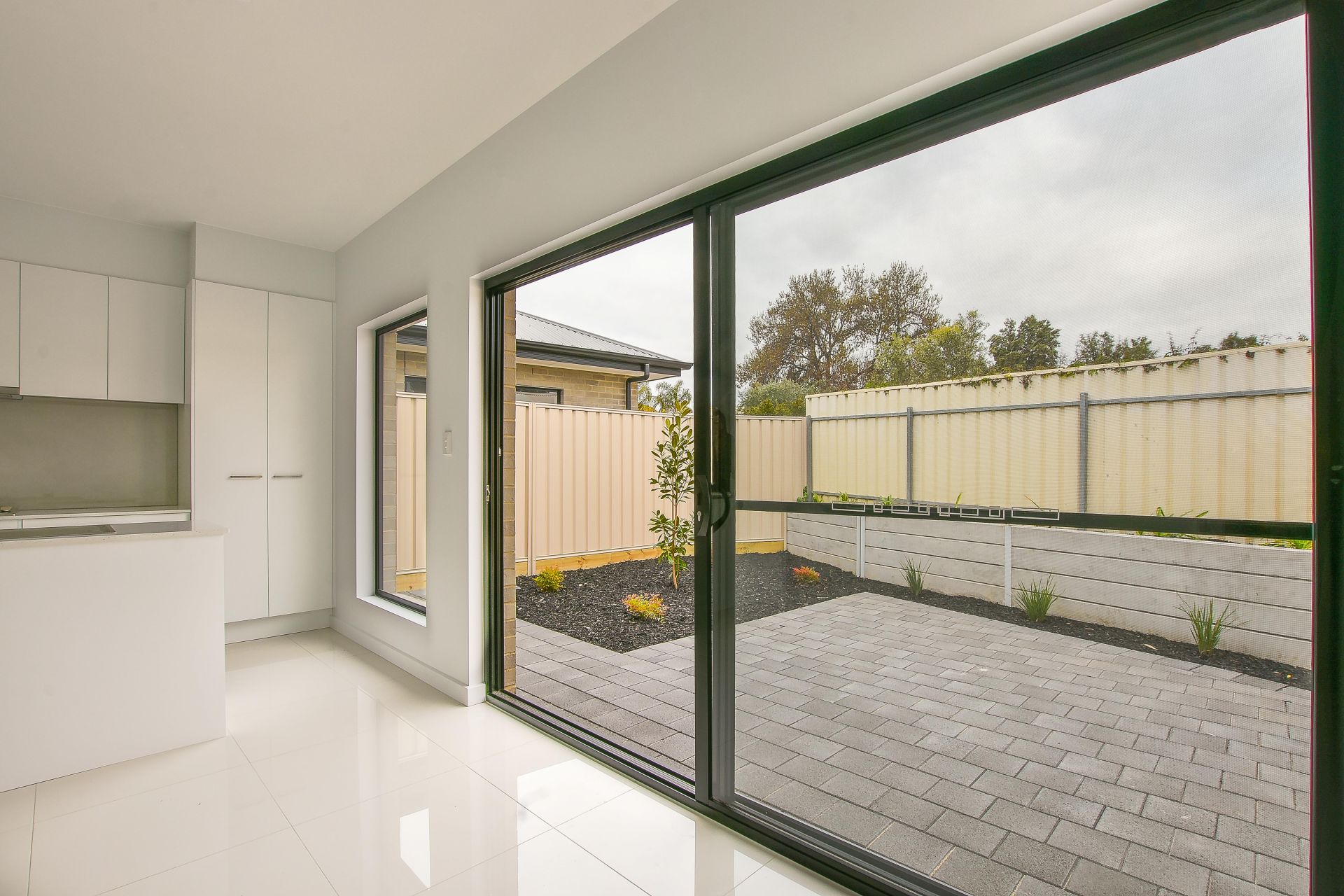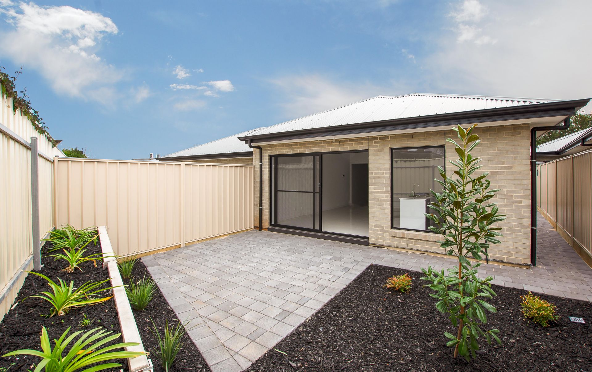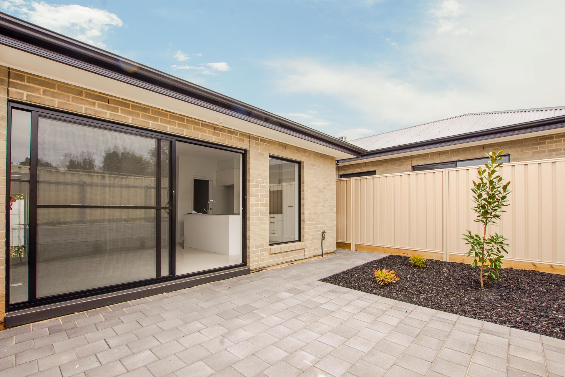 At the heart of the home is an open plan living area. Complete with walk in pantry this kitchen offers plenty of storage. A seamless living and dining area creates an intimate space for family and friends to enjoy. You can easily transition inside entertaining to outside entertaining with the large sliding door. As you step outside this home offers a beautifully landscaped courtyard home, continuing the black bark theme, the native green plants add a pop of colour and the paved areas are a great spot to sit back after a long day and enjoy your new home.