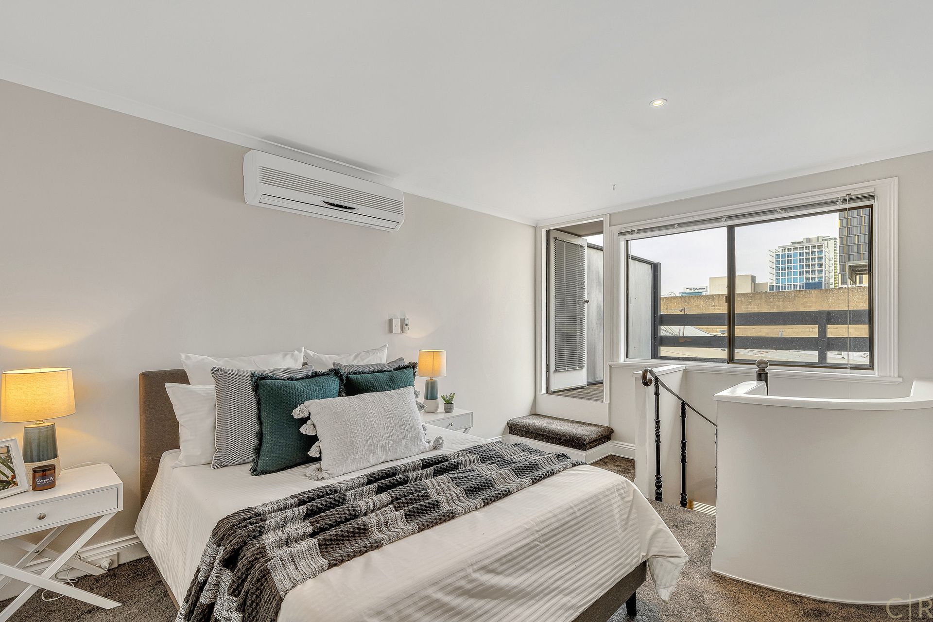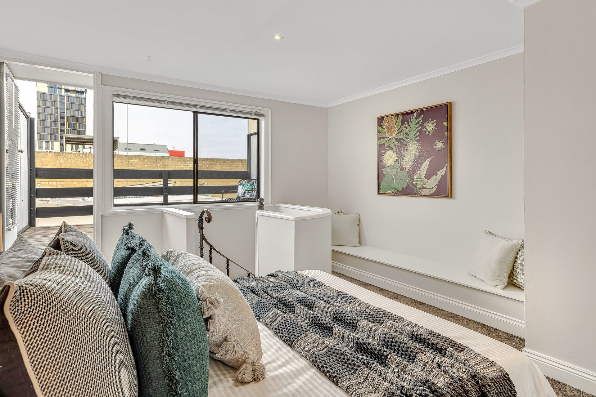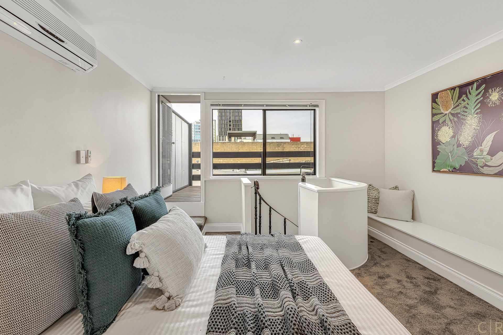 The elegant spiral staircase links to a spacious upstairs bedroom or loungeroom with its own private balcony where you can enjoy a morning coffee or evening champagne, while overlooking sunrise or the glowing city lights. With a small ensuite bathroom and plenty of storage space thanks to the built in robes and additional secret 'Chronicles of Narnia' like closet/ storage, this second level provides ultimate flexibility in use and enjoyment.