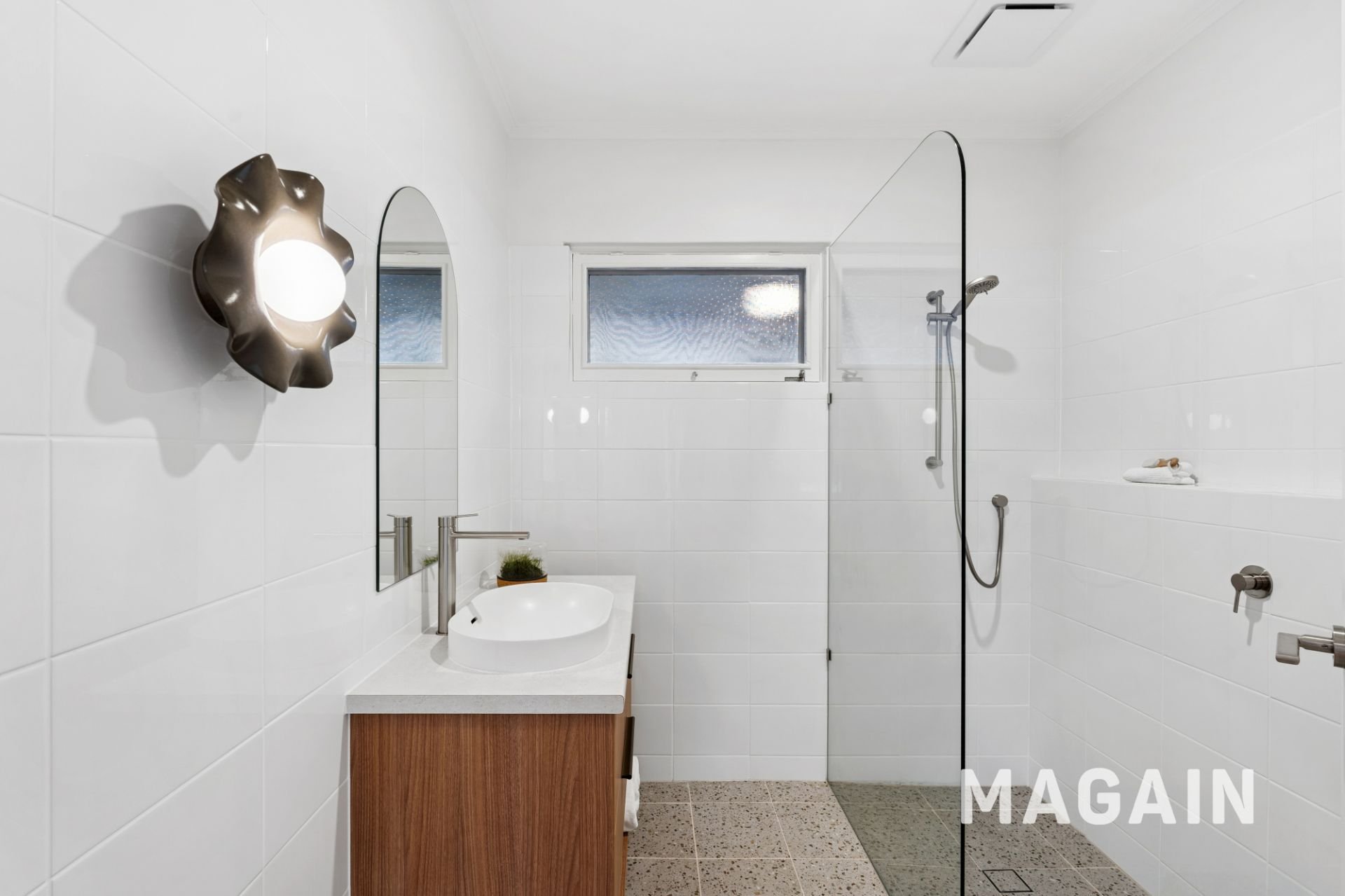 Back inside, both bedrooms are good sized with ceiling fans, the master with large built in. The updated bathroom is more than you would expect, lux is a word that springs to mind with classic terrazzo floor tiles and feature wall sconce.