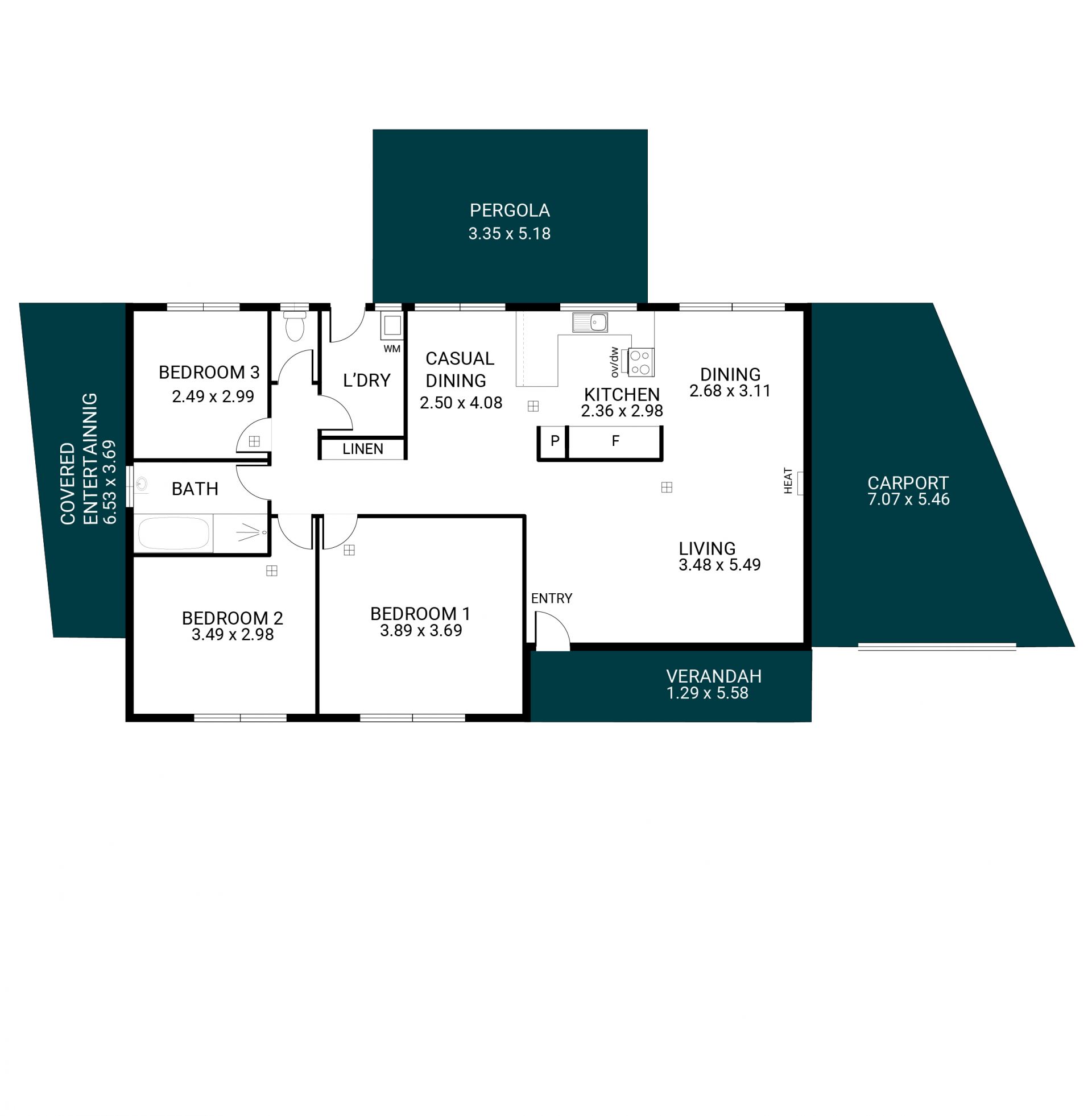 The three bedrooms are well-proportioned, with bedroom one featuring a ceiling fan for added comfort. A central bathroom with separate toilet services the home with ease, while the adjacent laundry includes external access and ample linen storage.