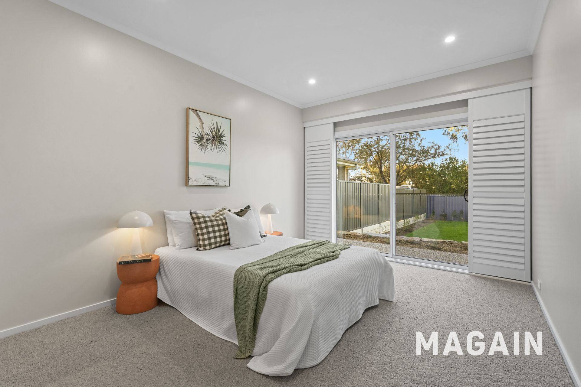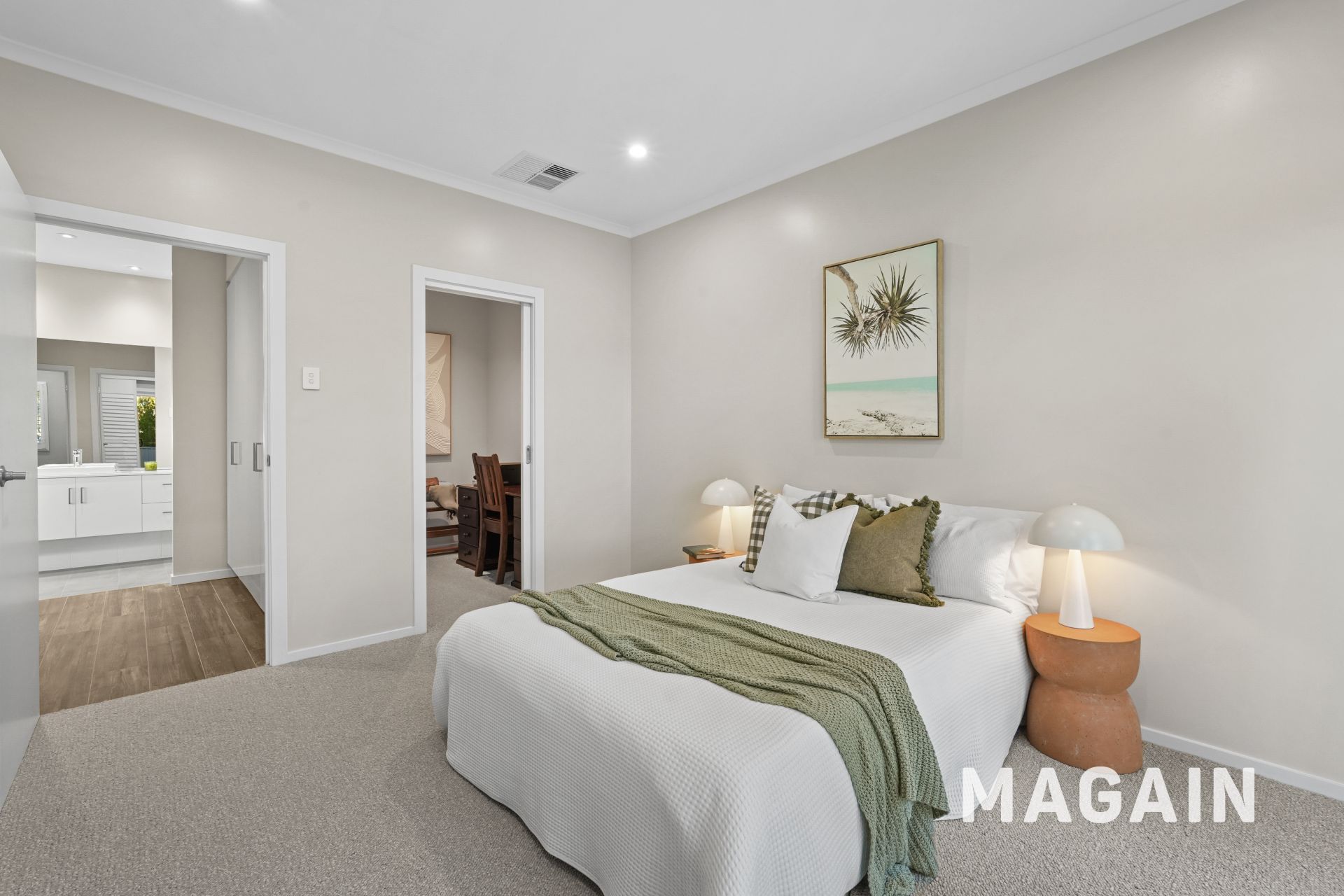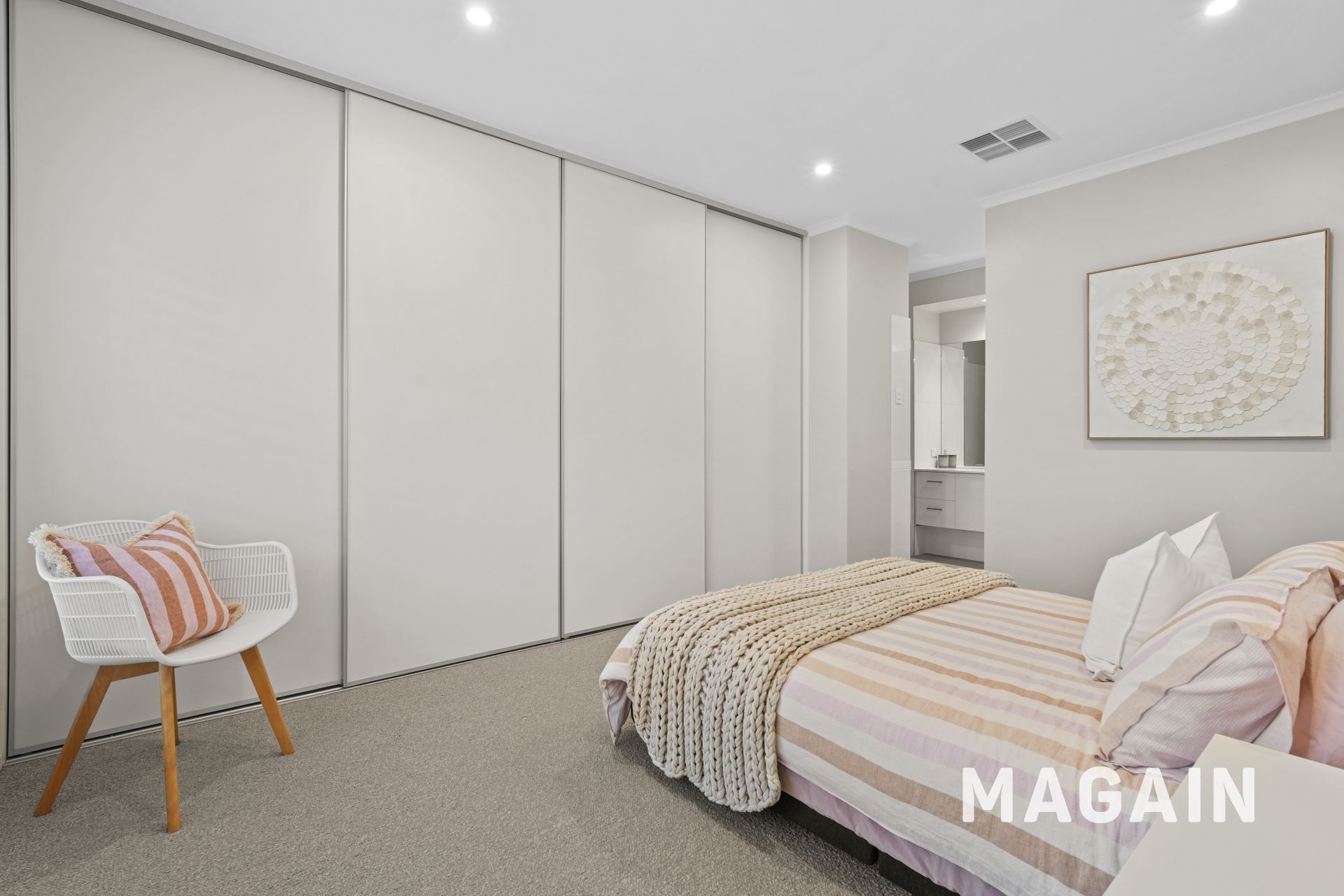 The master bedroom is a luxurious retreat, featuring a generous picture window, plush carpeting, a full wall of built-in robes, and a spacious, beautifully appointed ensuite.
