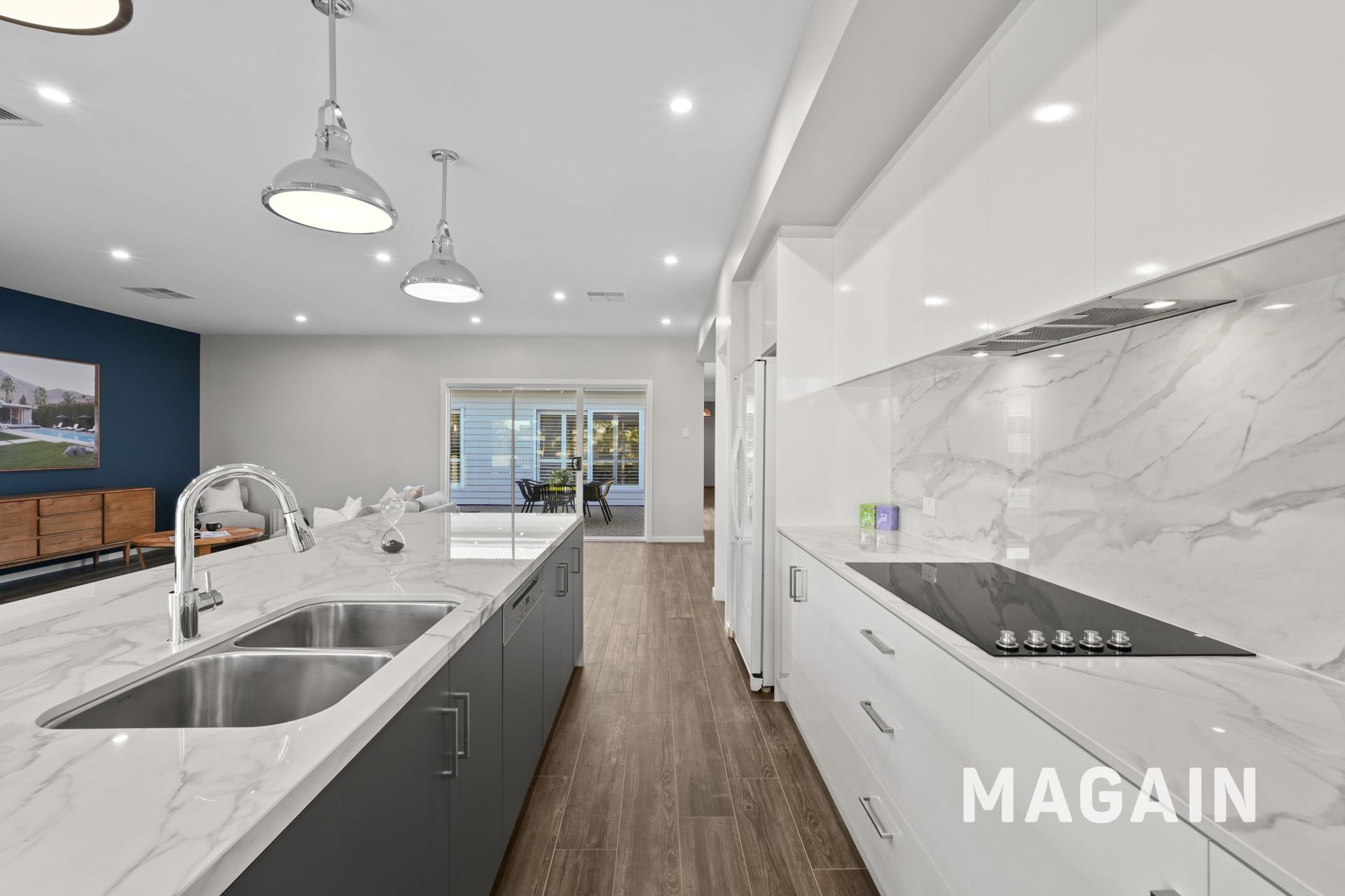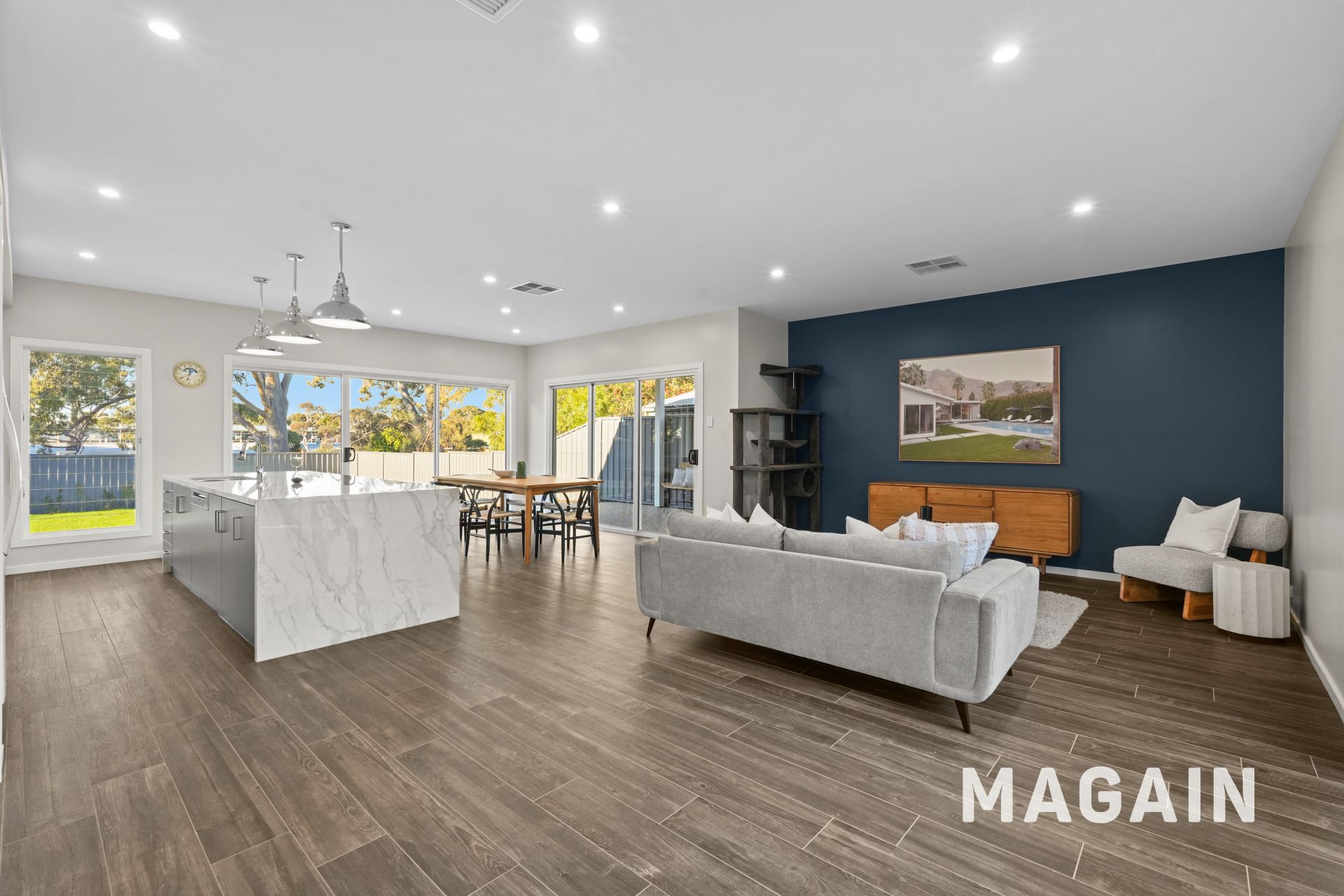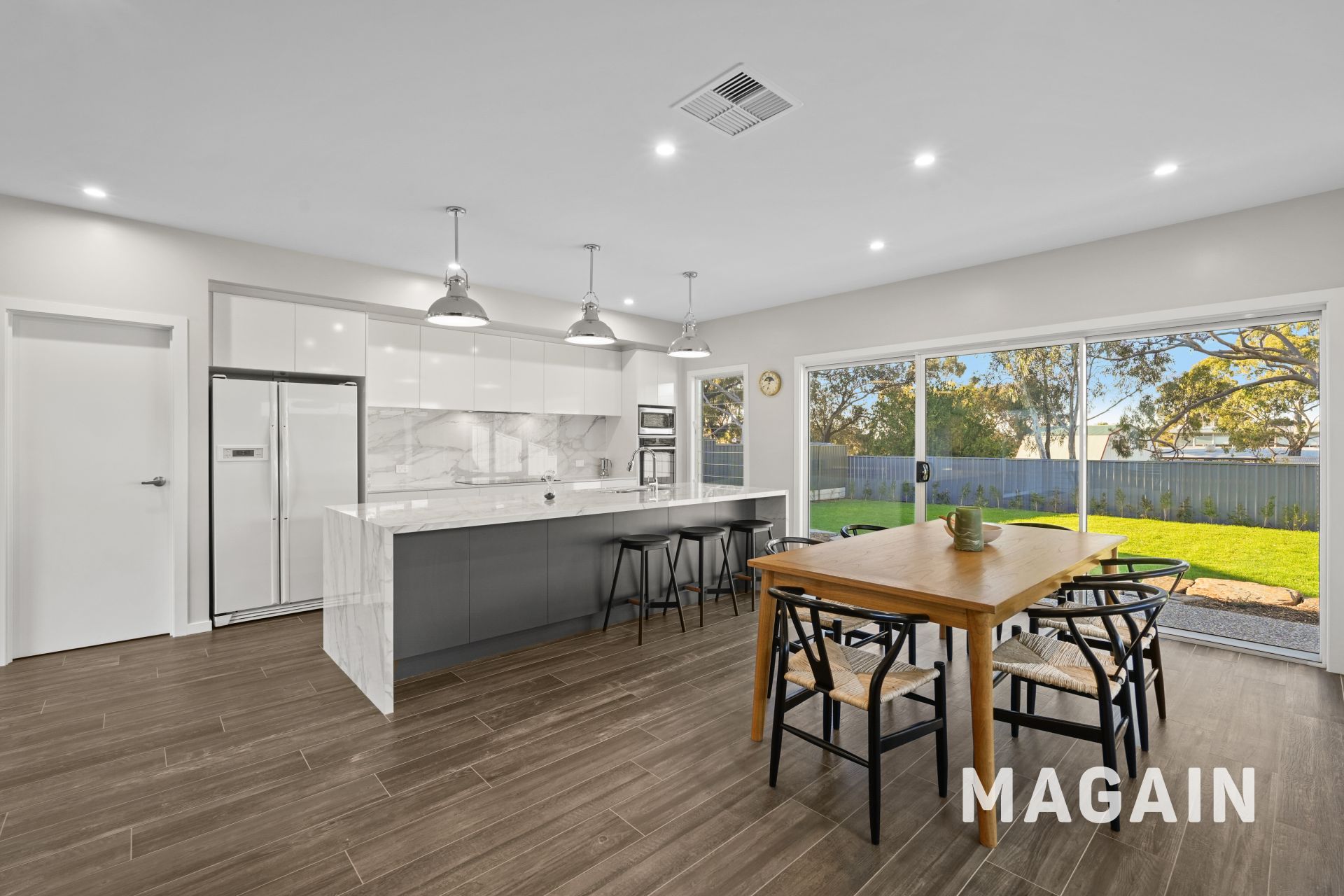 The open-plan kitchen, living, and dining zone forms the true heart of the home, delivering effortless flow and a seamless connection to the outdoors. The contemporary kitchen features sleek styling, abundant cabinetry, generous bench space, and excellent storage. Quality appliances, including a 5-burner electric cooktop with rangehood, oven, and dishwasher, ensure easy meal prep and cleanup. A walk-in pantry, dedicated fridge and microwave recesses, double sink, and a breakfast/serving bench with a waterfall benchtop add both practicality and style, making this a dream space for home cooks. The spacious dining and living area easily accommodates gatherings of family and friends, while glass sliding doors open directly to the outdoor areas, creating an entertainer's haven.