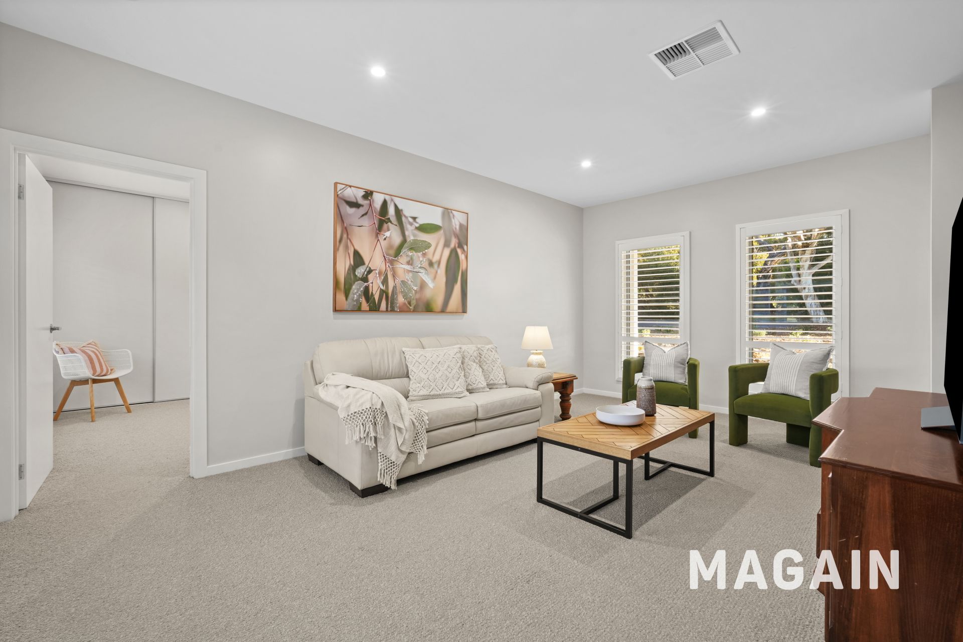 As you step inside, high ceilings and neutral flooring set a timeless, versatile backdrop perfect for any interior style. To the right of the foyer, a charming front-facing lounge features expansive picture windows that bathe the room in natural light. Flowing seamlessly into the master suite, this area offers the ideal opportunity to create a dedicated parental wing, a peaceful, private retreat from the bustle of everyday life.