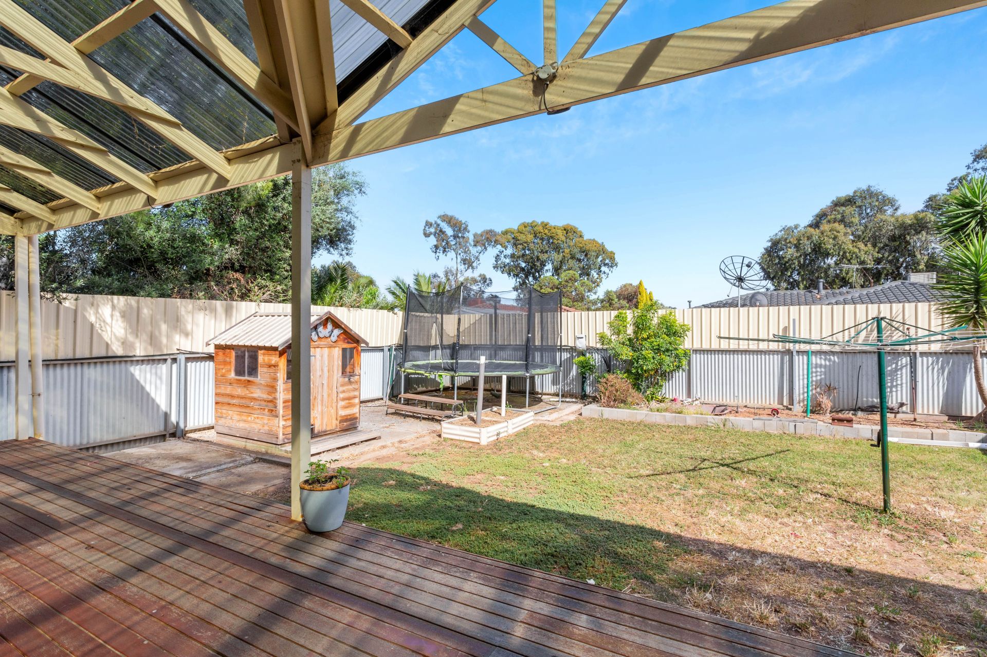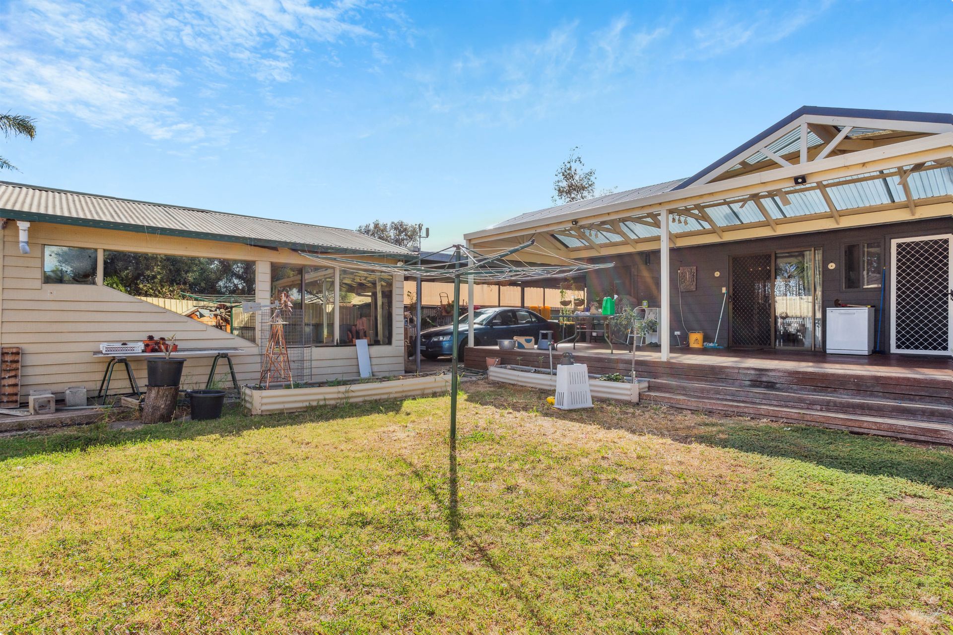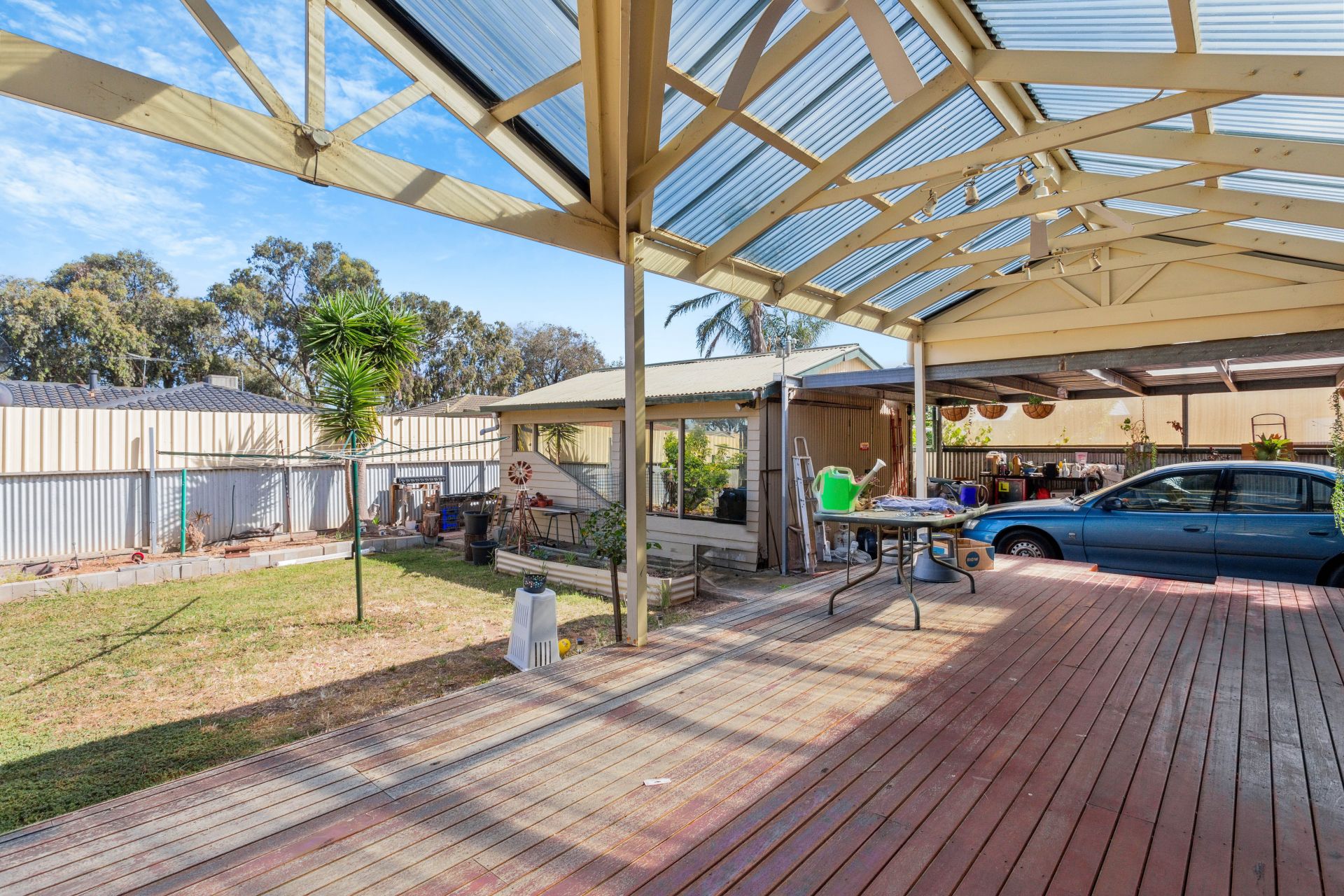 Sliding doors from the informal dining area will lead you to a large outdoor deck area, covered by a pitched roof pergola. This outdoor space is an ideal setting for hosting gatherings or simply enjoying some fresh air. Beyond this entertainment area, you'll find a spacious grassy area and a rear garage with drive-through access from the front carport, offering additional storage or utility space.