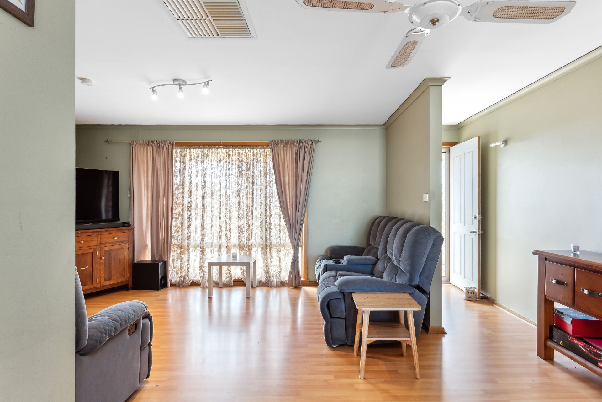 Moving deeper into the house, a hallway on the left side of the entrance leads to three bedrooms. All of these bedrooms are equipped with built-in wardrobes and ceiling fans, providing ample storage and comfort. Convenient access to the main bathroom is available from these bedrooms, with the toilet located just off the laundry area. Additionally, a linen cupboard in the hallway offers extra storage.