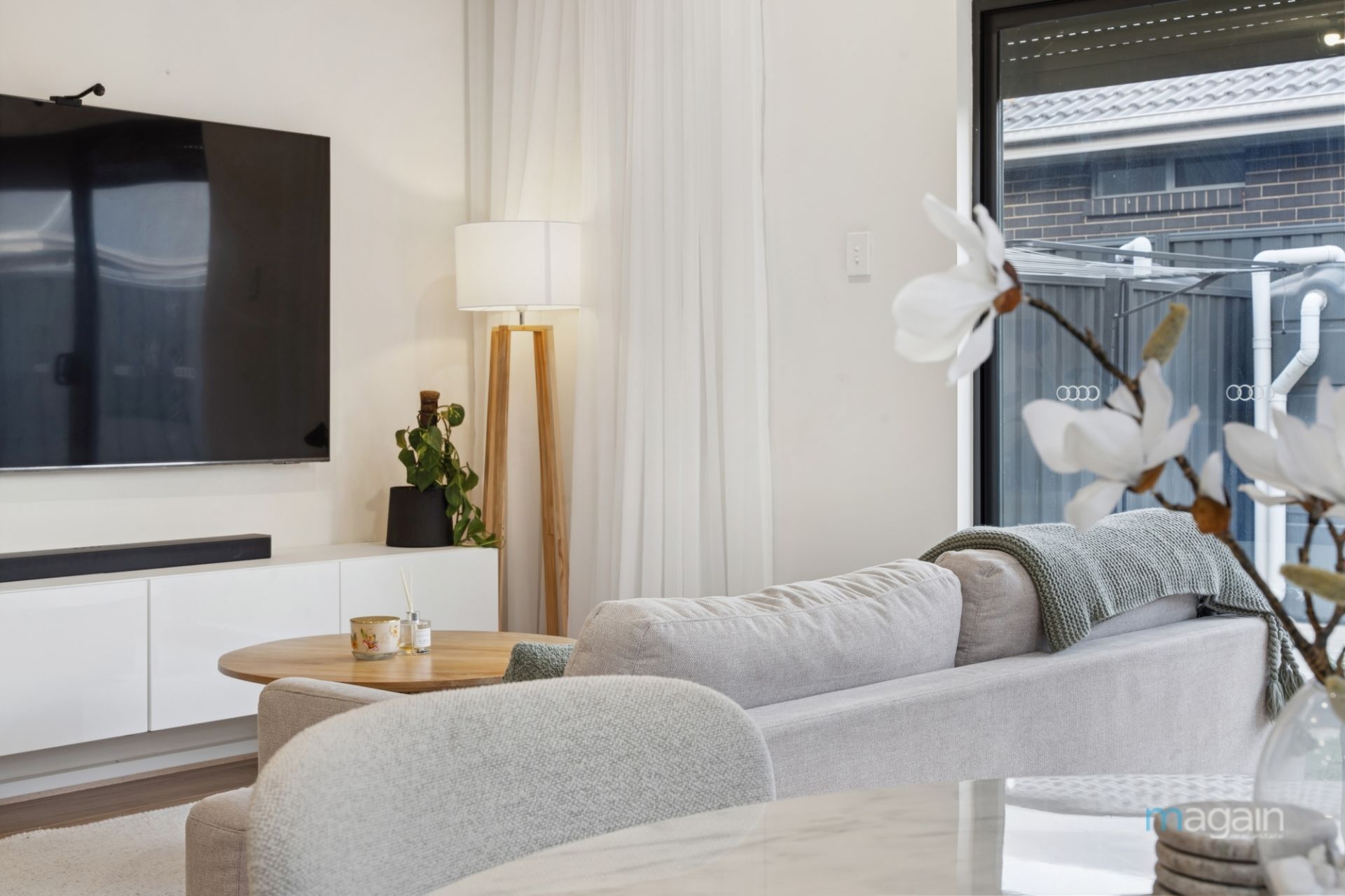 The heart of the home is a spacious open-plan living and dining zone, enhanced by quality timber flooring and ambient downlighting. At its centre, the modern designer kitchen boasts stone benchtops, glossy cabinetry, and premium appliances, perfectly suited for entertaining or everyday ease.