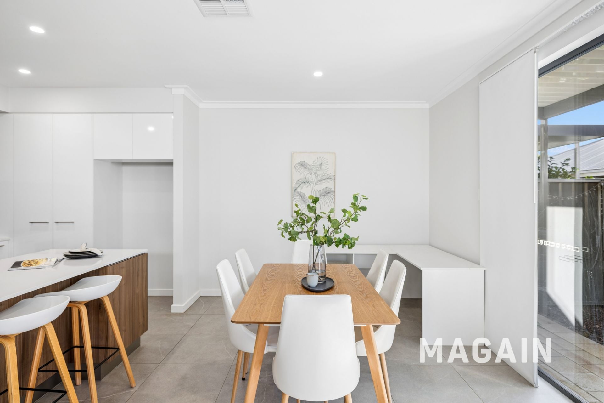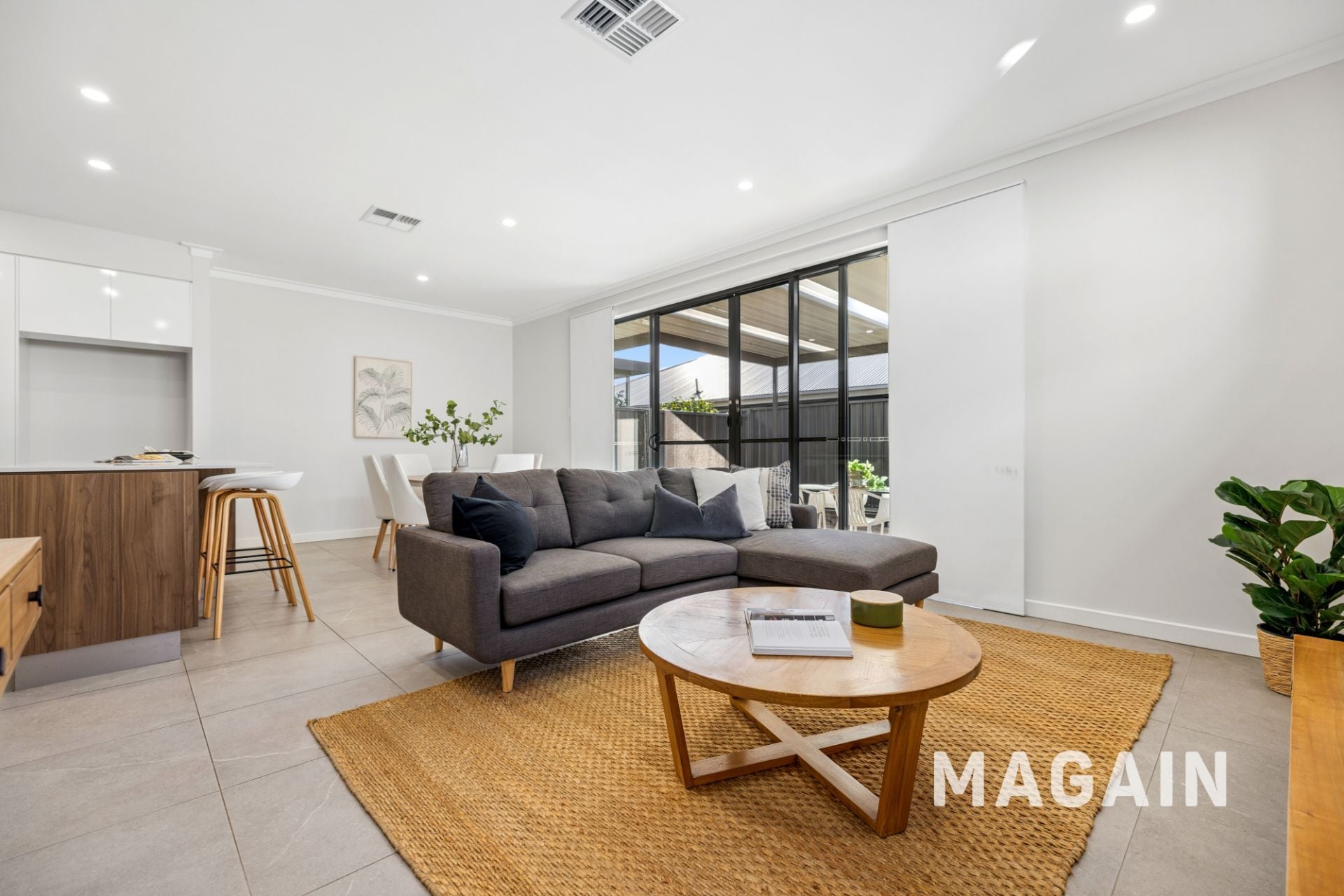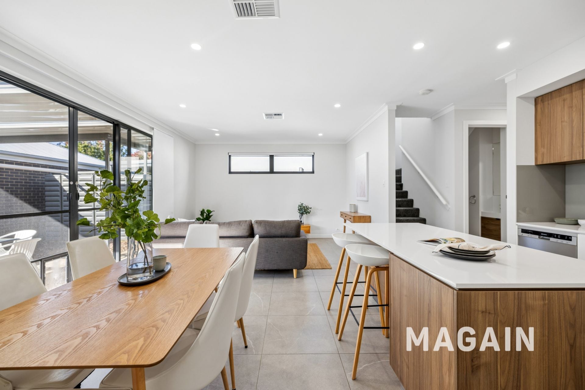 Step inside and a short hallway opens into an impressive open-plan living, kitchen, and dining area, filled with natural light from large picture windows and wide sliding glass doors. The space feels bright and serene, ideal for both relaxed living and entertaining, with neutral tiled flooring that complements any style of décor. Whether you're unwinding after a long day, sharing a home-cooked meal with family, or cooking up a storm in the kitchen, this versatile zone caters to it all with ease.