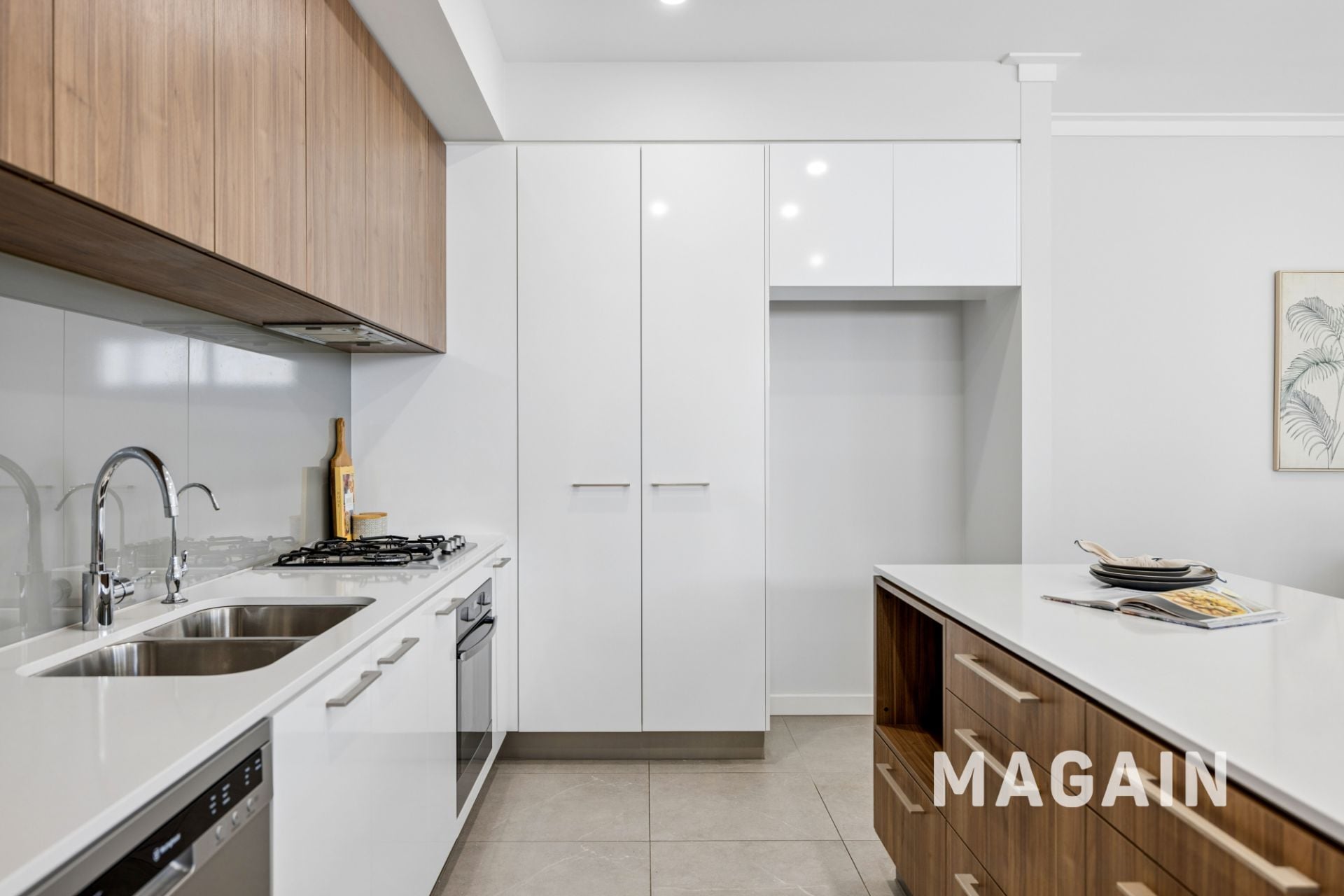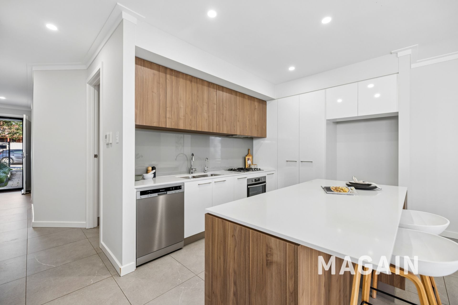 Thoughtfully designed for both style and practicality, the kitchen features a sleek contemporary layout with a harmonious blend of white and timber-style cabinetry, complemented by neutral benchtops for a clean, versatile look. Quality stainless-steel appliances, including a 4-burner gas cooktop with rangehood, oven, and dishwasher, make cooking and cleanup effortless. Additional features include a spacious pantry, dedicated fridge and microwave alcoves, a double sink with PuraTap, and a breakfast or serving bench ideal for casual dining and easy entertaining.